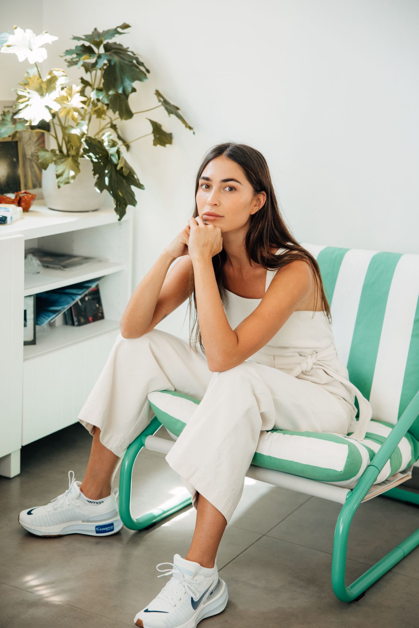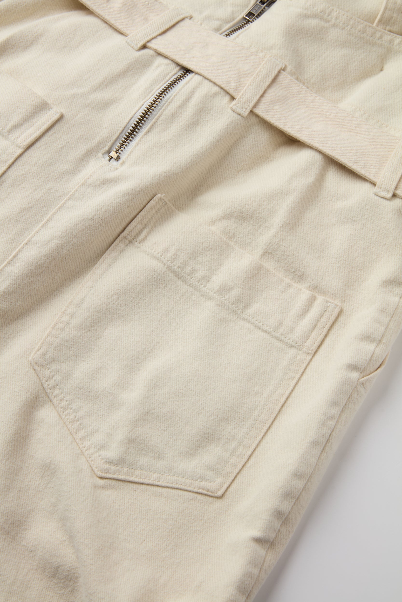 Jumpsuit with long, wide-leg pants, featuring two front pockets and two back pockets on the pants.