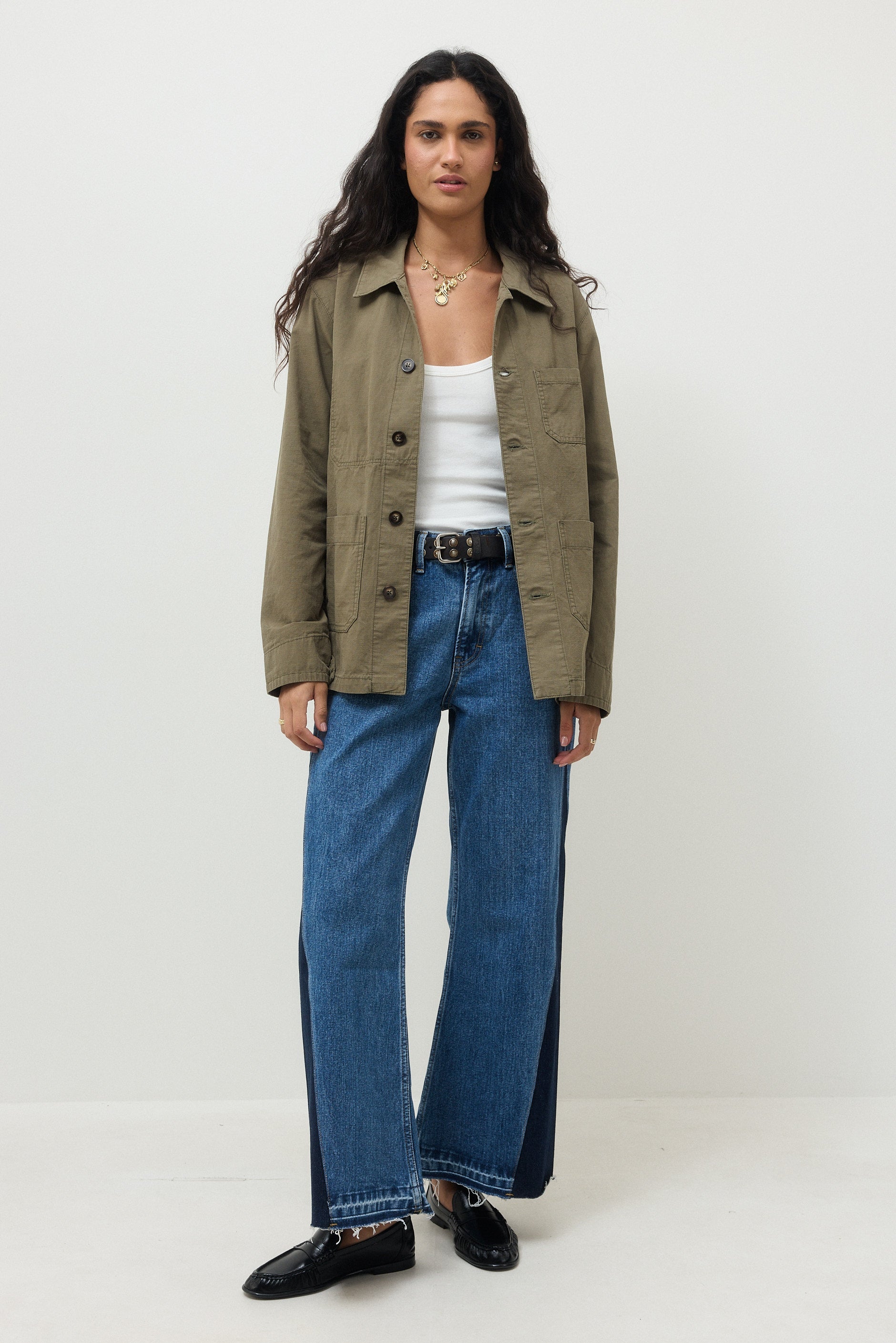 Skinny high-waisted jeans with a hem that flares slightly toward the bottom. A denim triangle insert in a contrasting shade is added along the sides. The hem is frayed.