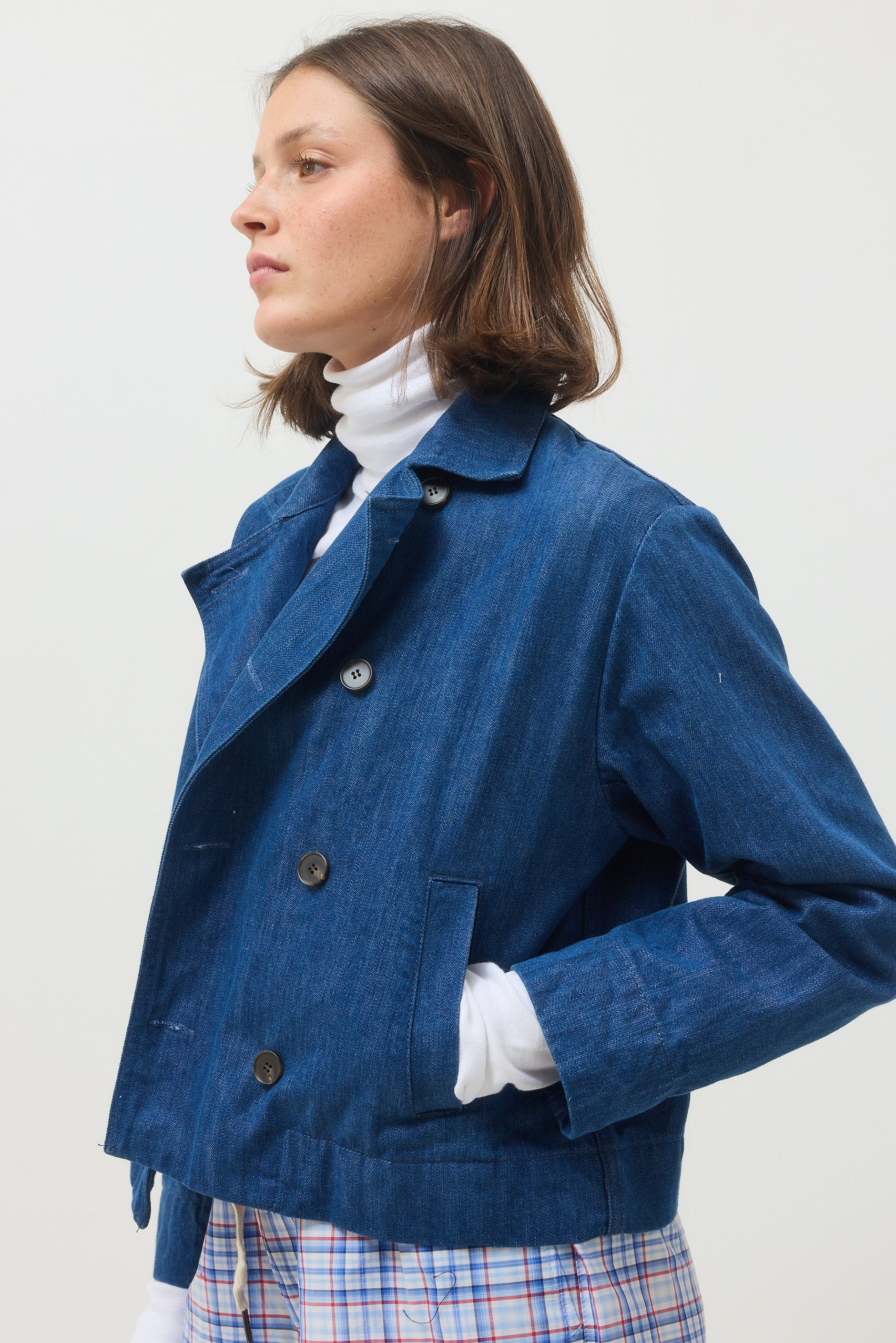 A short jacket made of denim-like fabric, with a relaxed fit and a straight hem. It features a double closure with six front buttons and side pockets. Designed with a sturdy collar that combines a tailored look with a casual feel.