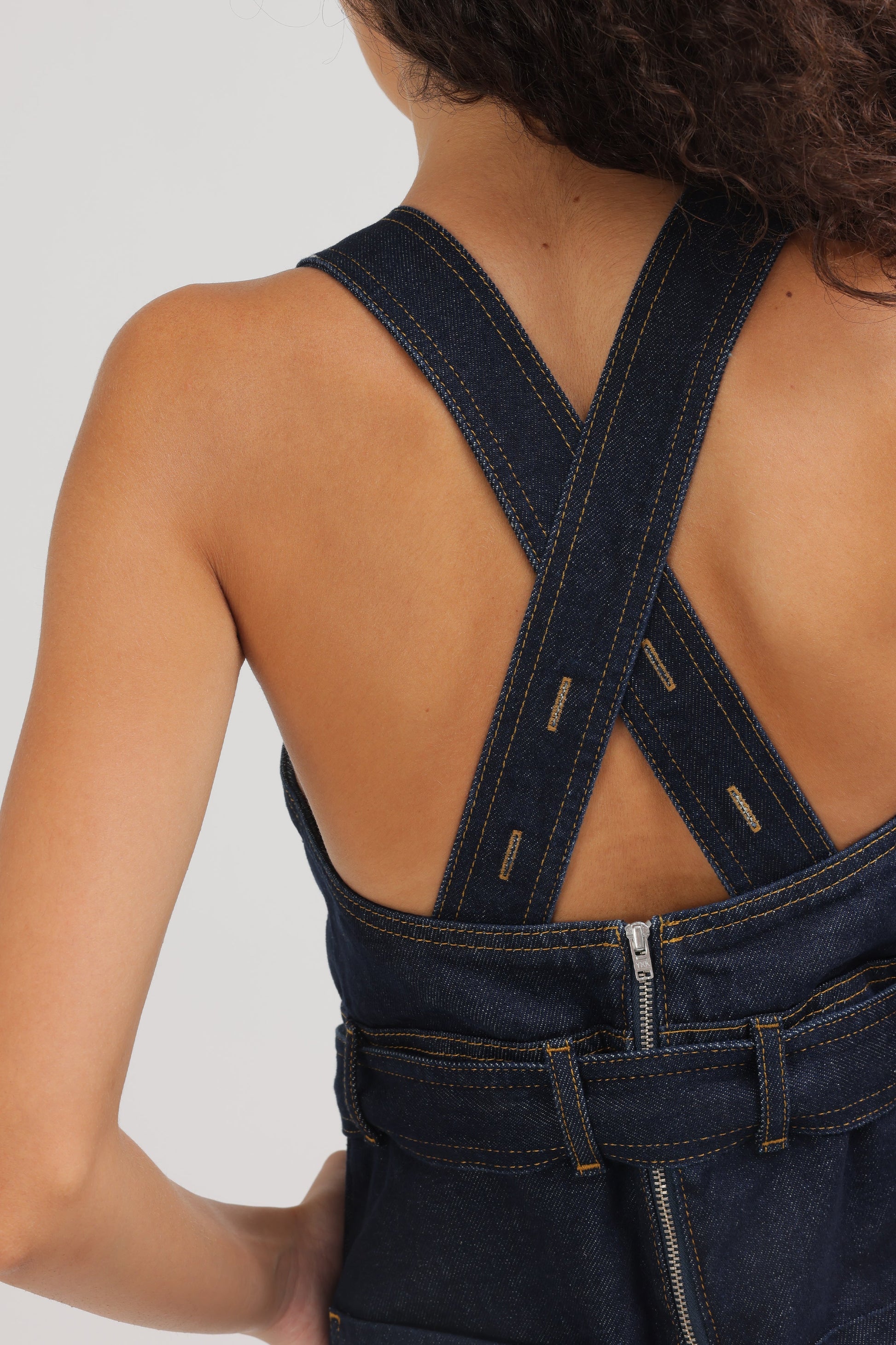 Denim jumpsuit with long, wide-leg pants. Features two front pockets on the pants and two back pockets.