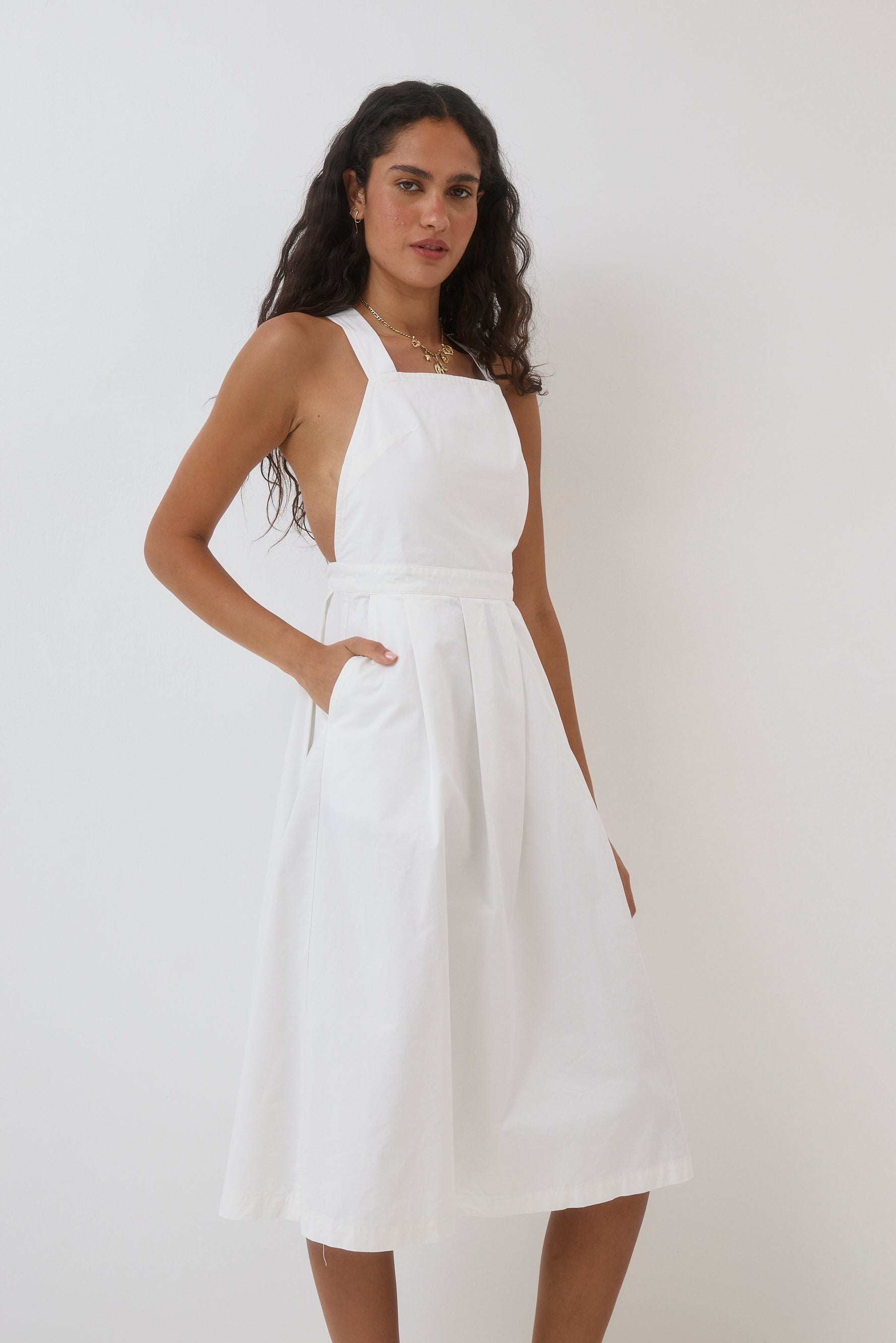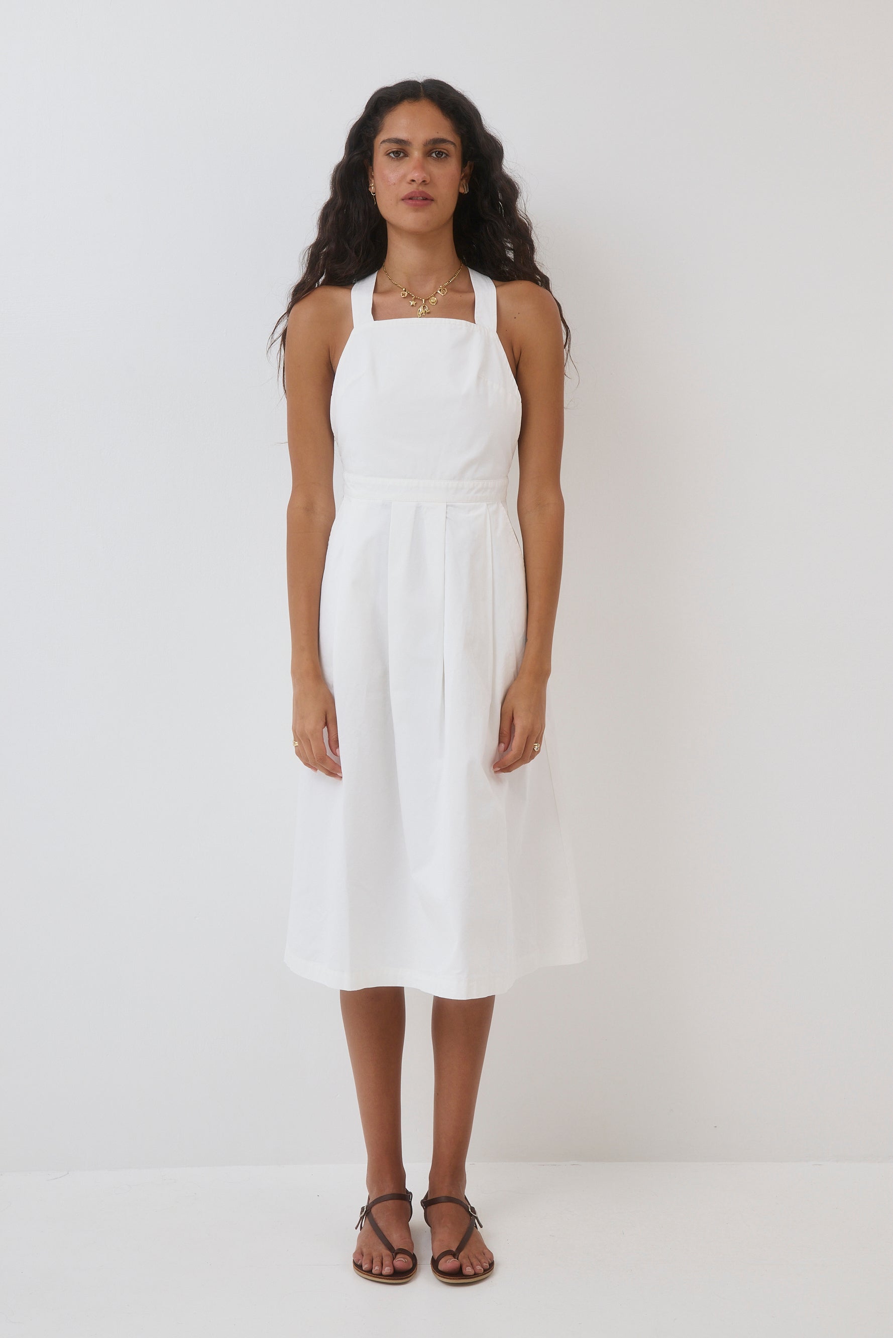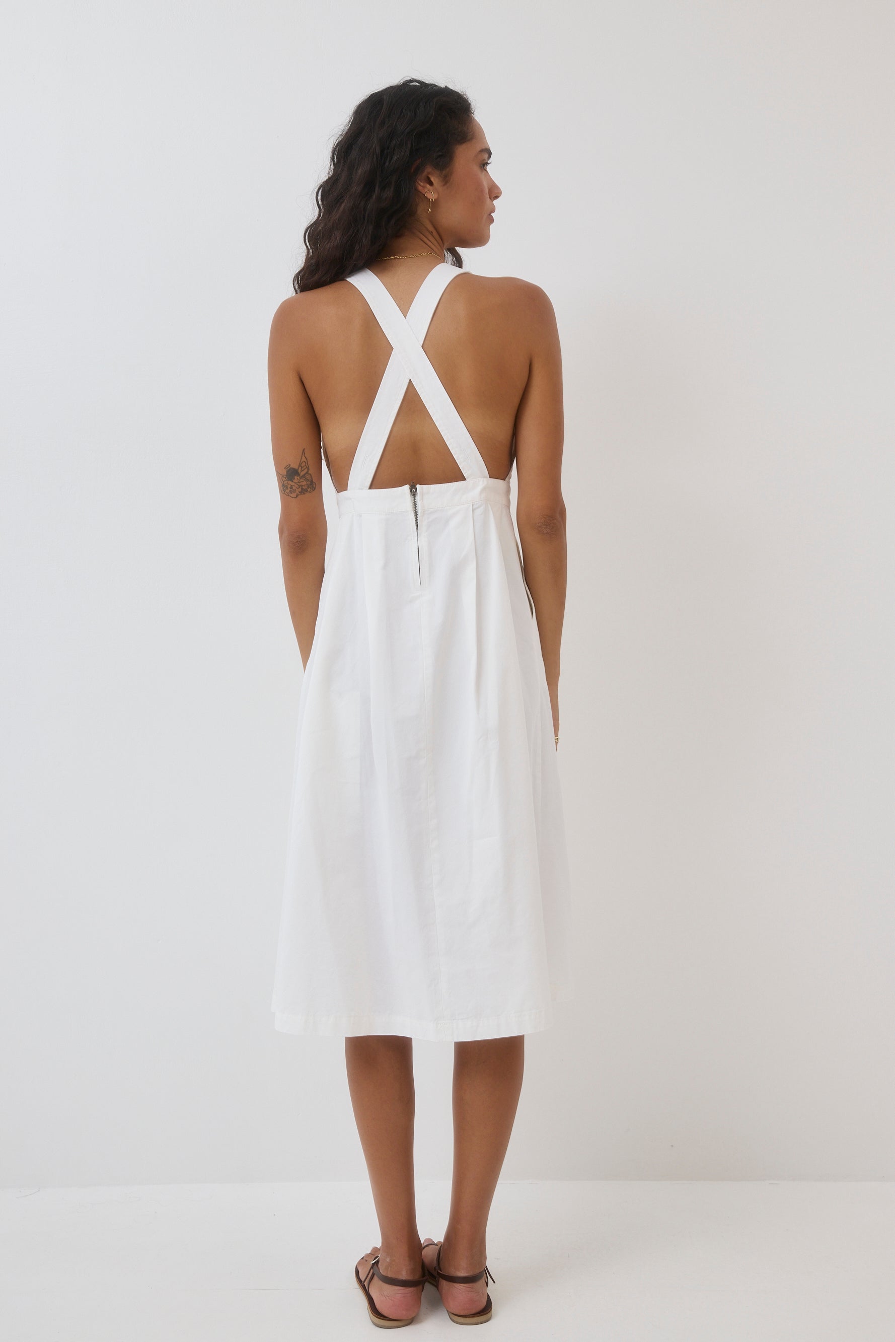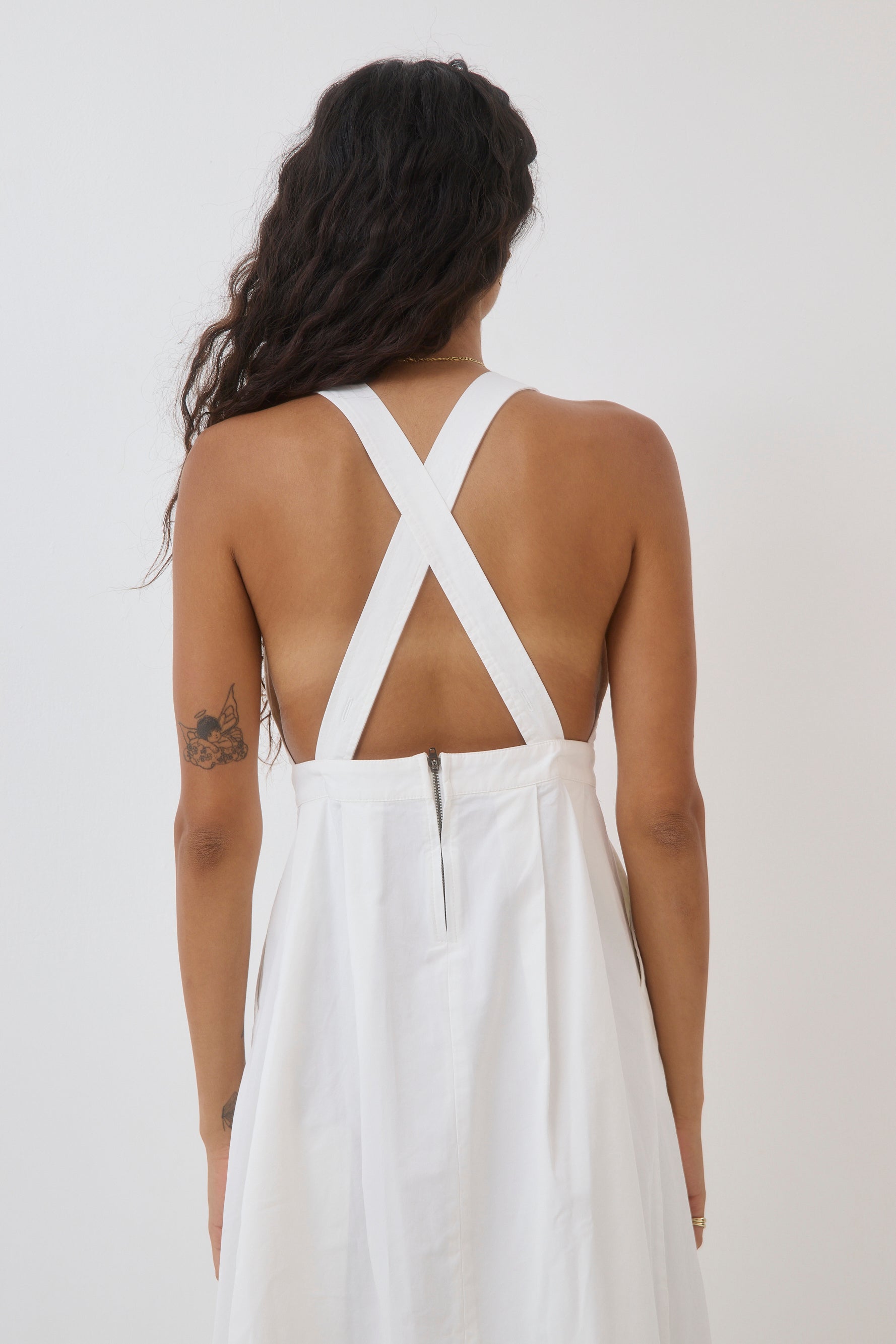 A relaxed-fit sarafan dress with soft pleats falling from the waist down. The top features two shoulder straps that cross and fasten at the back in an X shape.