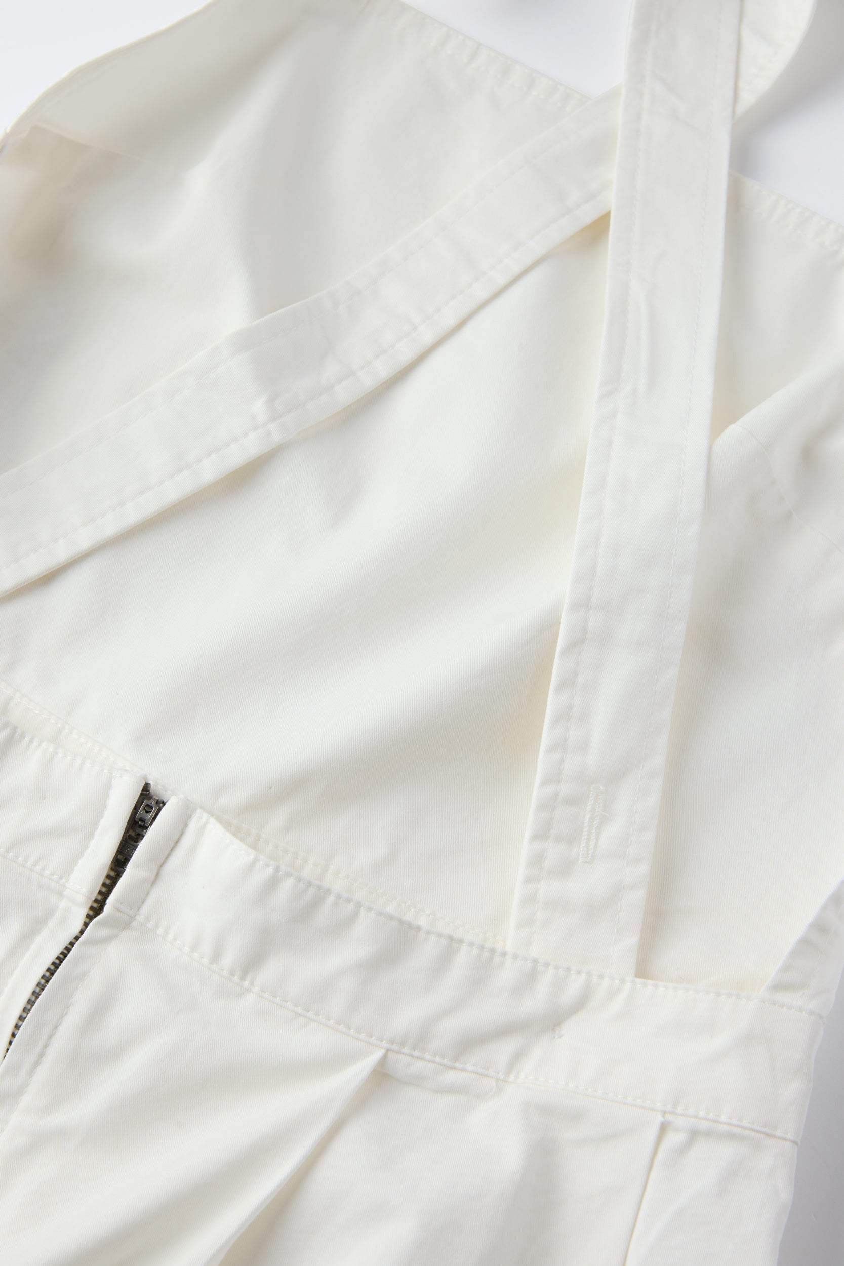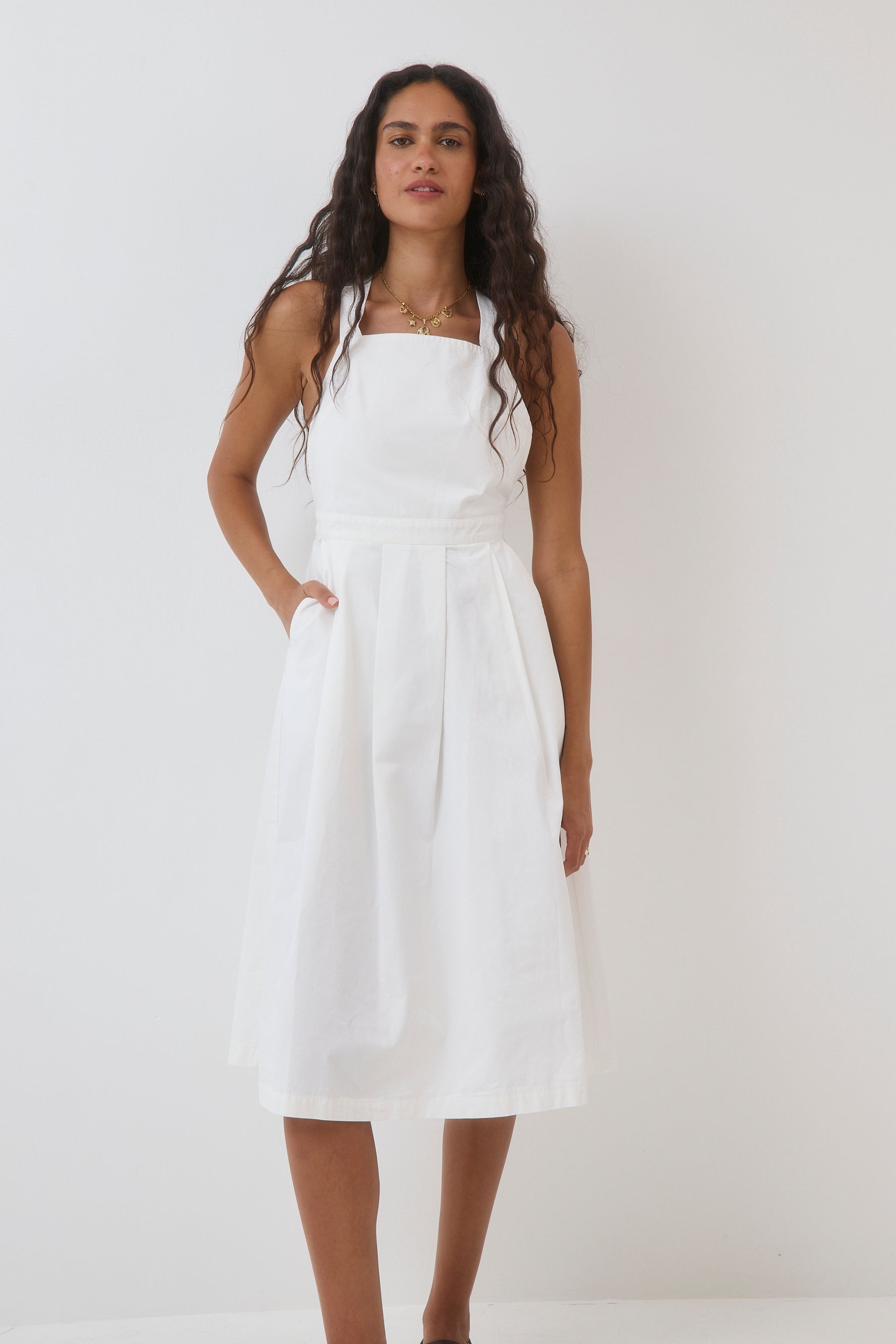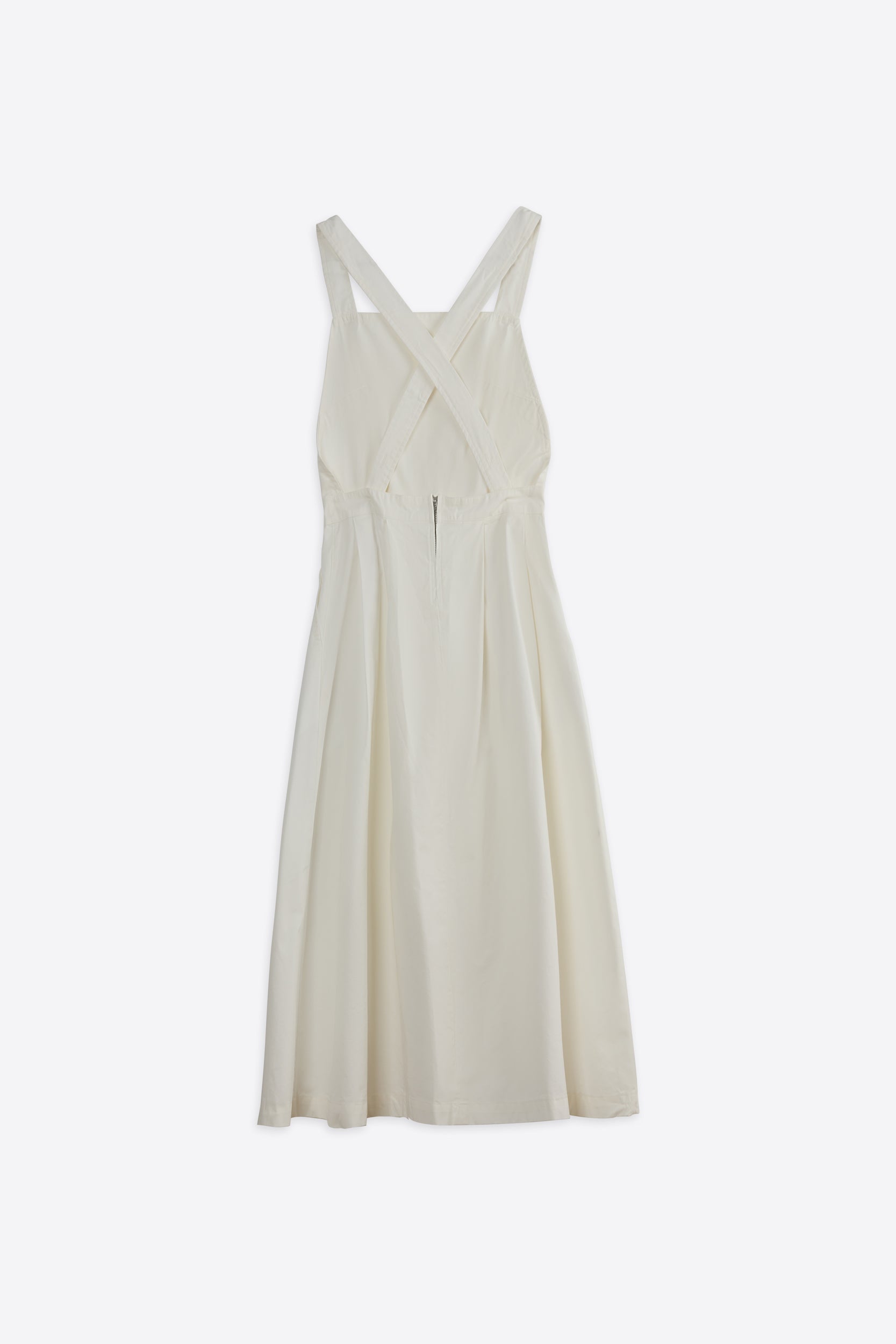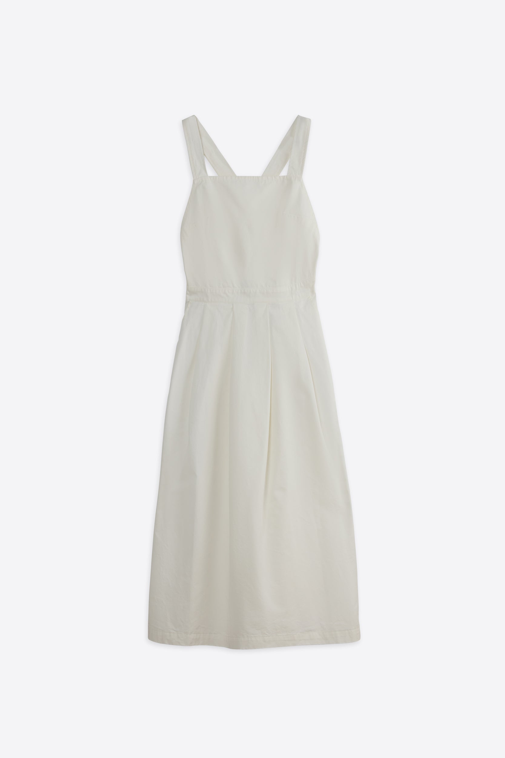 A relaxed-fit sarafan dress with soft pleats falling from the waist down. The top features two shoulder straps that cross and fasten at the back in an X shape.