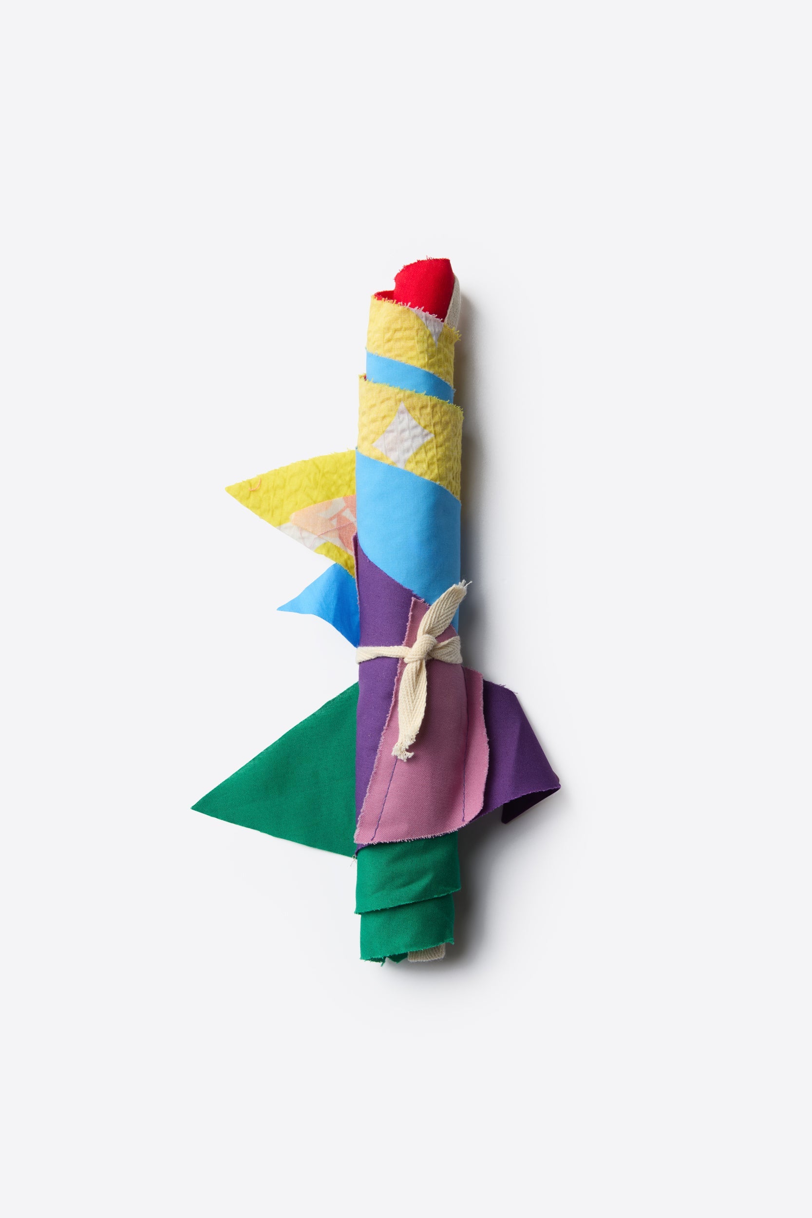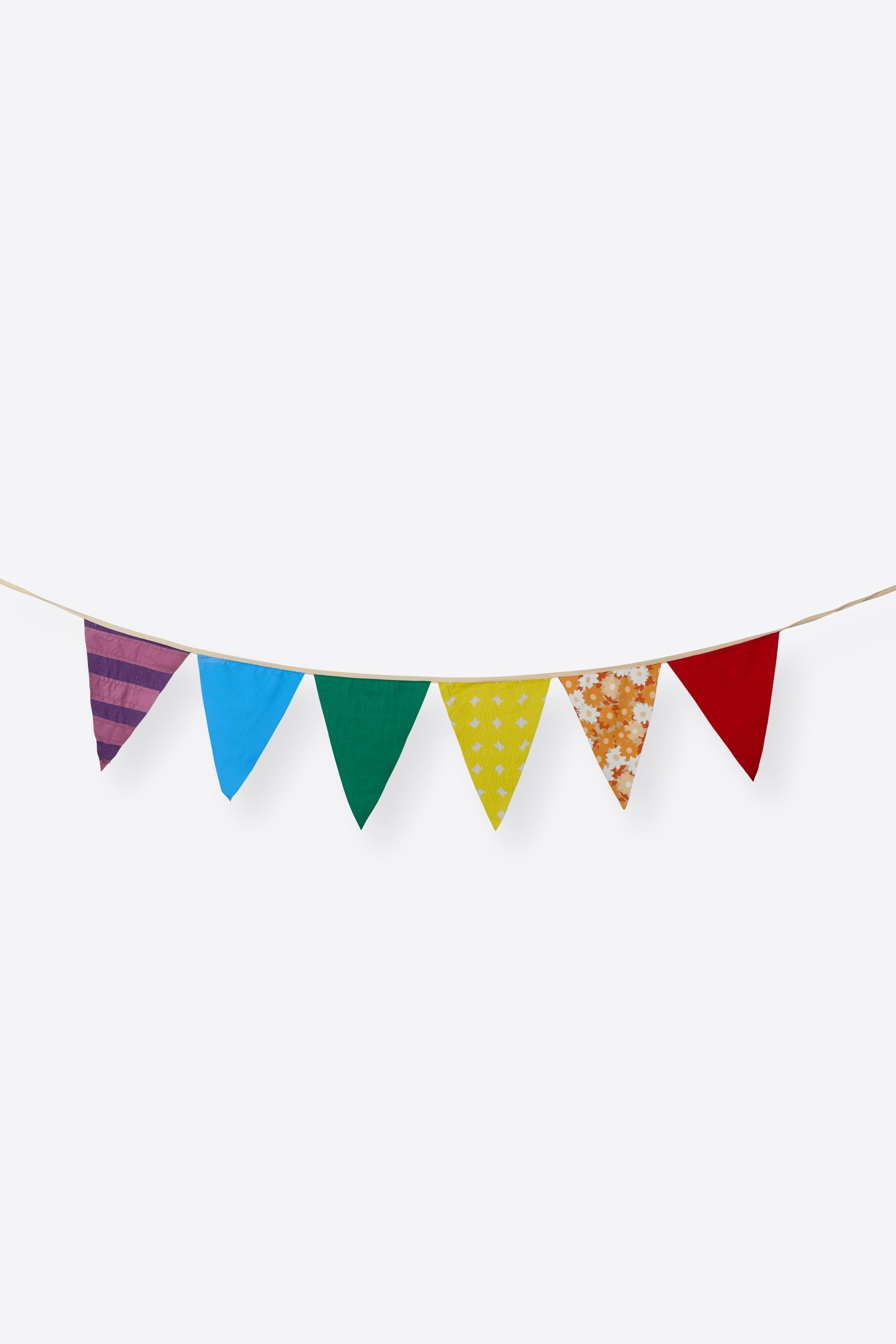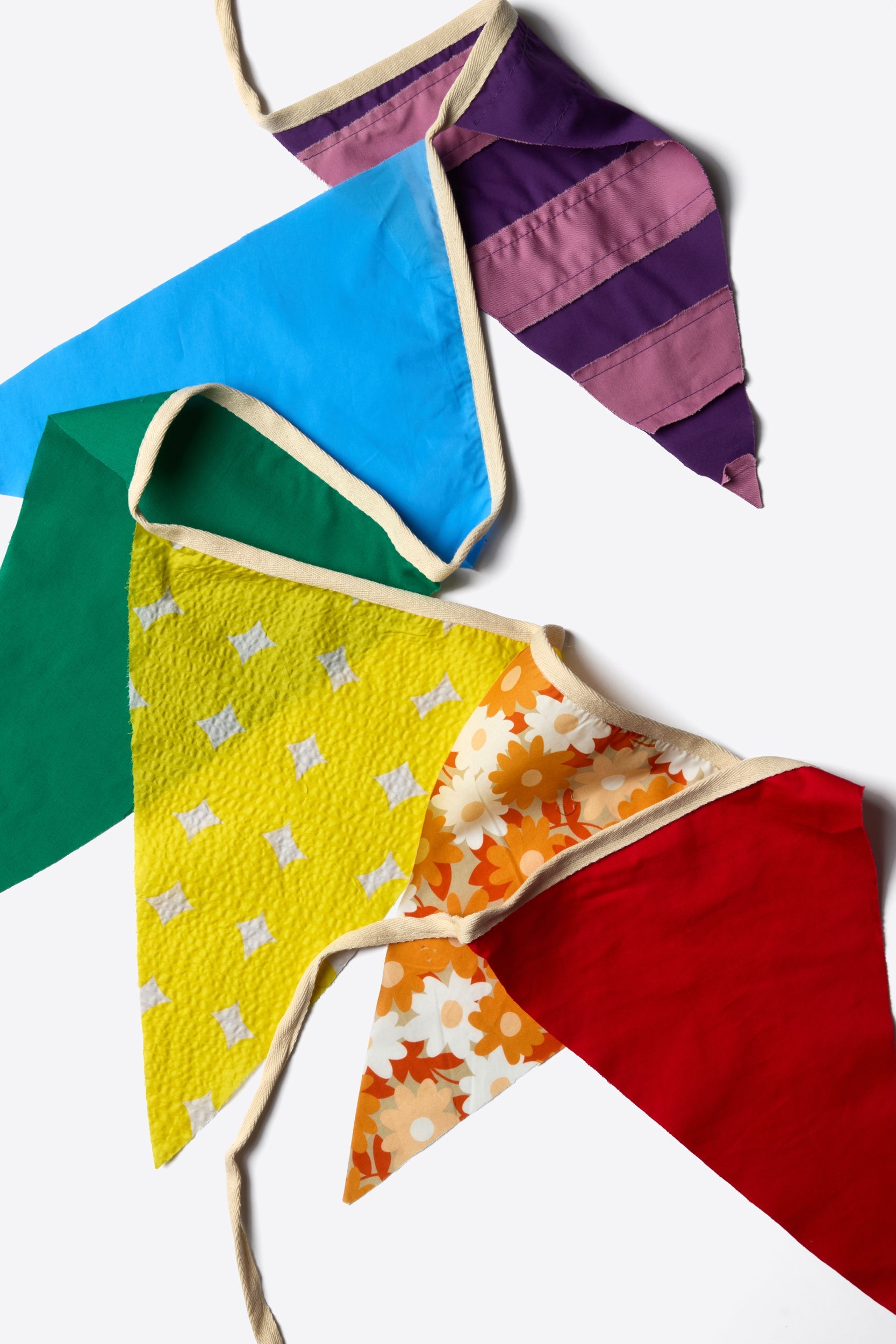 A garland of flags sewn onto a cotton ribbon, approximately 3.5 meters long.