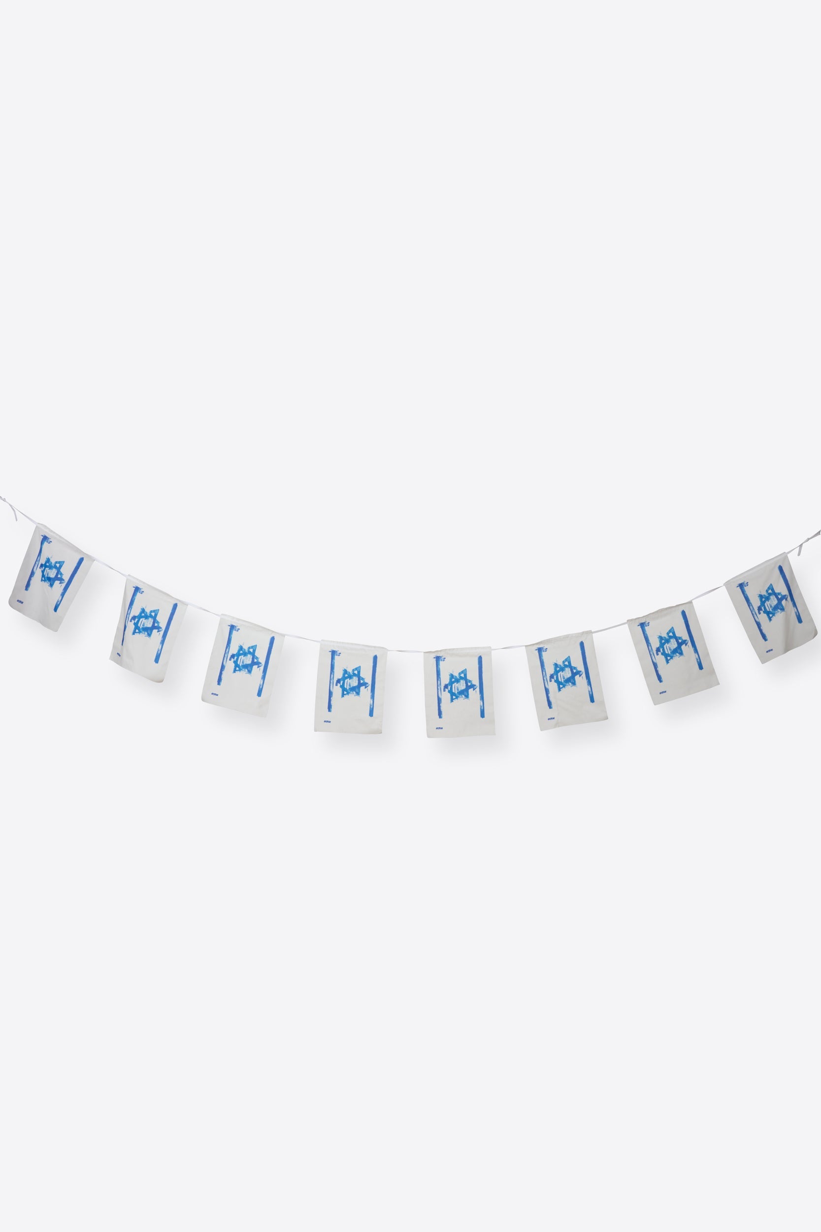 A garland of flags sewn onto a cotton ribbon, approximately 3.5 meters long.