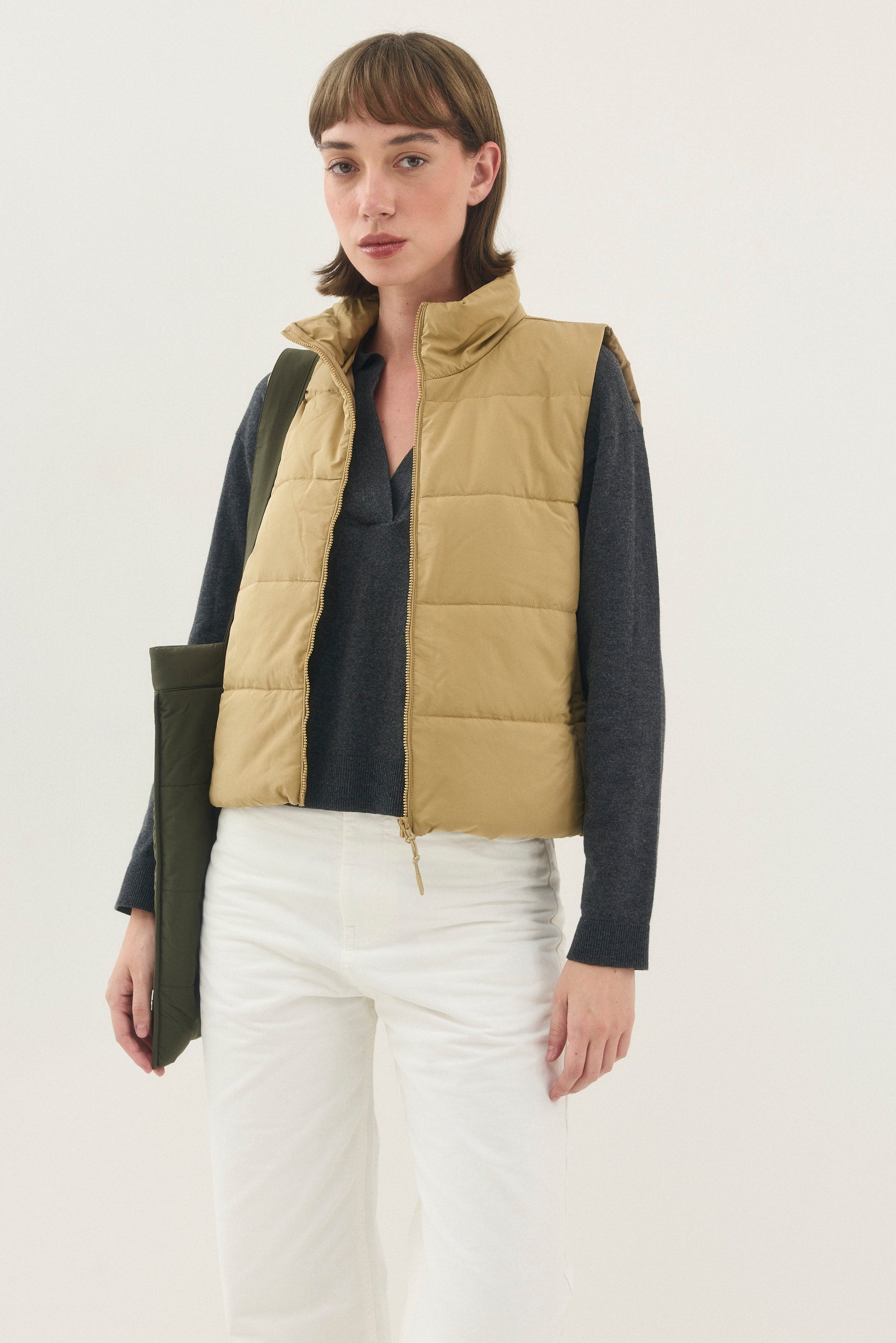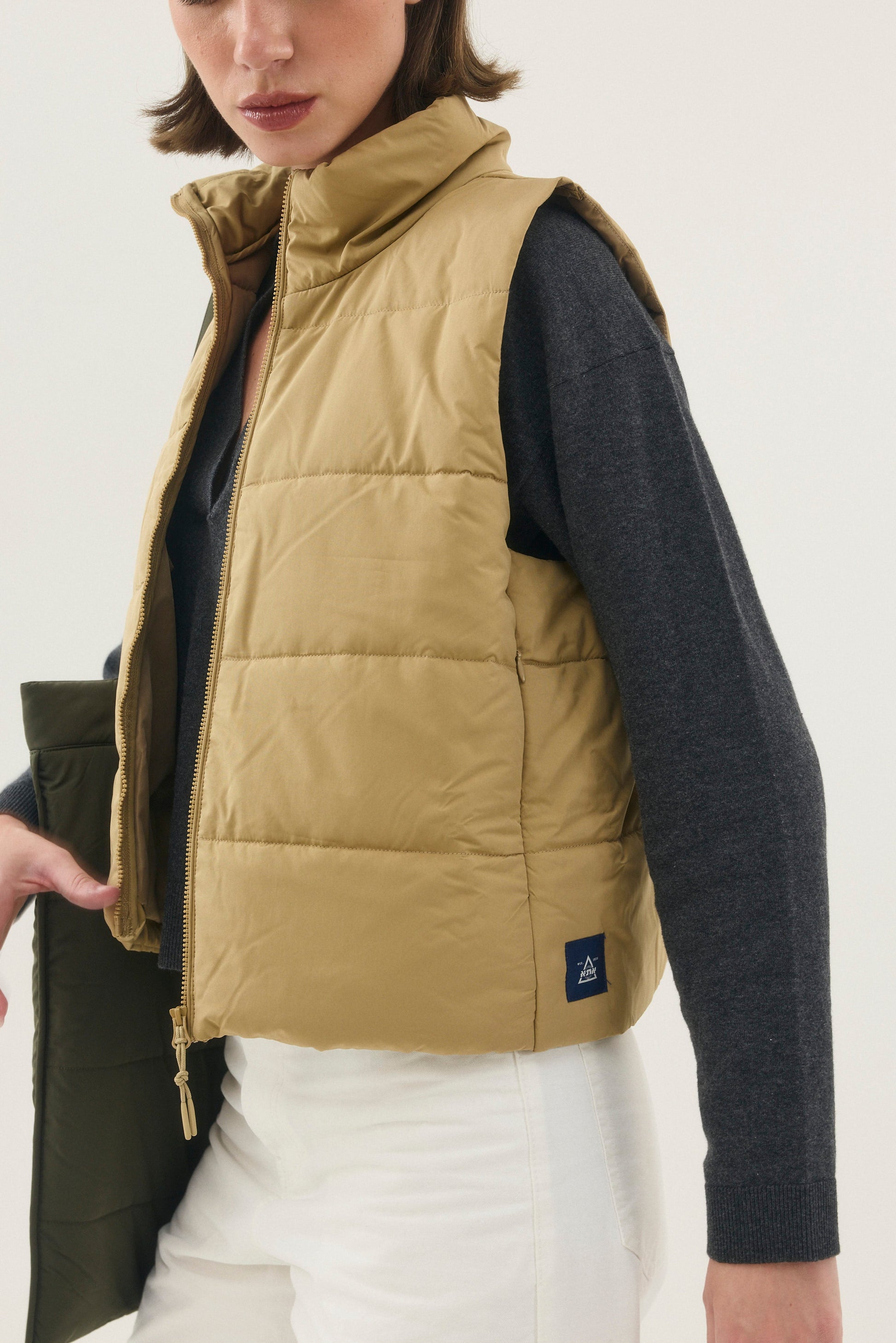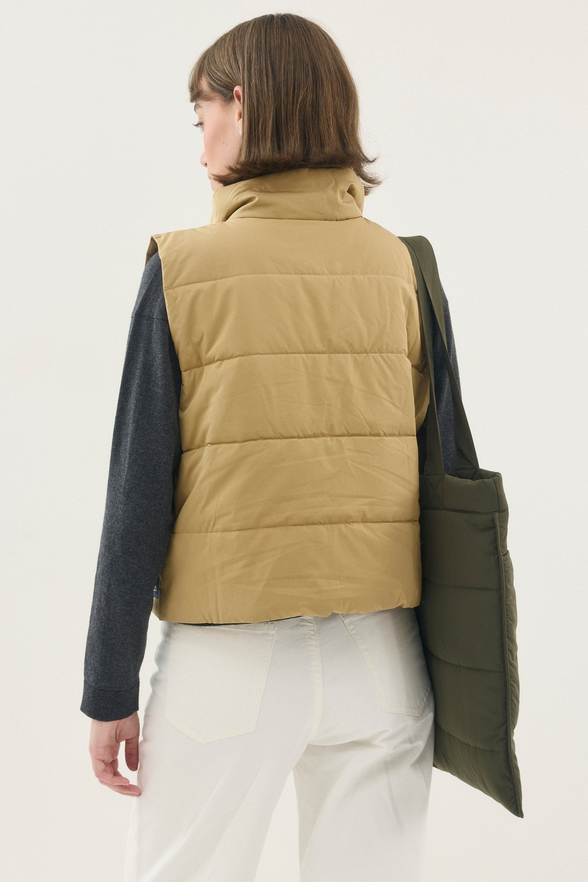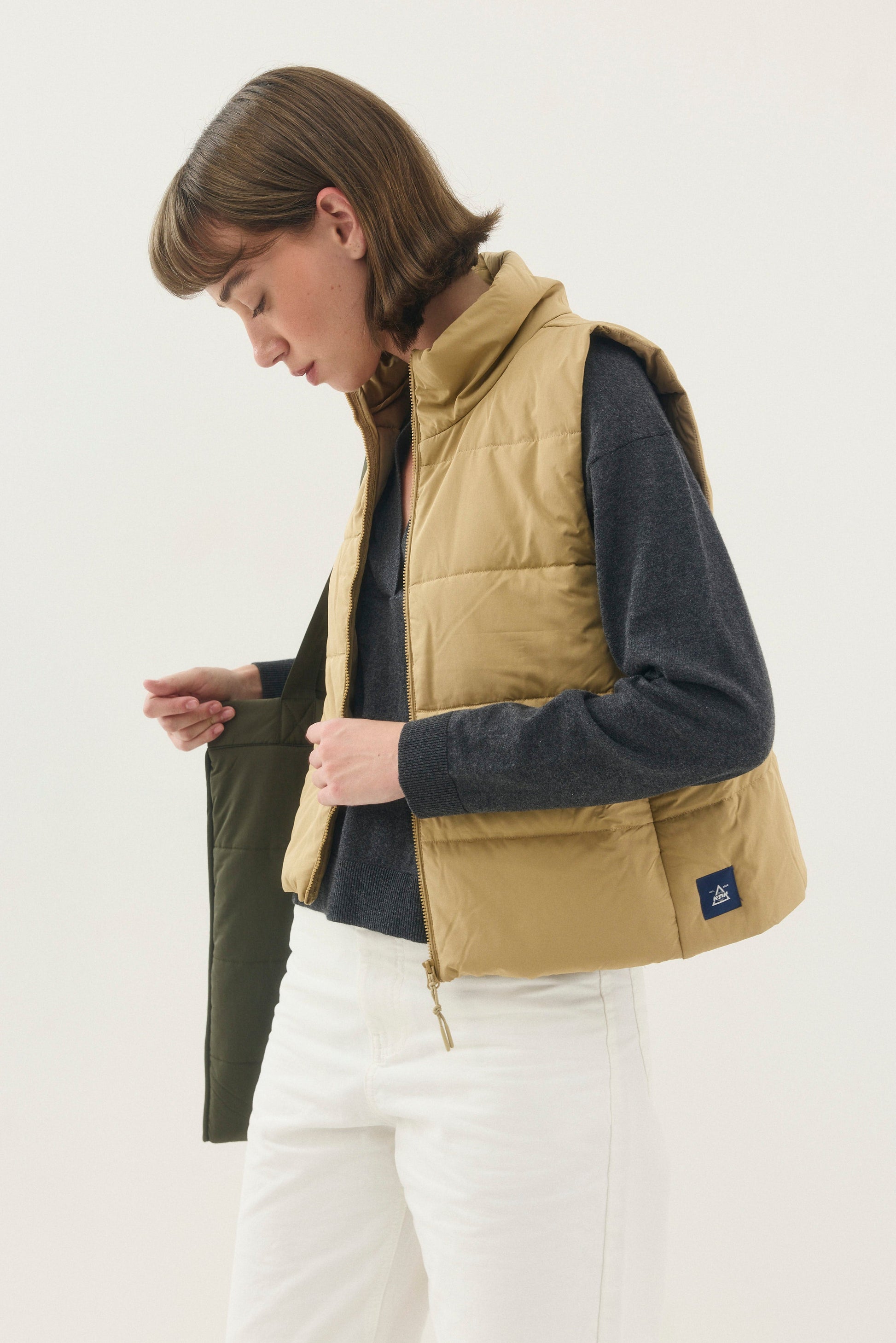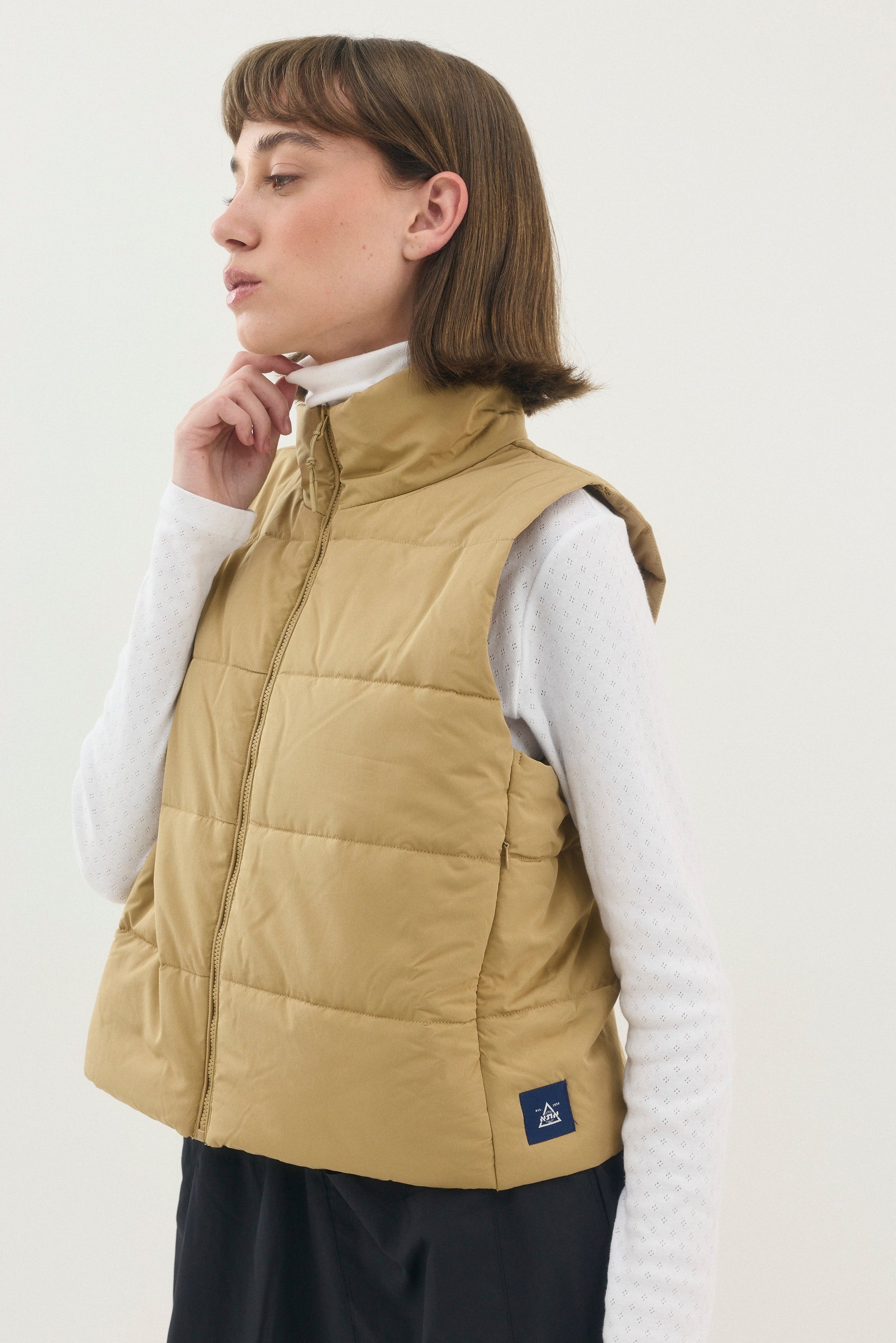 Vest made of 80% polyester, 20% nylon. The fabric has a coating that allows water to repel off the surface and provides wind protection (water-repellent).