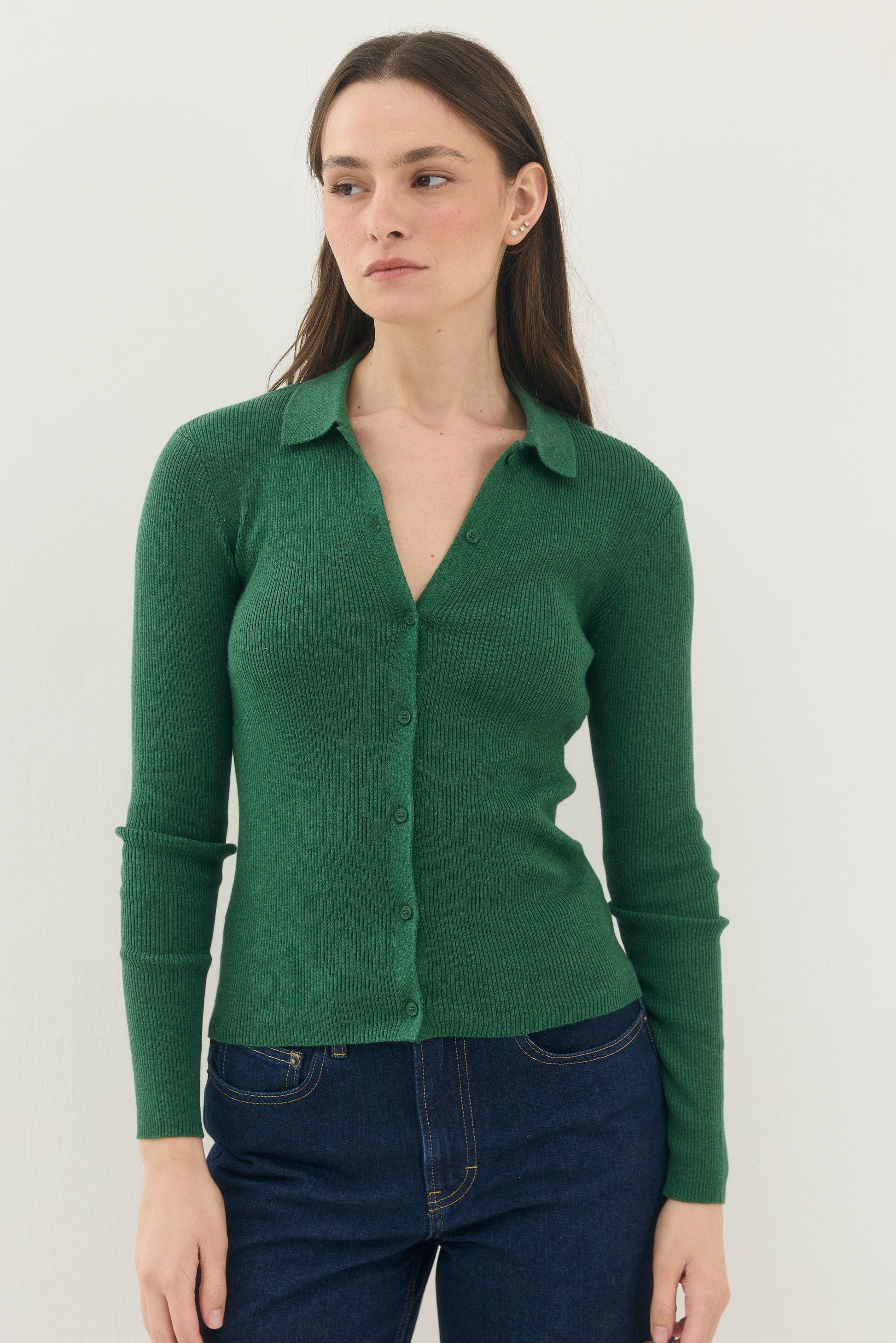 A fitted rib-knit sweater with a collar and buttons running along the entire front.