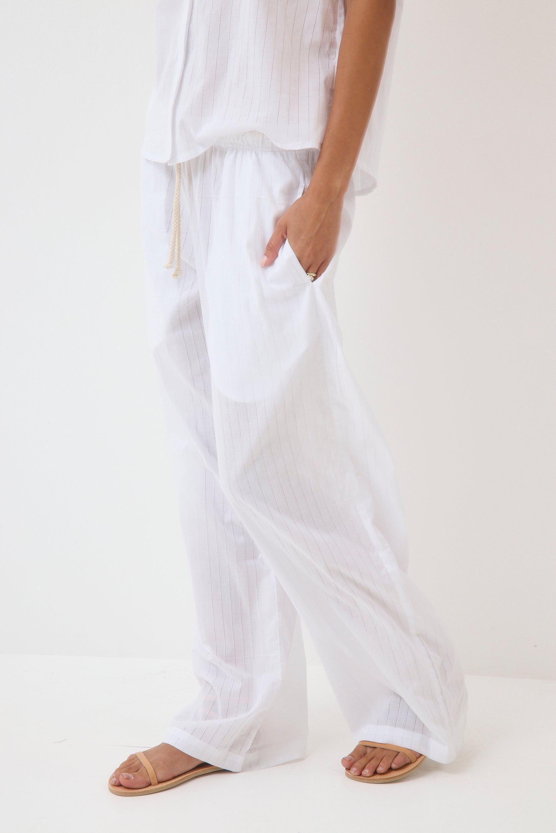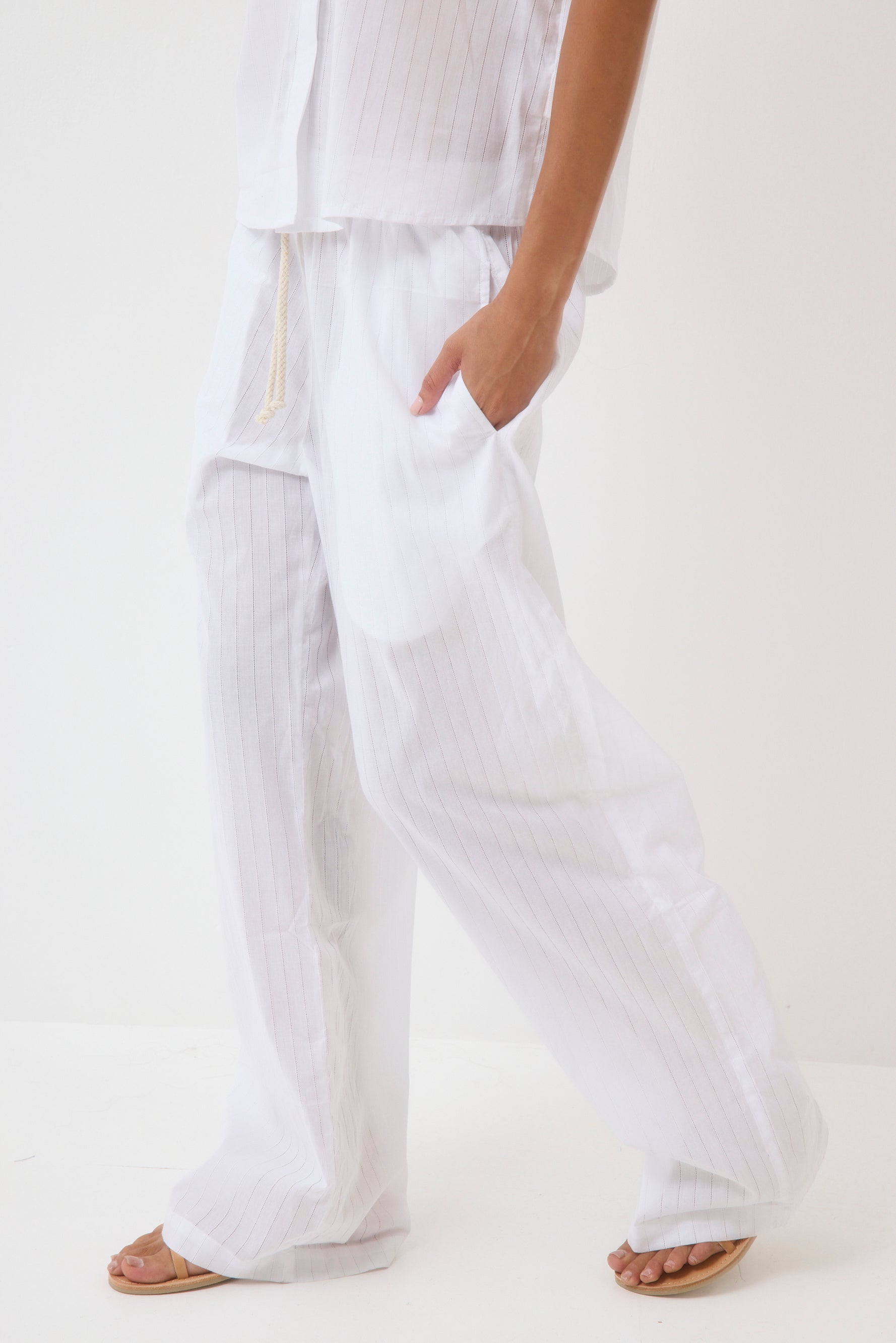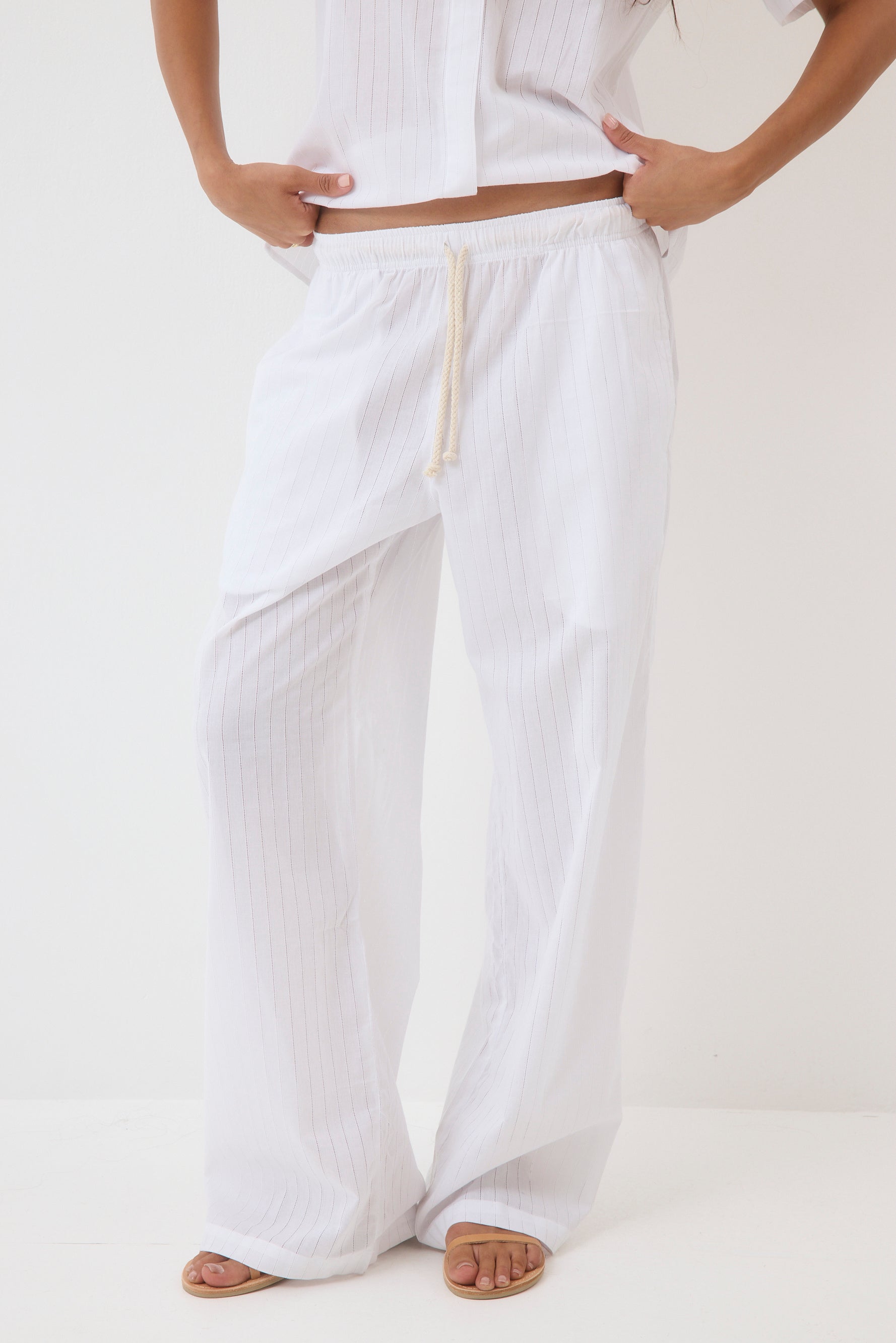 Wide-leg pants with a drawstring.