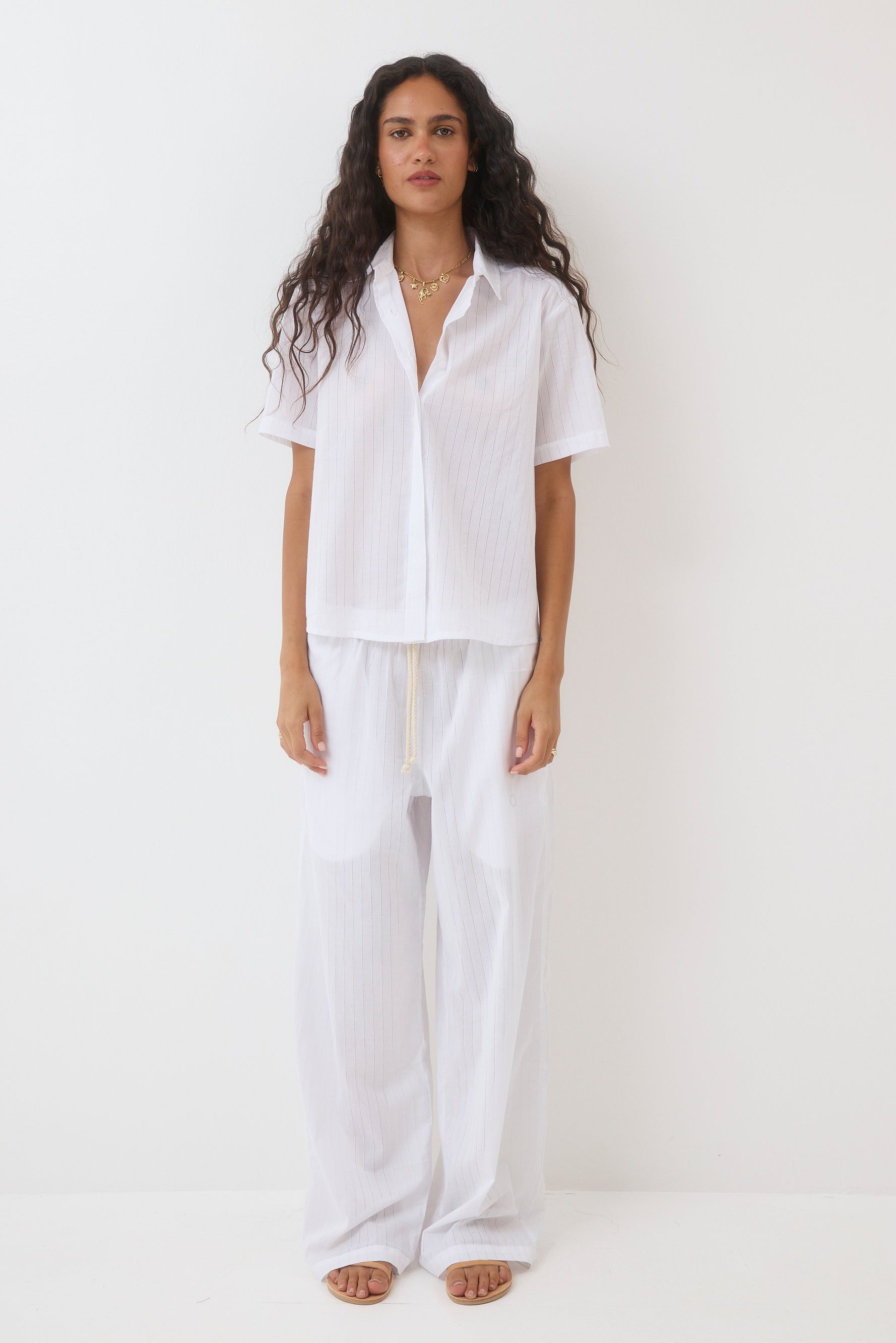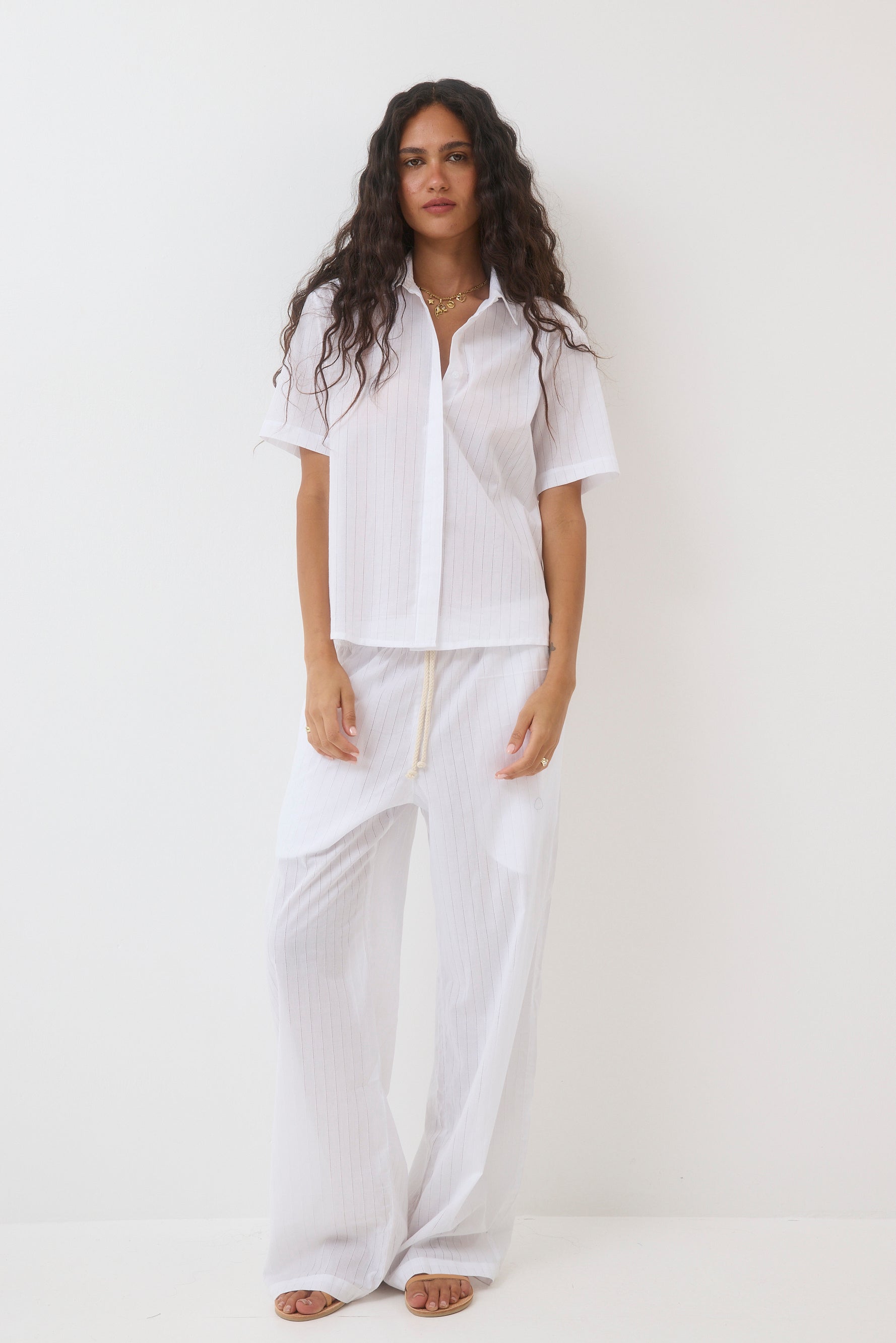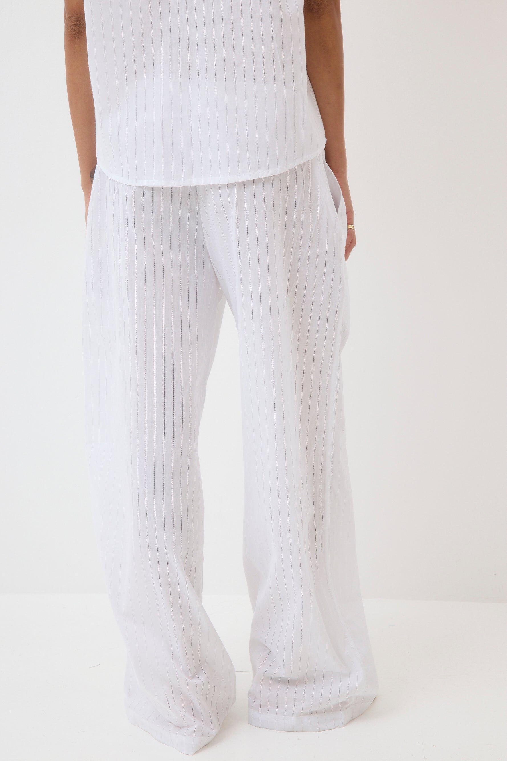 Wide-leg pants with a drawstring.
