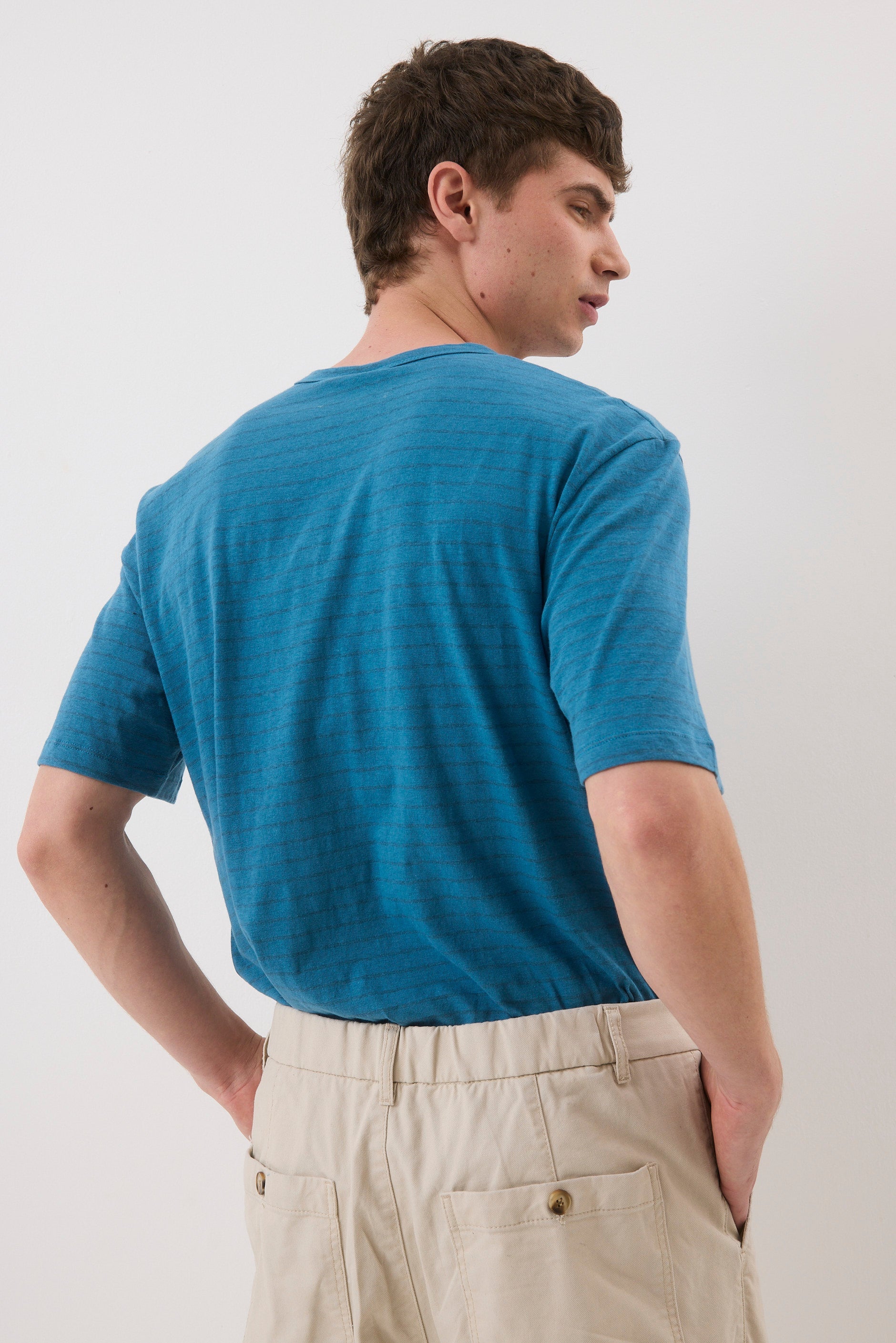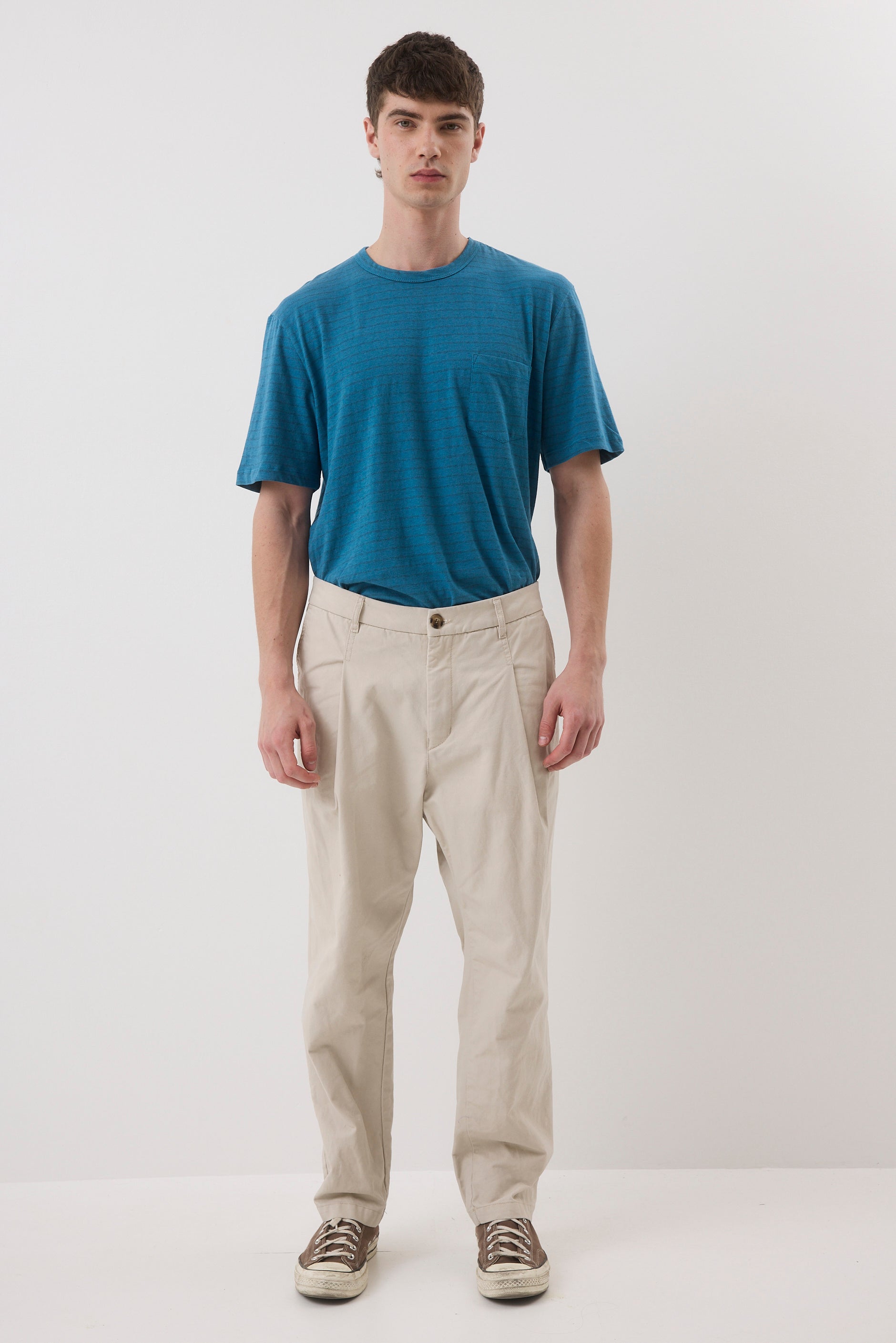A straight-cut T-shirt with a round neckline made of ribbed fabric. The shirt features a front pocket on the right side.