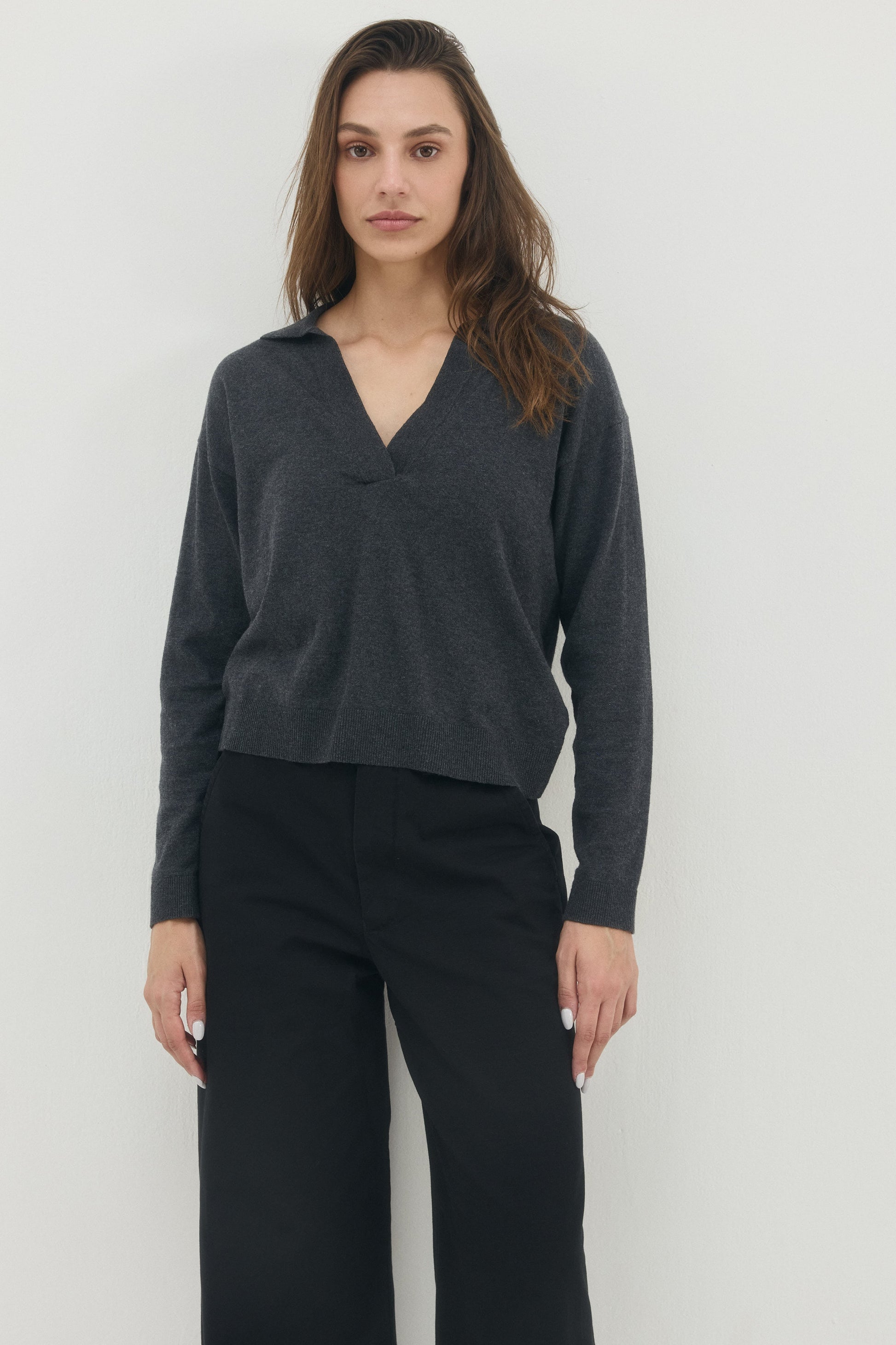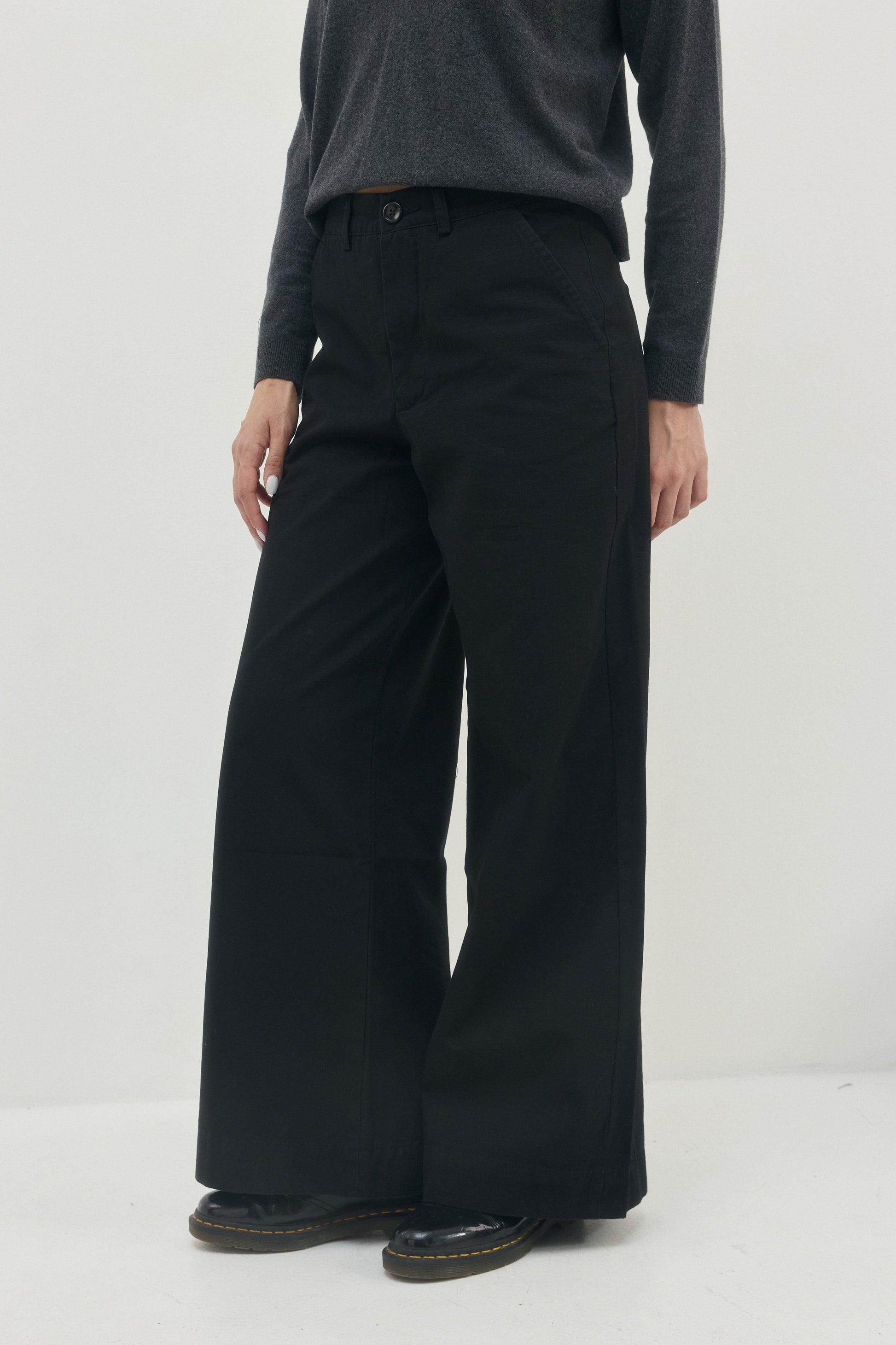 High-waisted trousers with two side pockets (chino style) and two welt pockets at the back. The trousers have a flared cut.