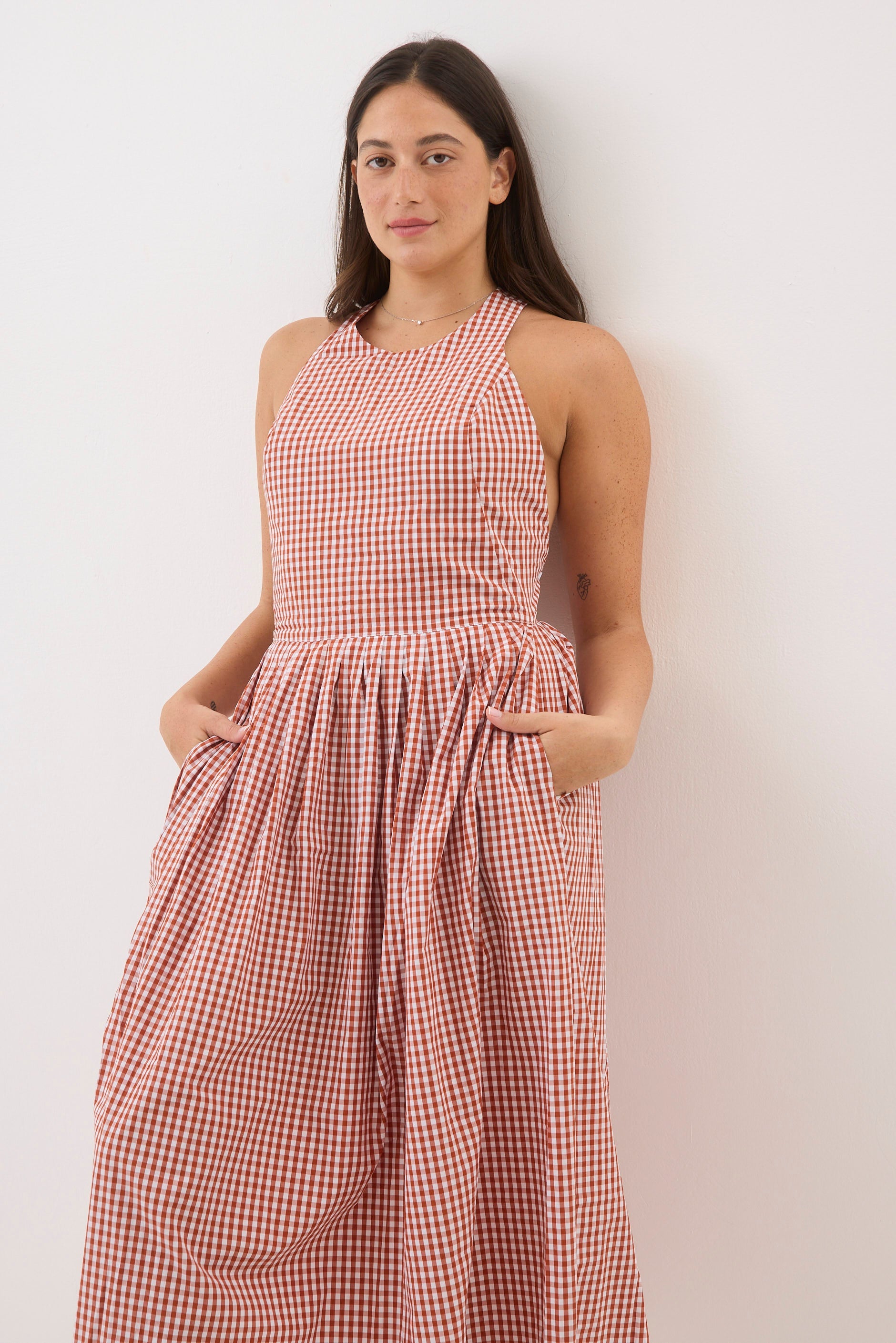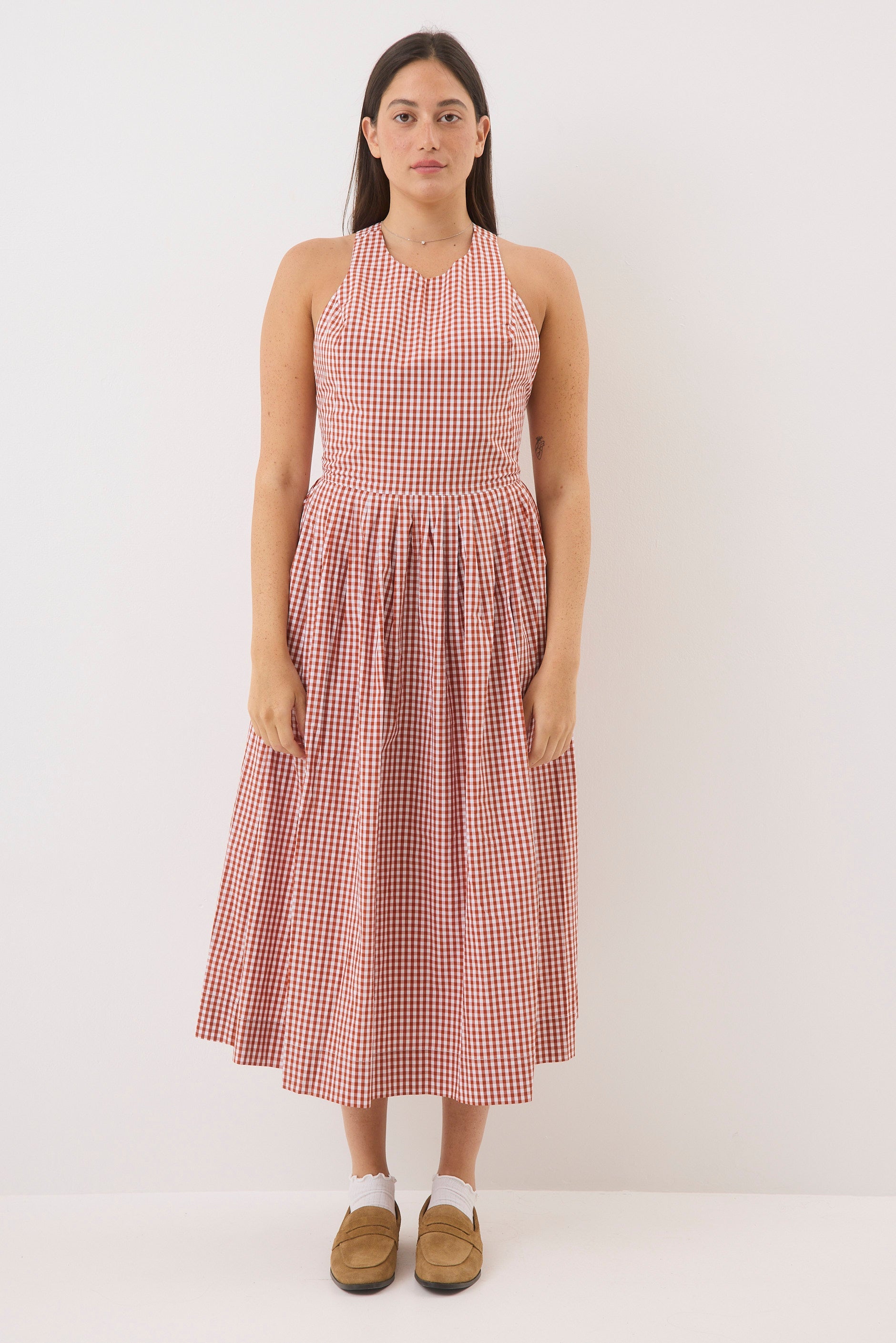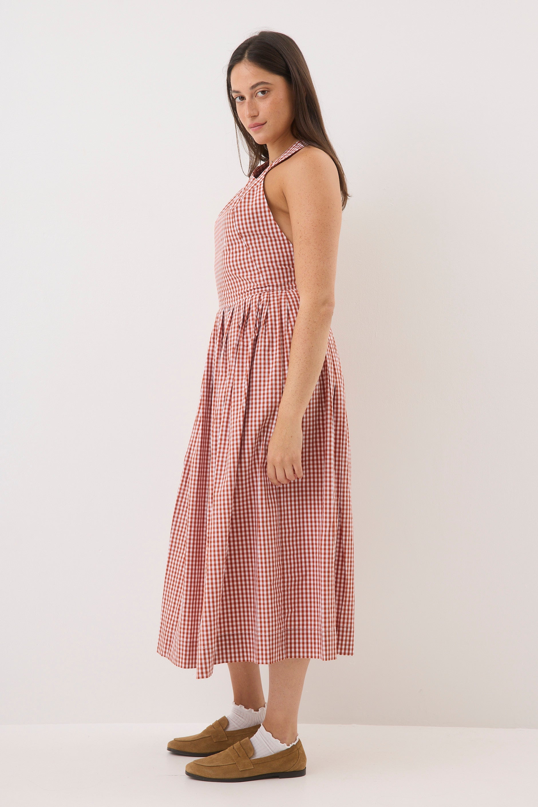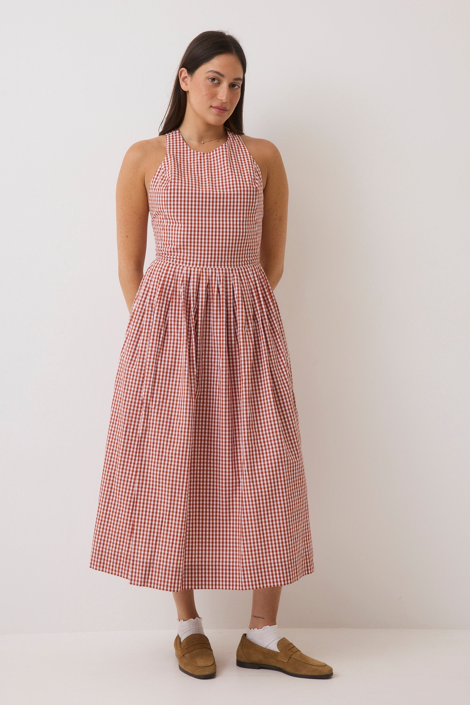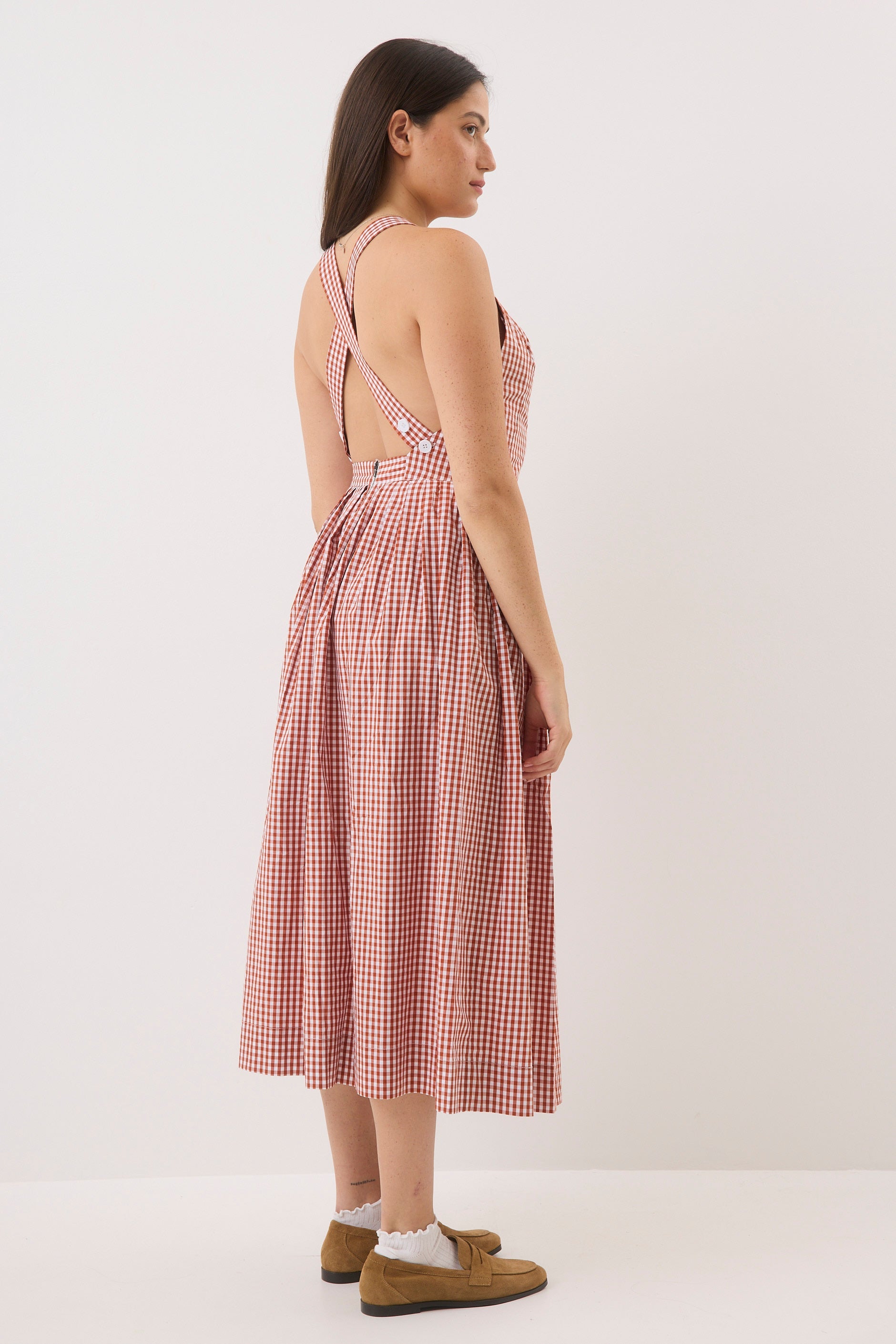 Elinor Dress in Black, White and Red. A relaxed-fit, midi-length dress with a round neckline, open back, and wide straps that cross at the back. The dress features hidden side pockets and pleats in the skirt.