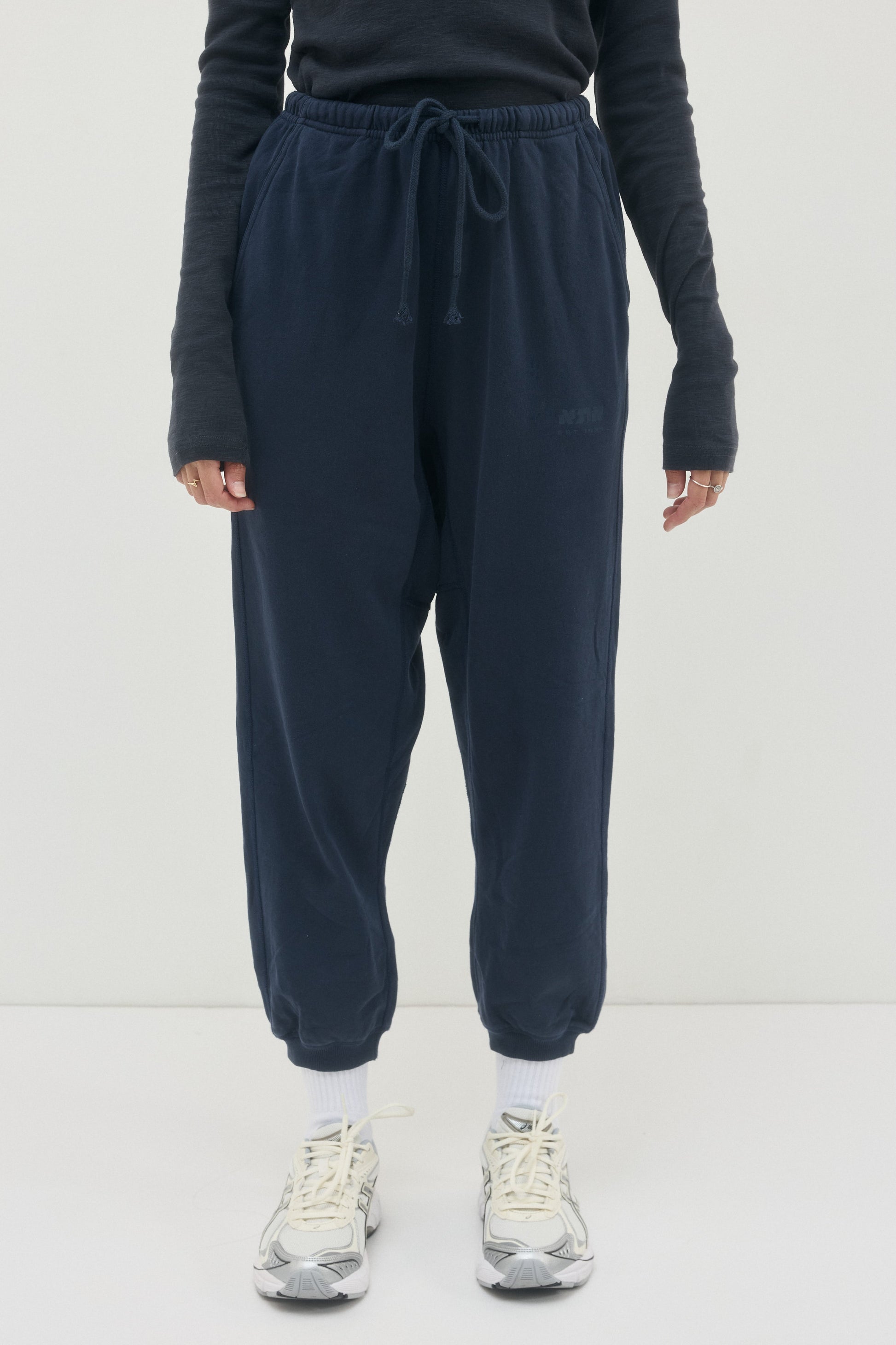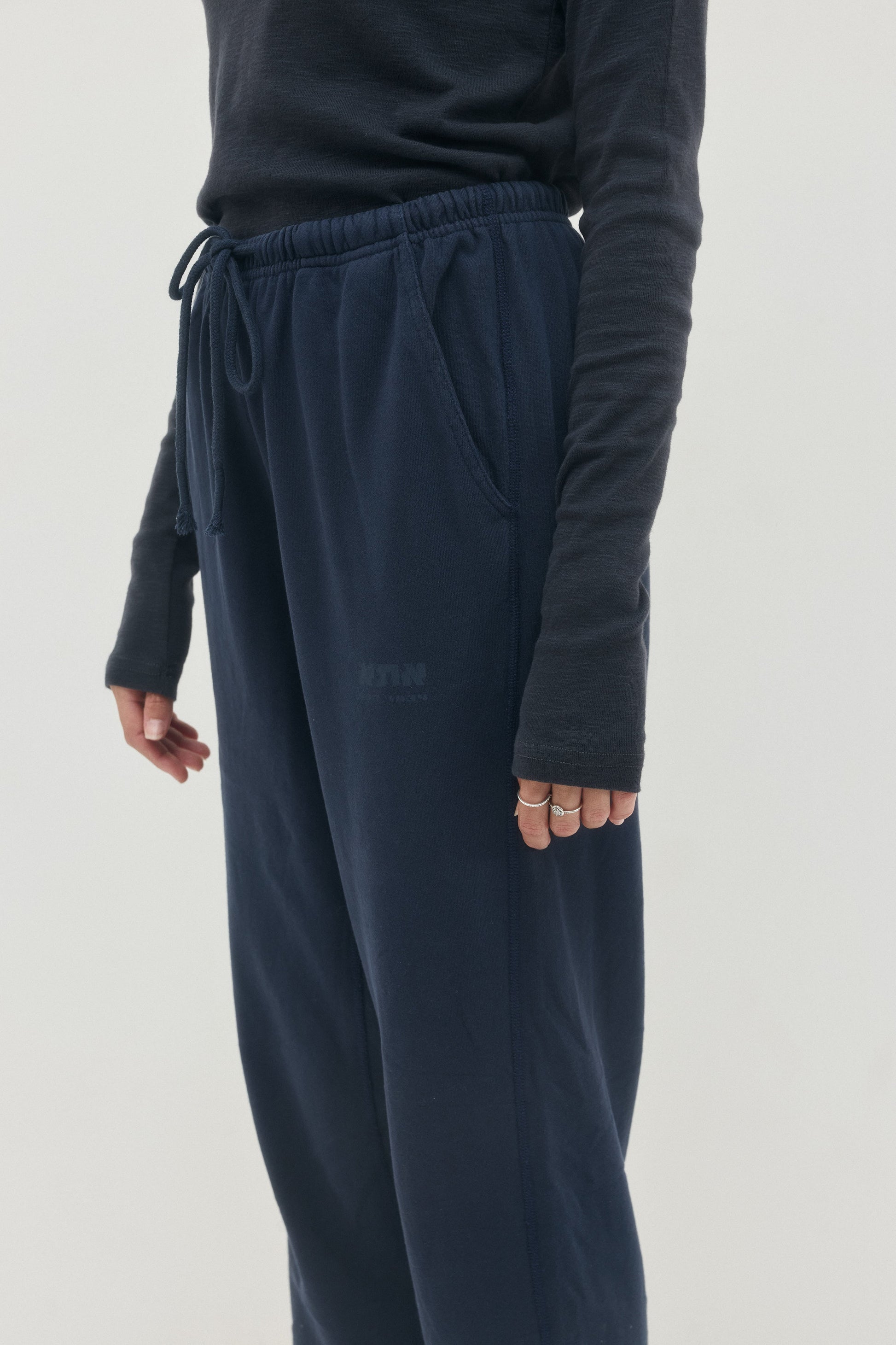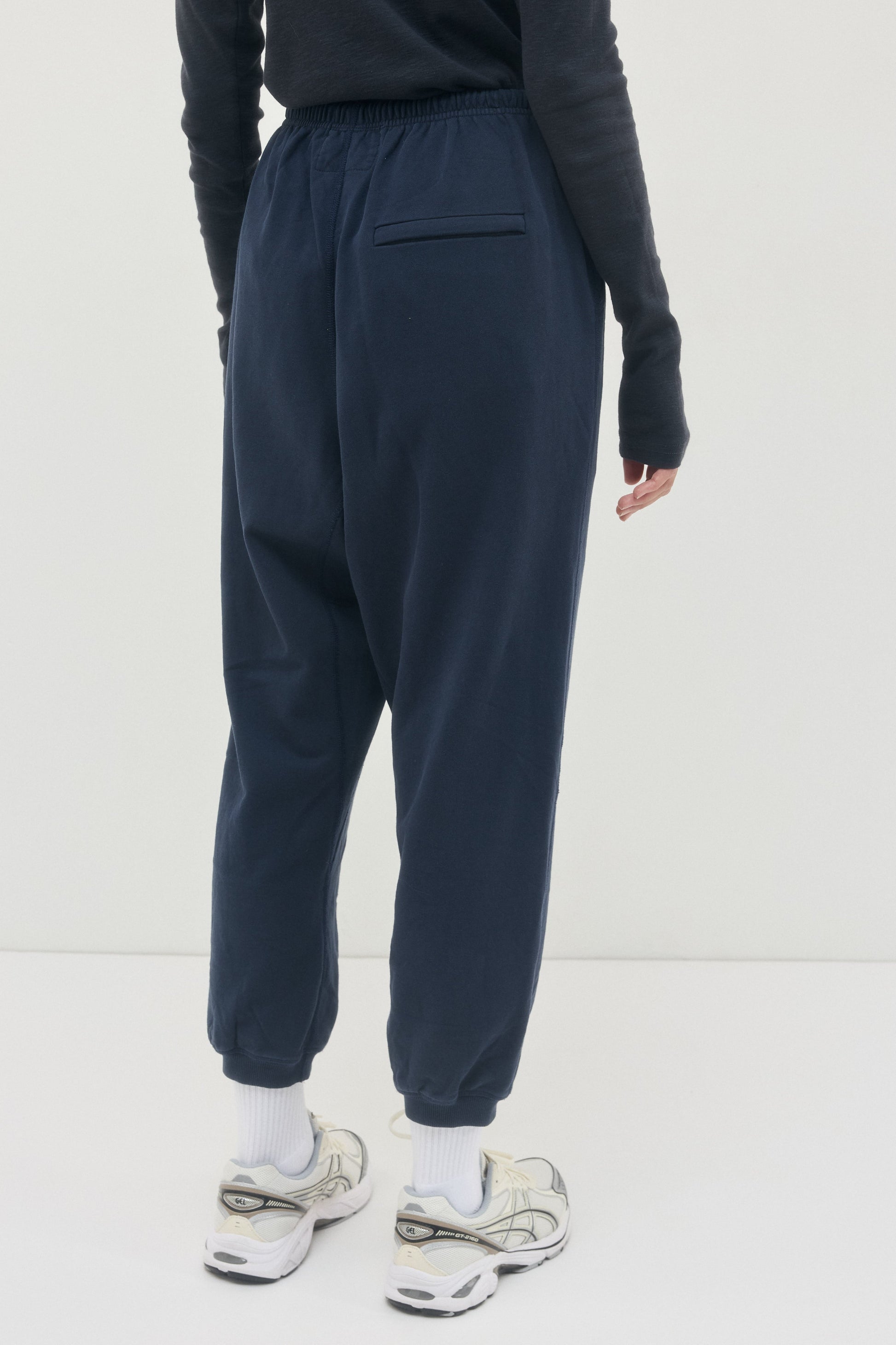 Relaxed-fit sweatpants with an elastic waistband and drawstring, featuring a long rise, two side pockets, and a back pocket with a zipper.