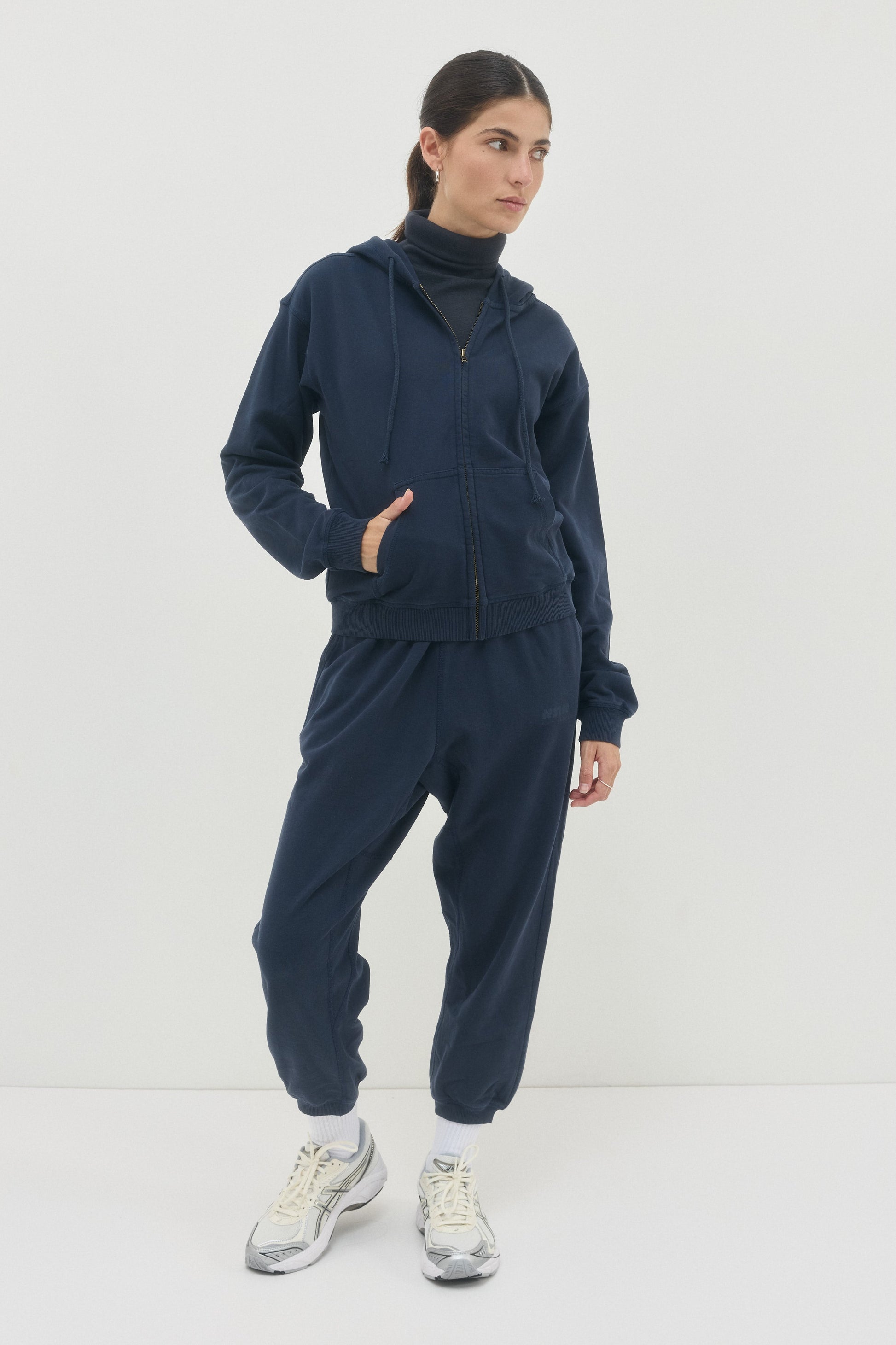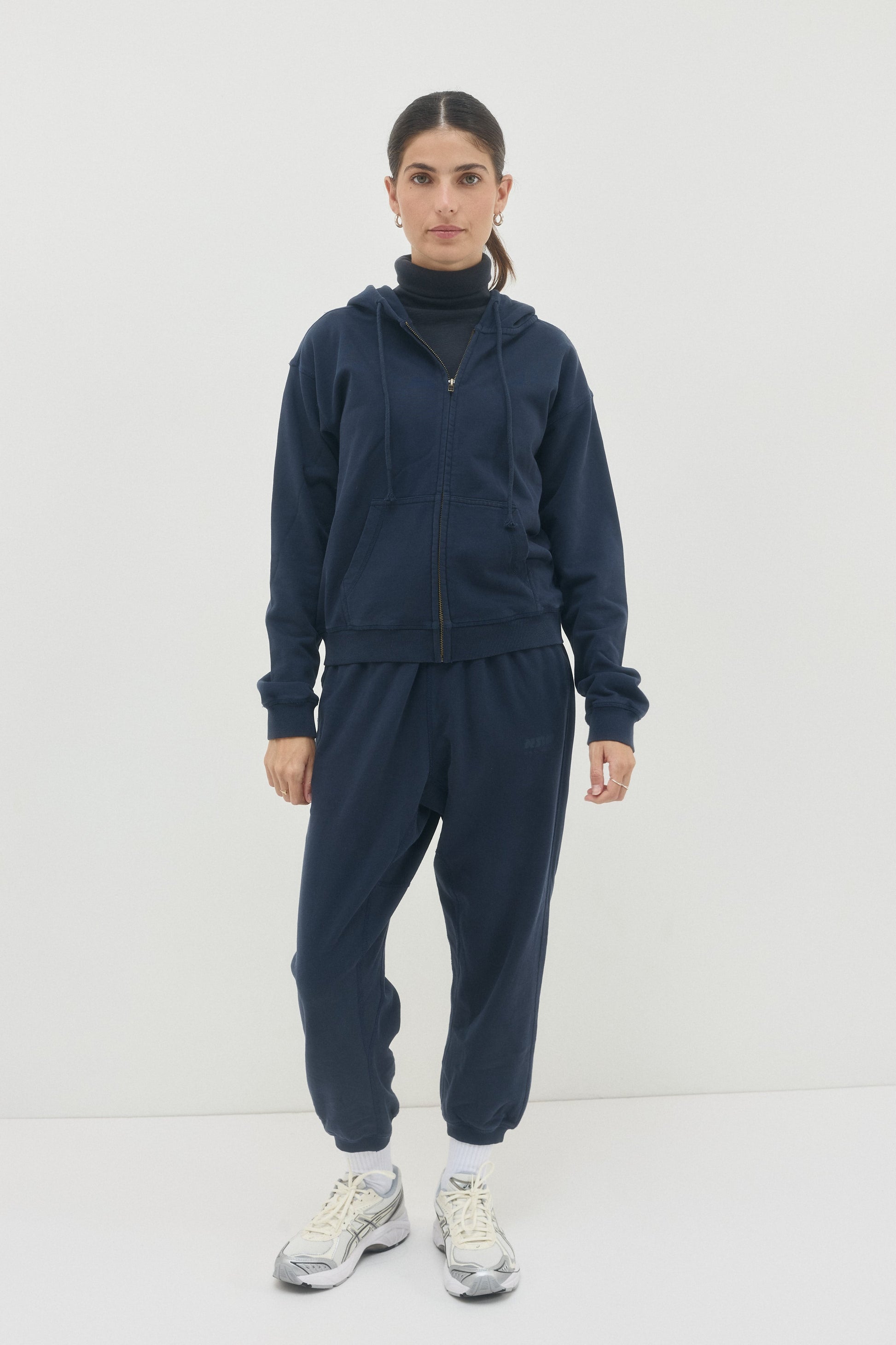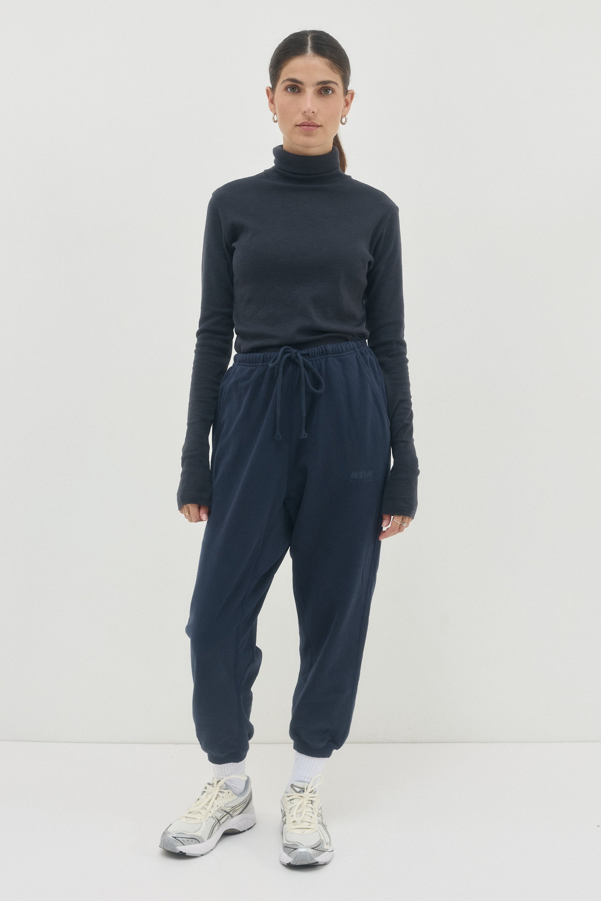 Relaxed-fit sweatpants with an elastic waistband and drawstring, featuring a long rise, two side pockets, and a back pocket with a zipper.