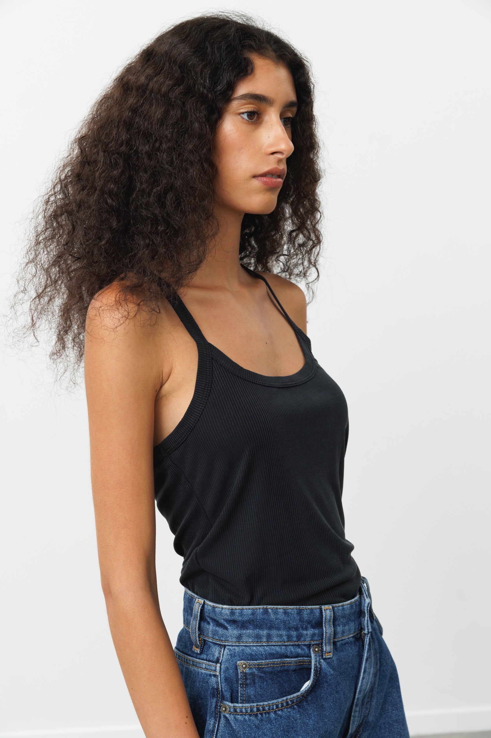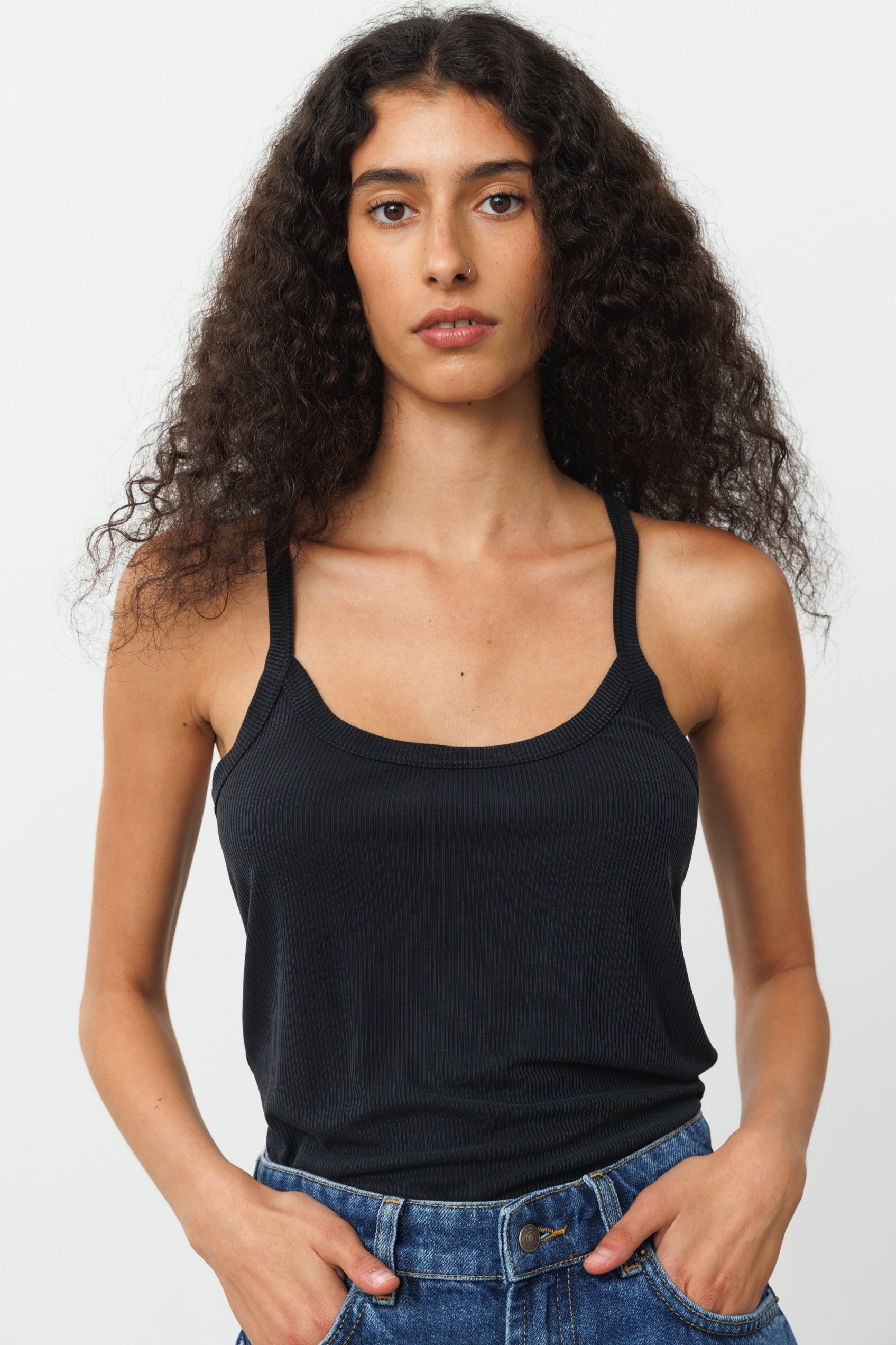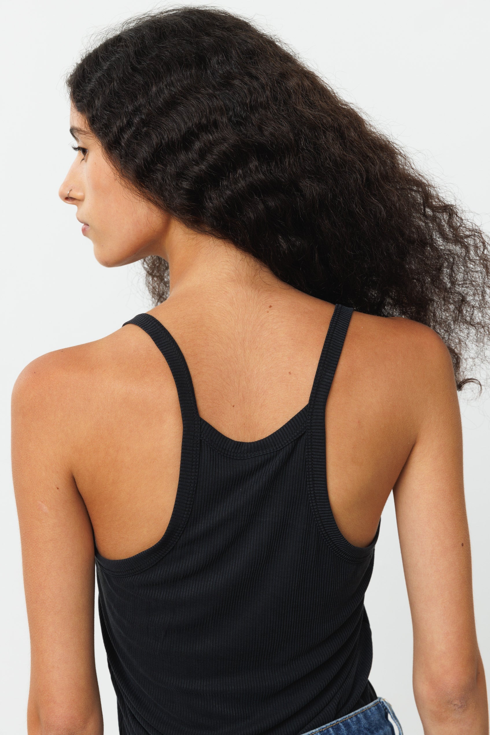 Spaghetti strap ribbed top with a round neckline. Fitted silhouette.