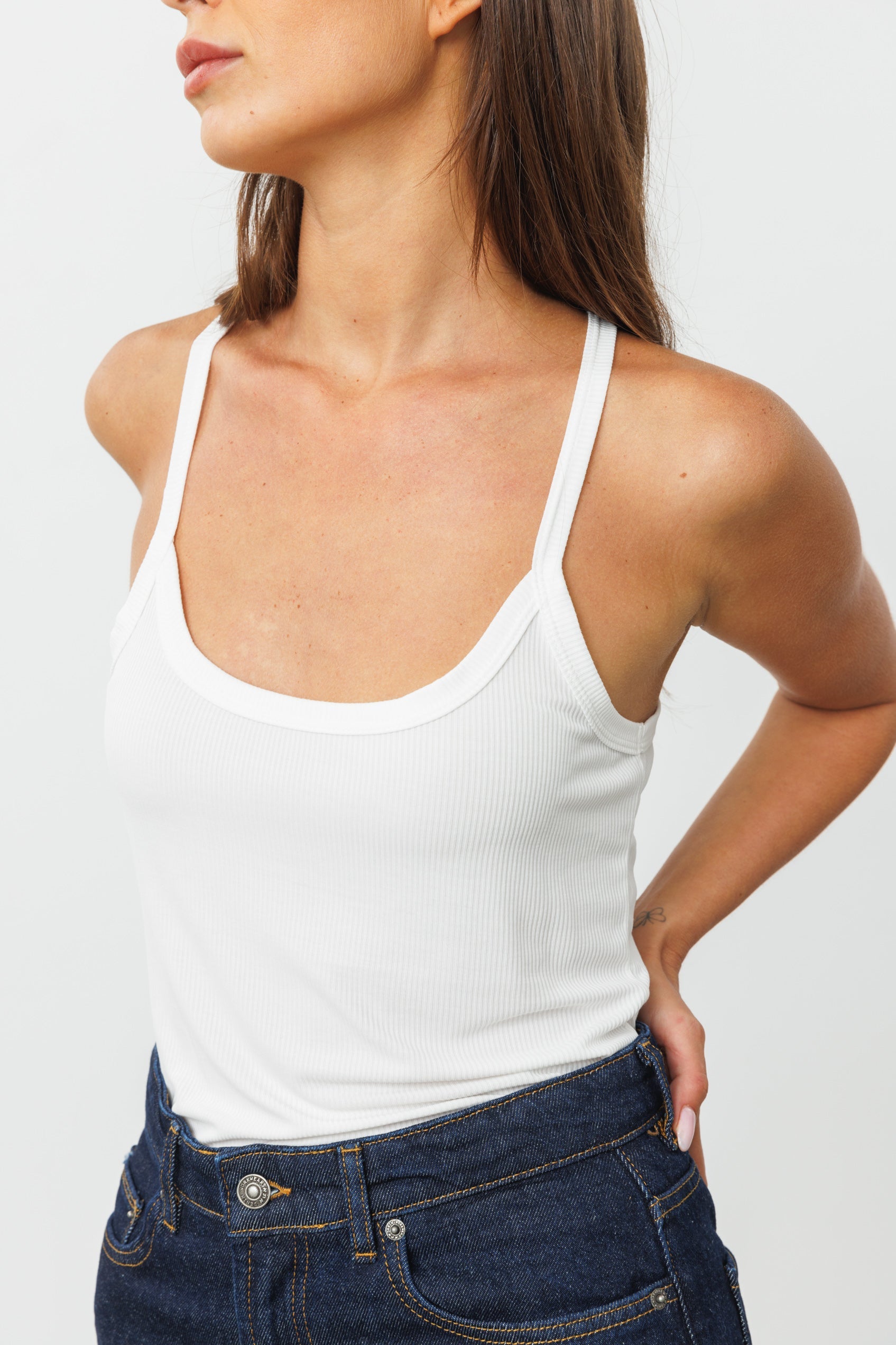 Spaghetti strap ribbed top with a round neckline. Fitted silhouette.