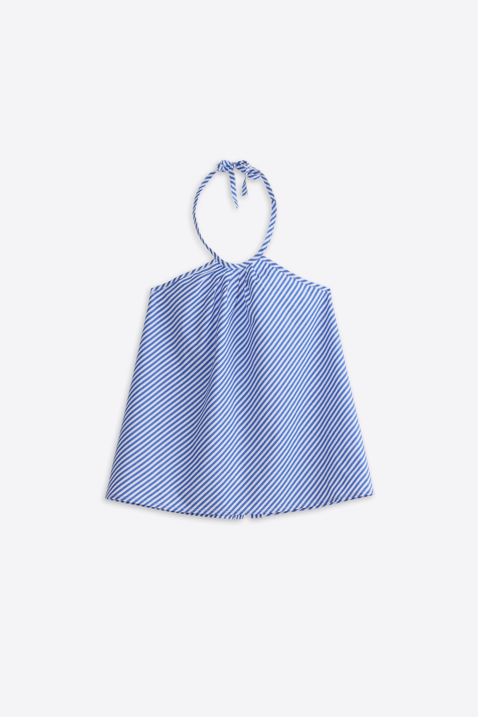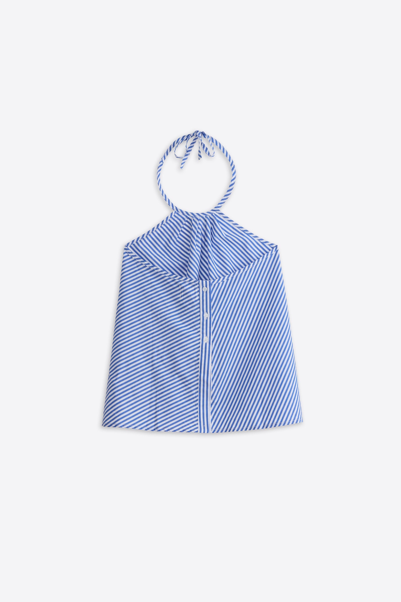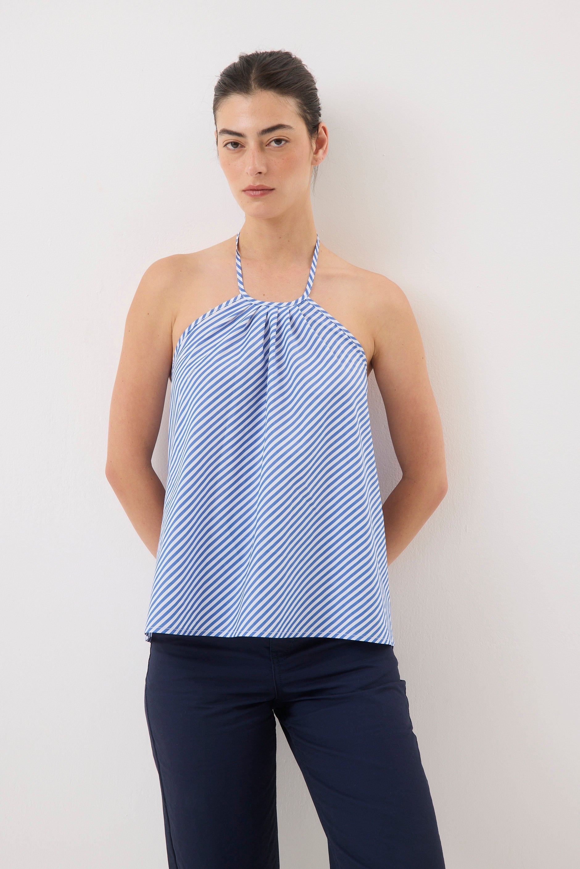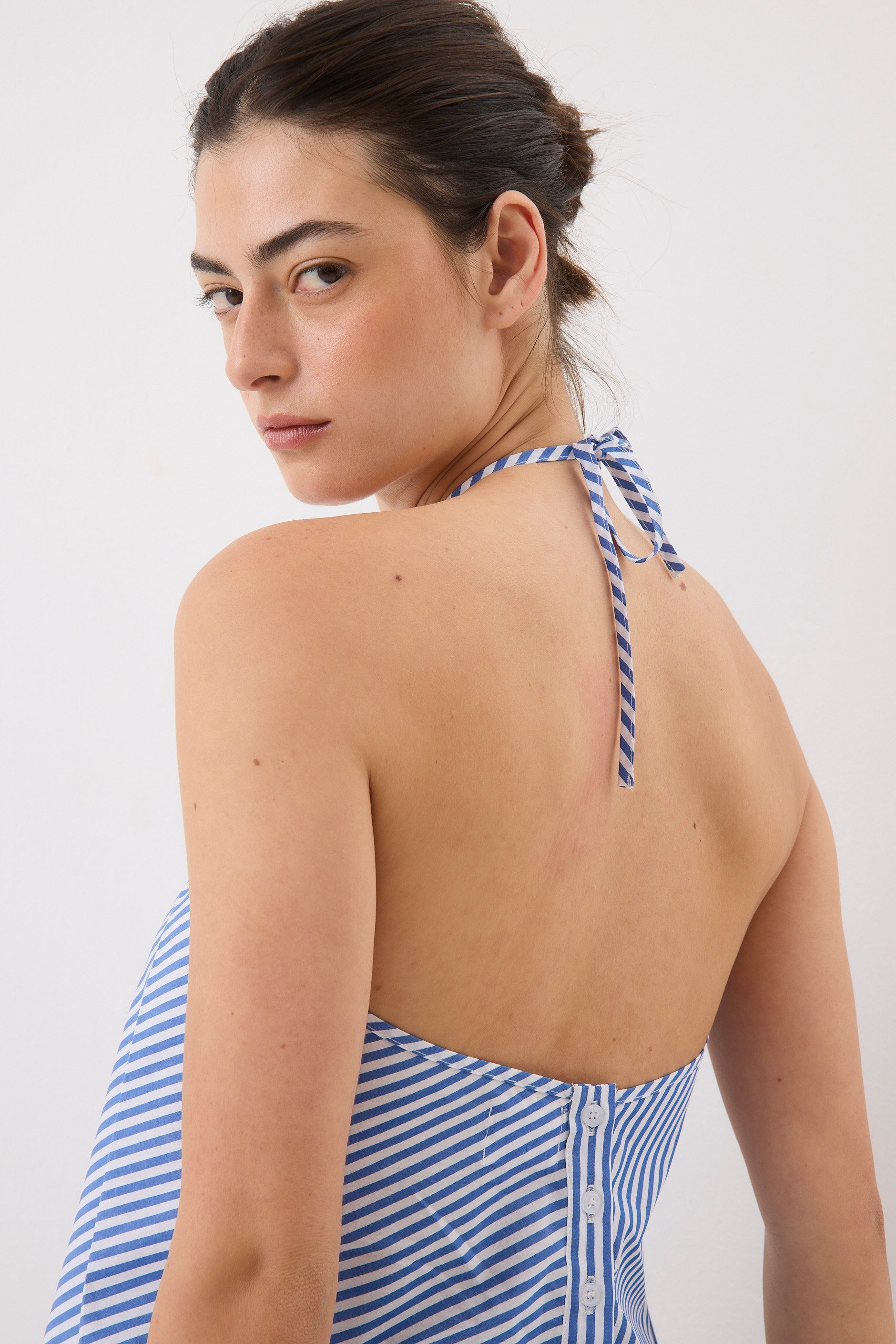 Halter top, tied around the neck with an open back, featuring three buttons that fasten at the back and a slit.