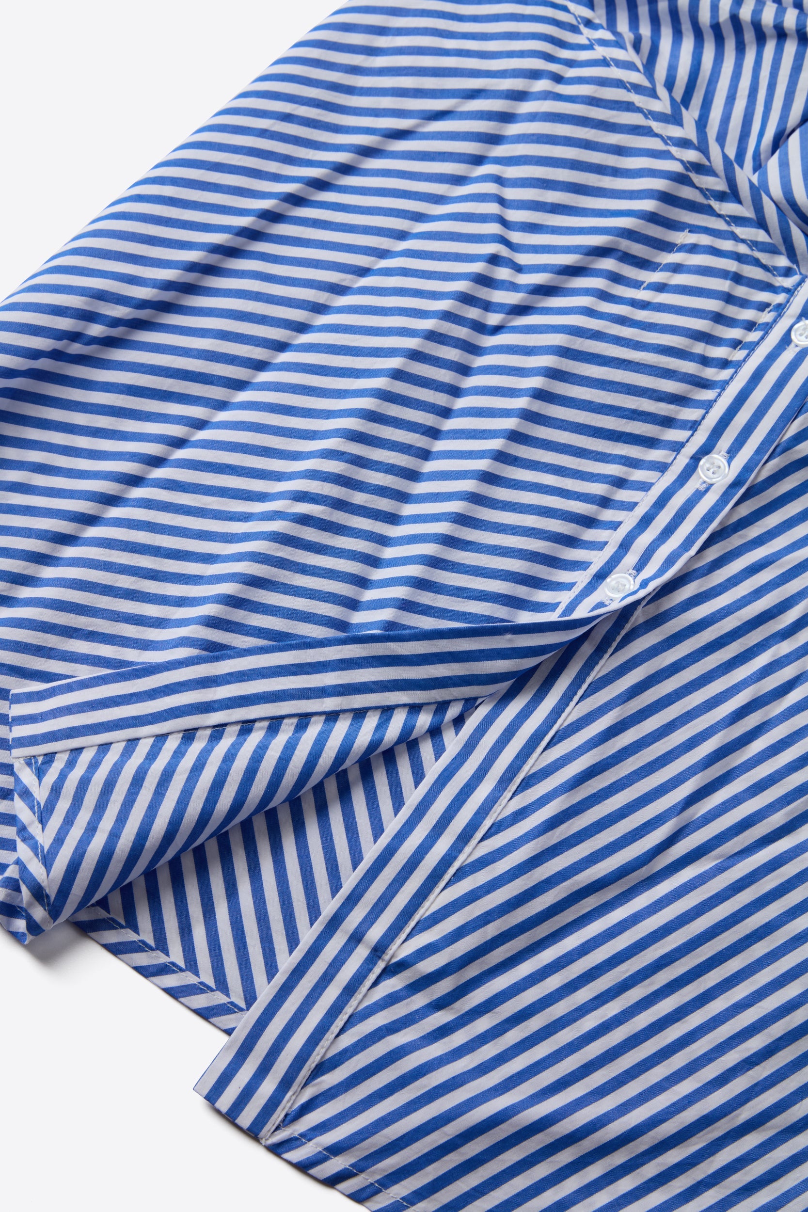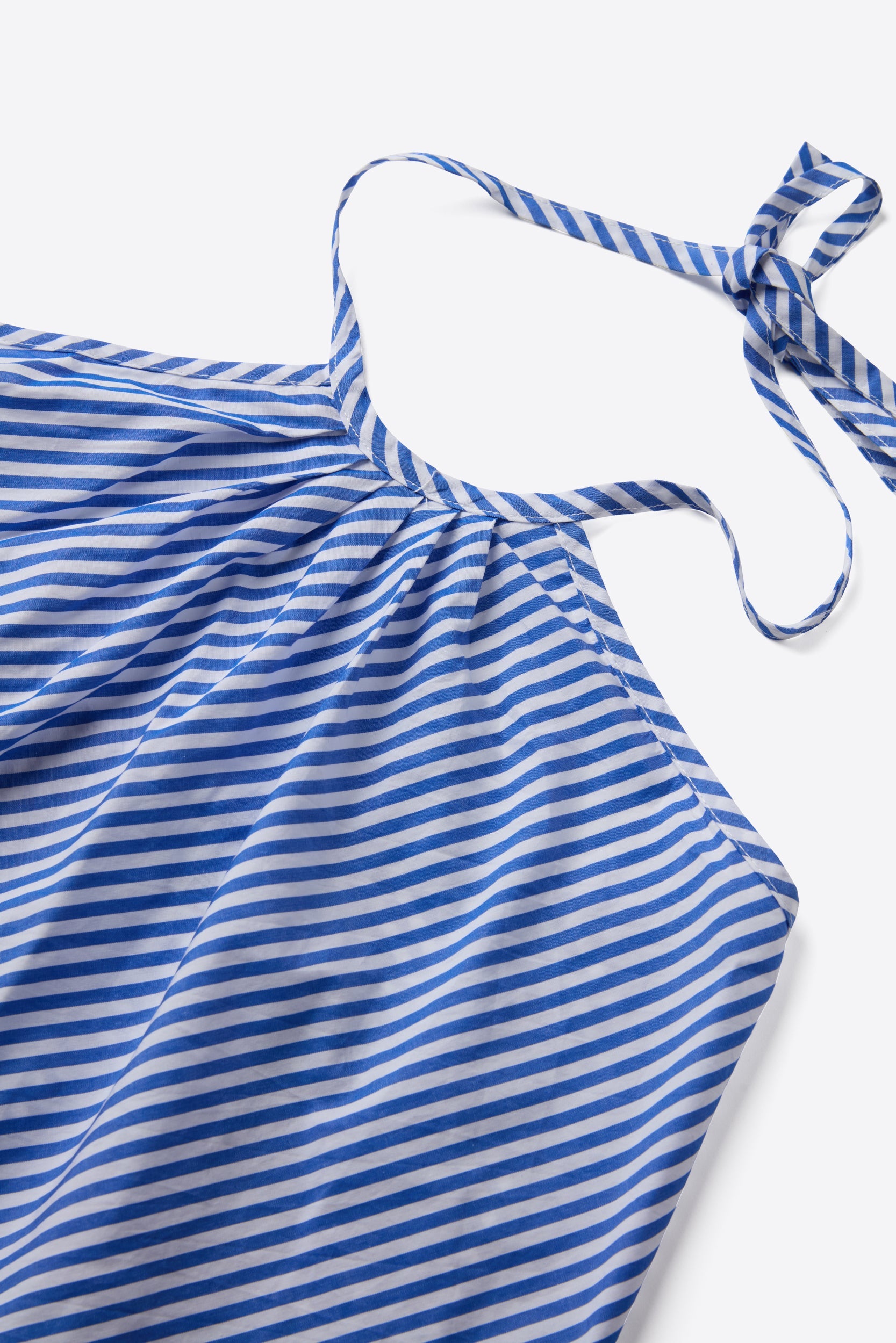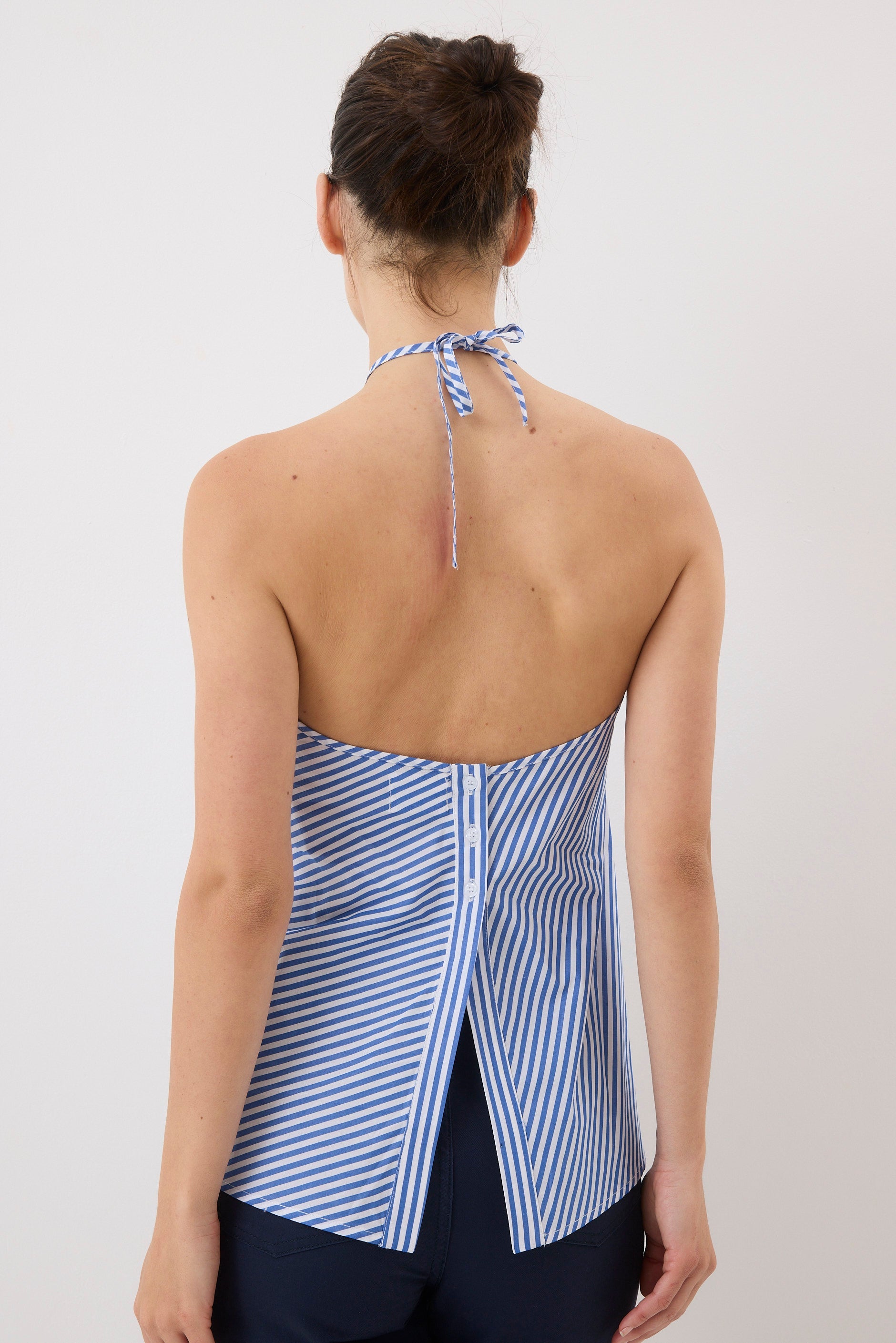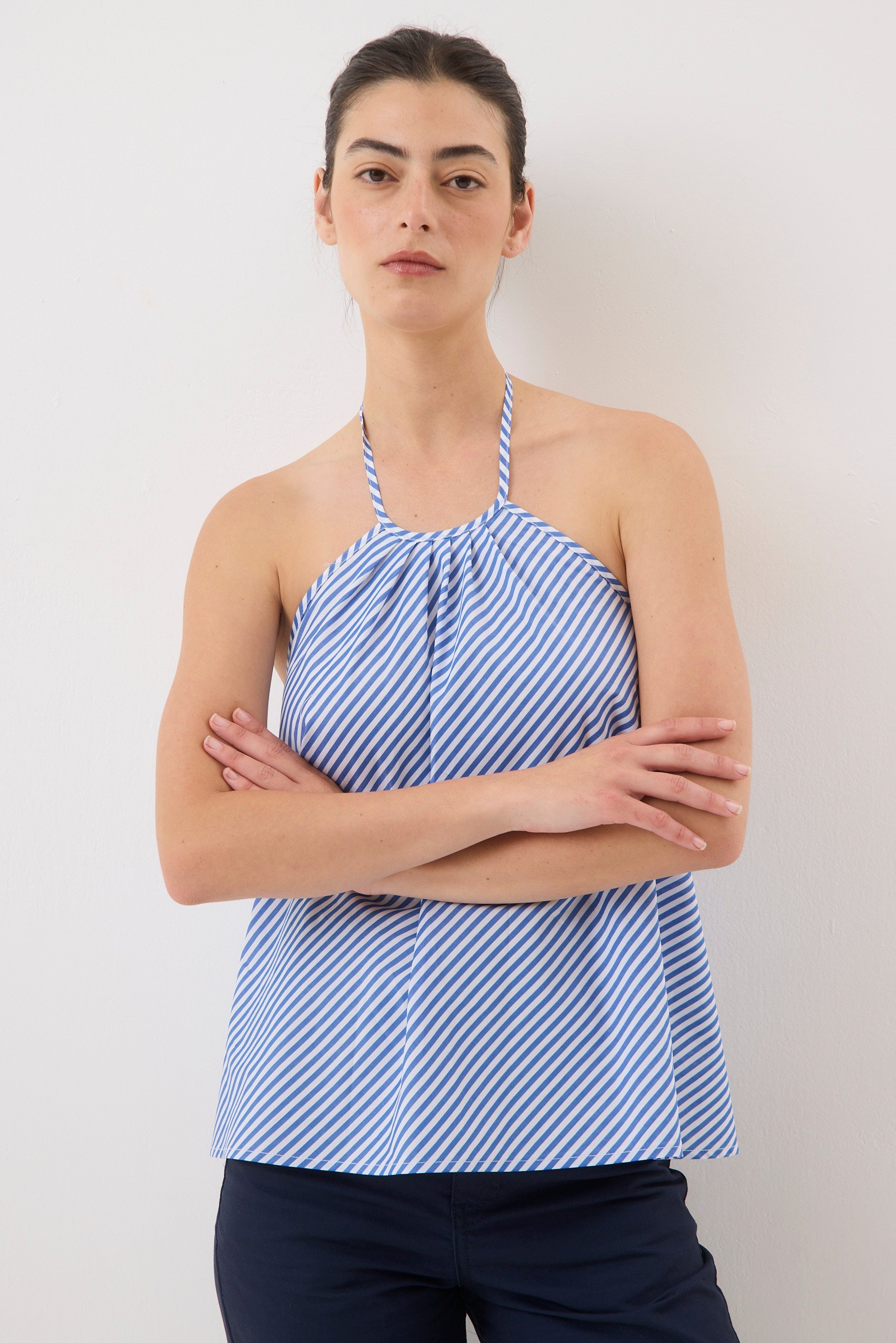 Halter top, tied around the neck with an open back, featuring three buttons that fasten at the back and a slit.