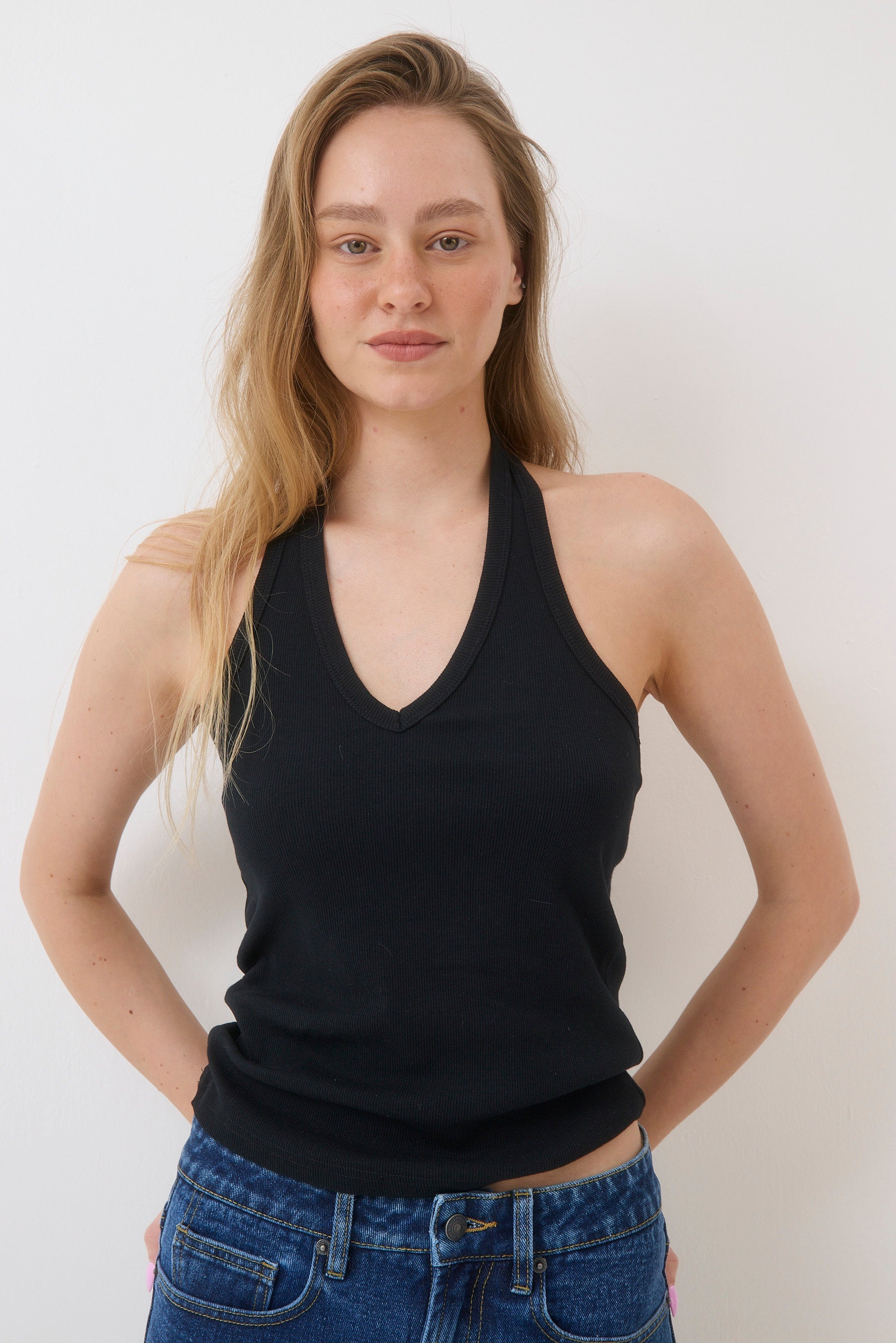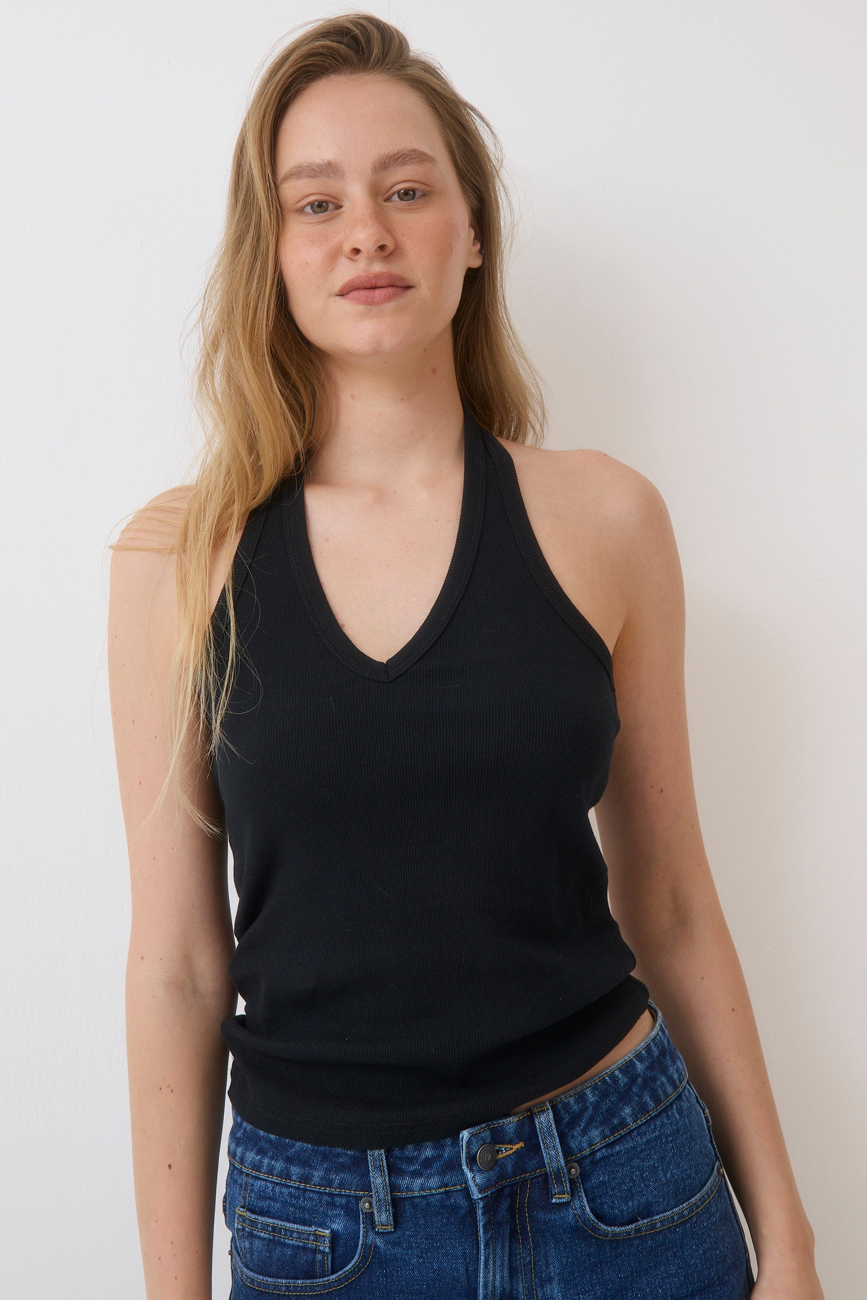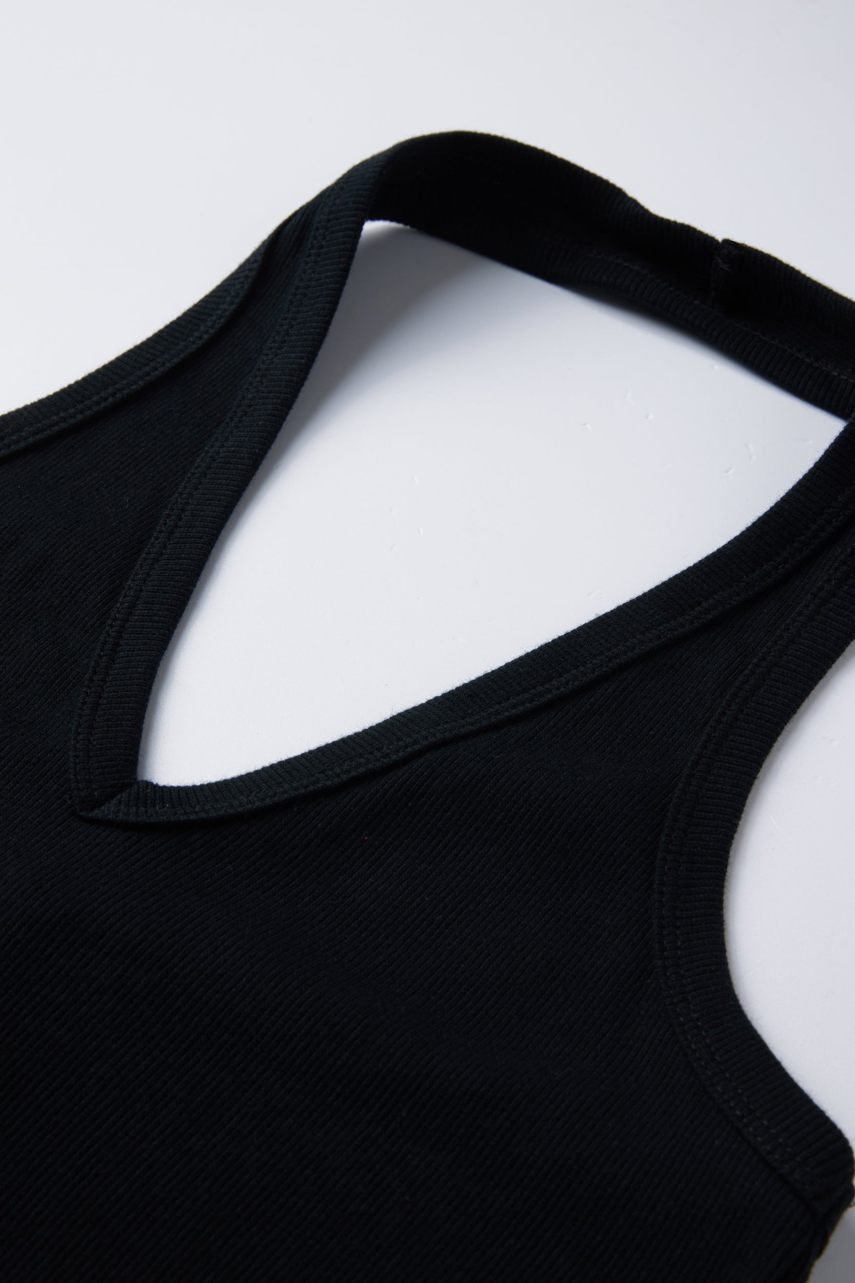 A ribbed tank top with a sleek halter neckline, designed to be worn as a close-fitting, body-hugging shirt. The halter neckline features a clean finish without a tie.