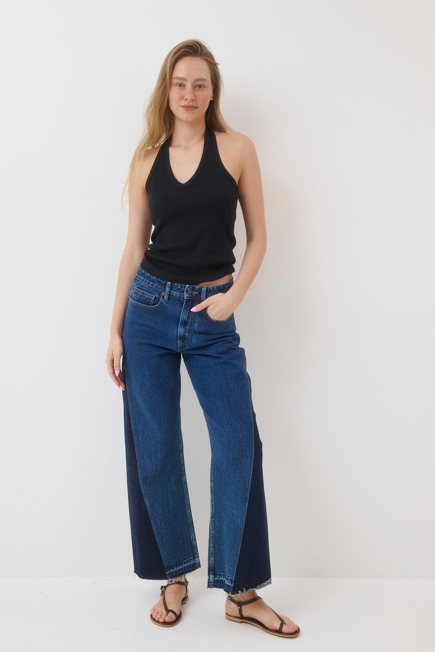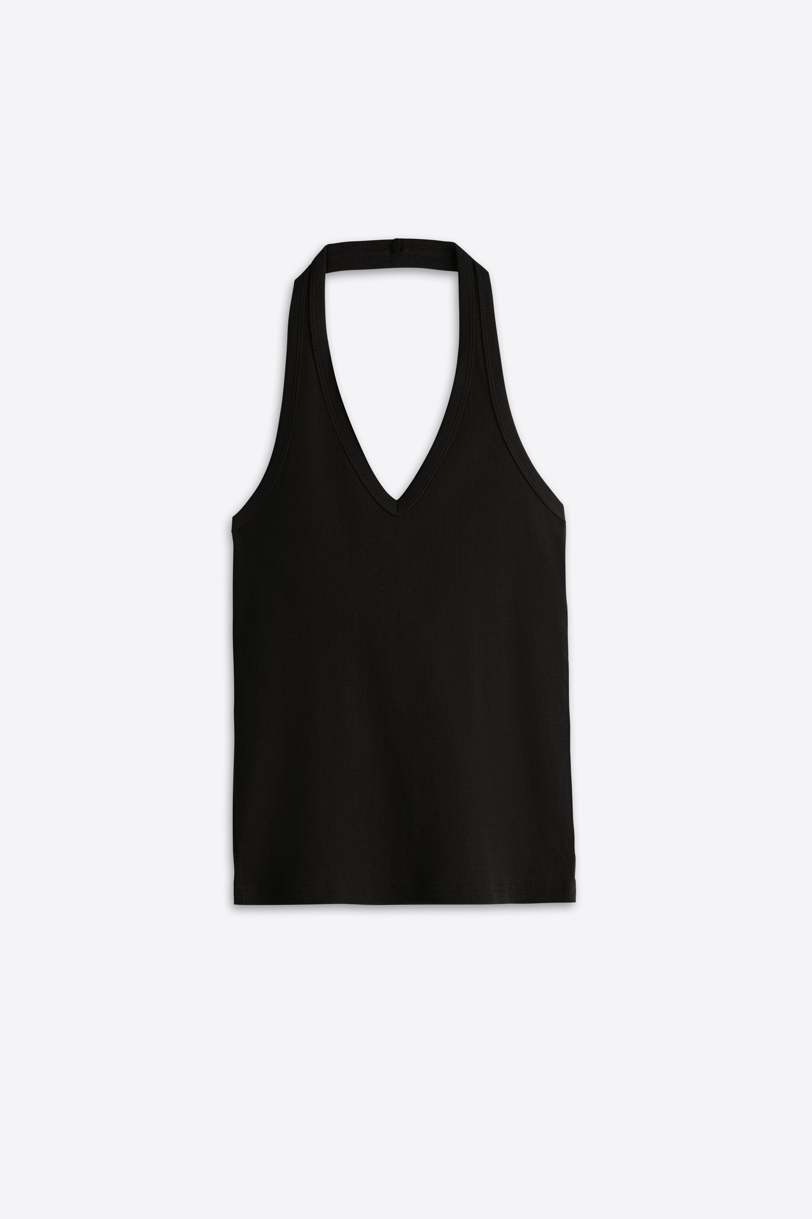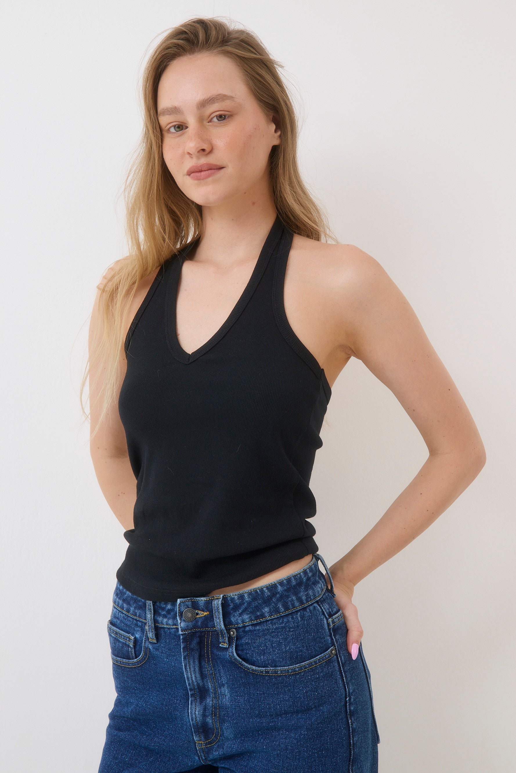A ribbed tank top with a sleek halter neckline, designed to be worn as a close-fitting, body-hugging shirt. The halter neckline features a clean finish without a tie.