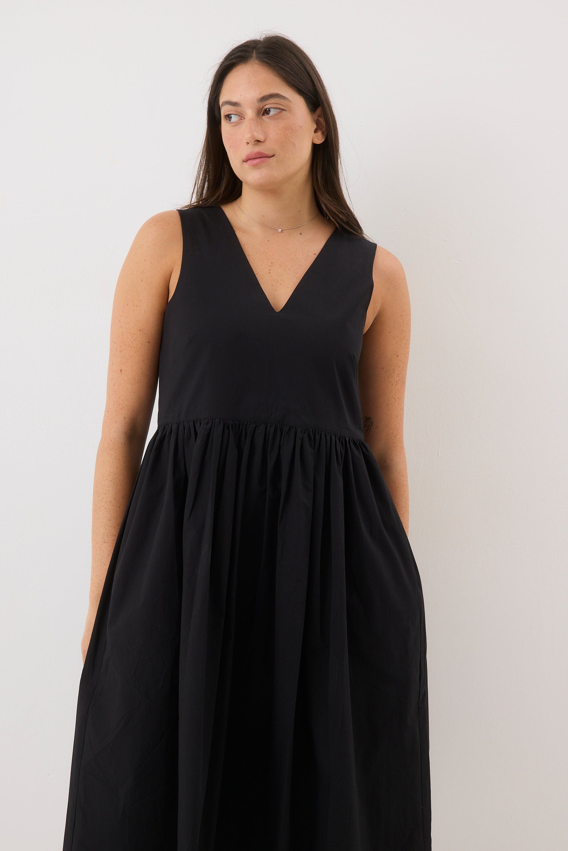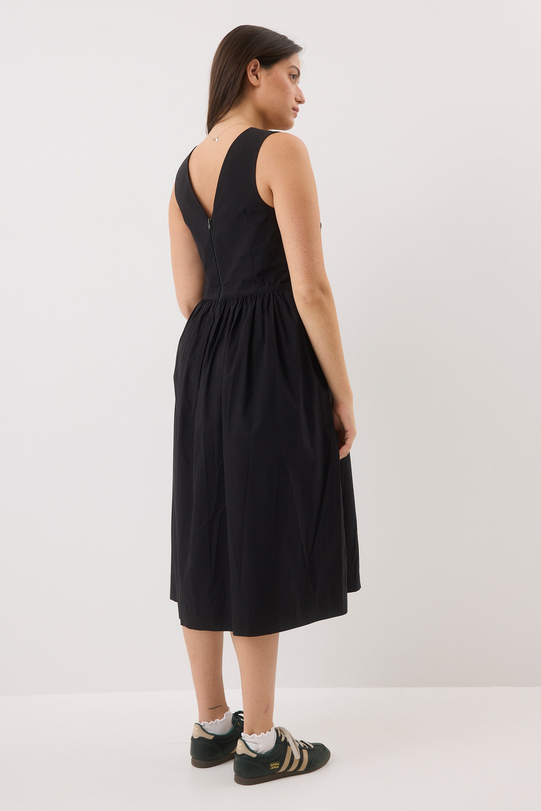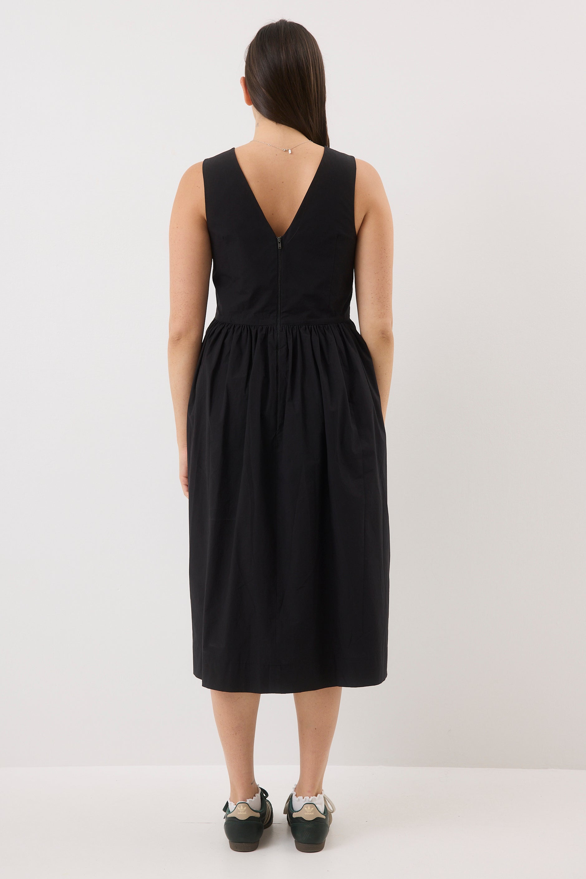A knee-length, loose-fit dress with straps. It features a zipper at the back with a V-shaped neckline.