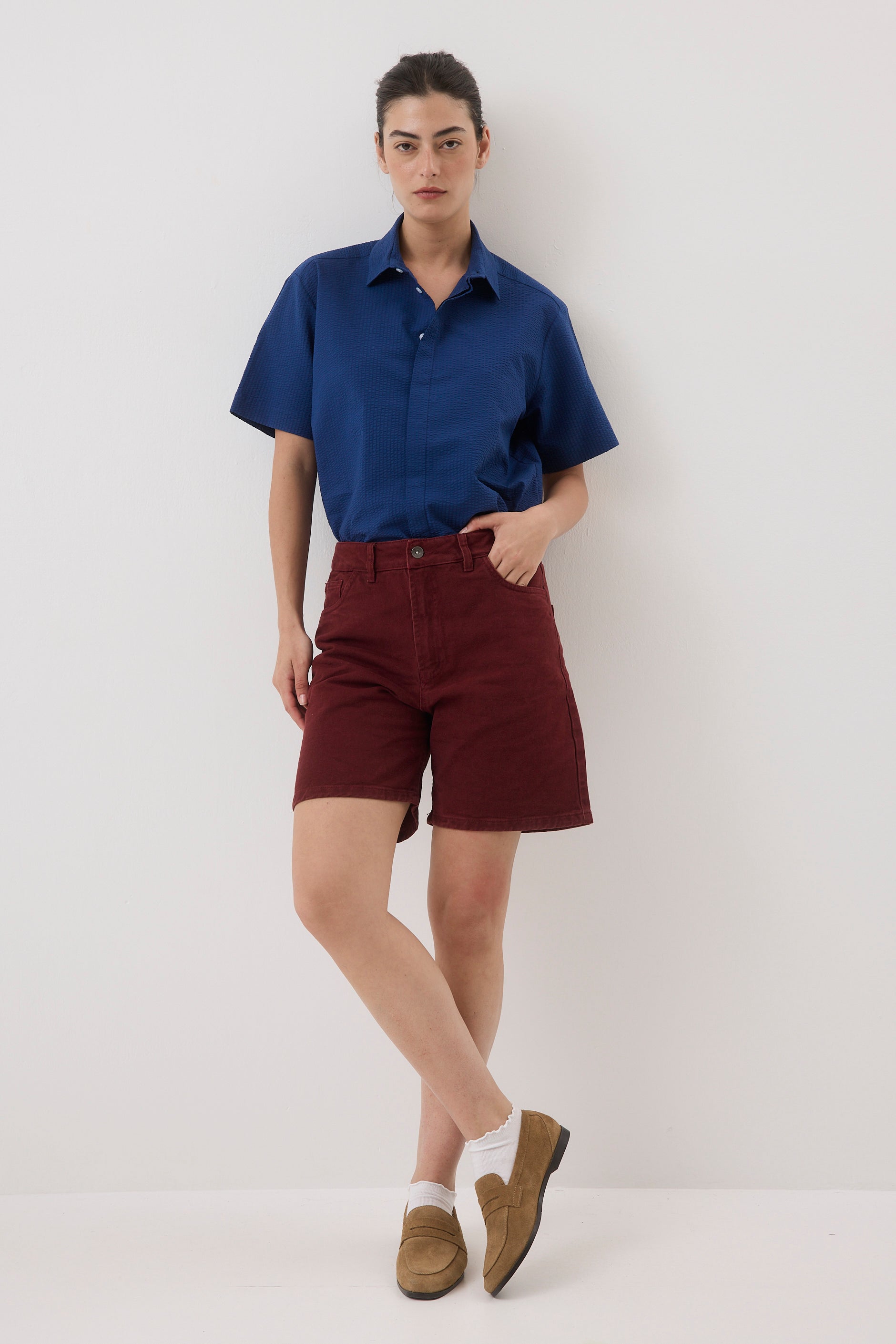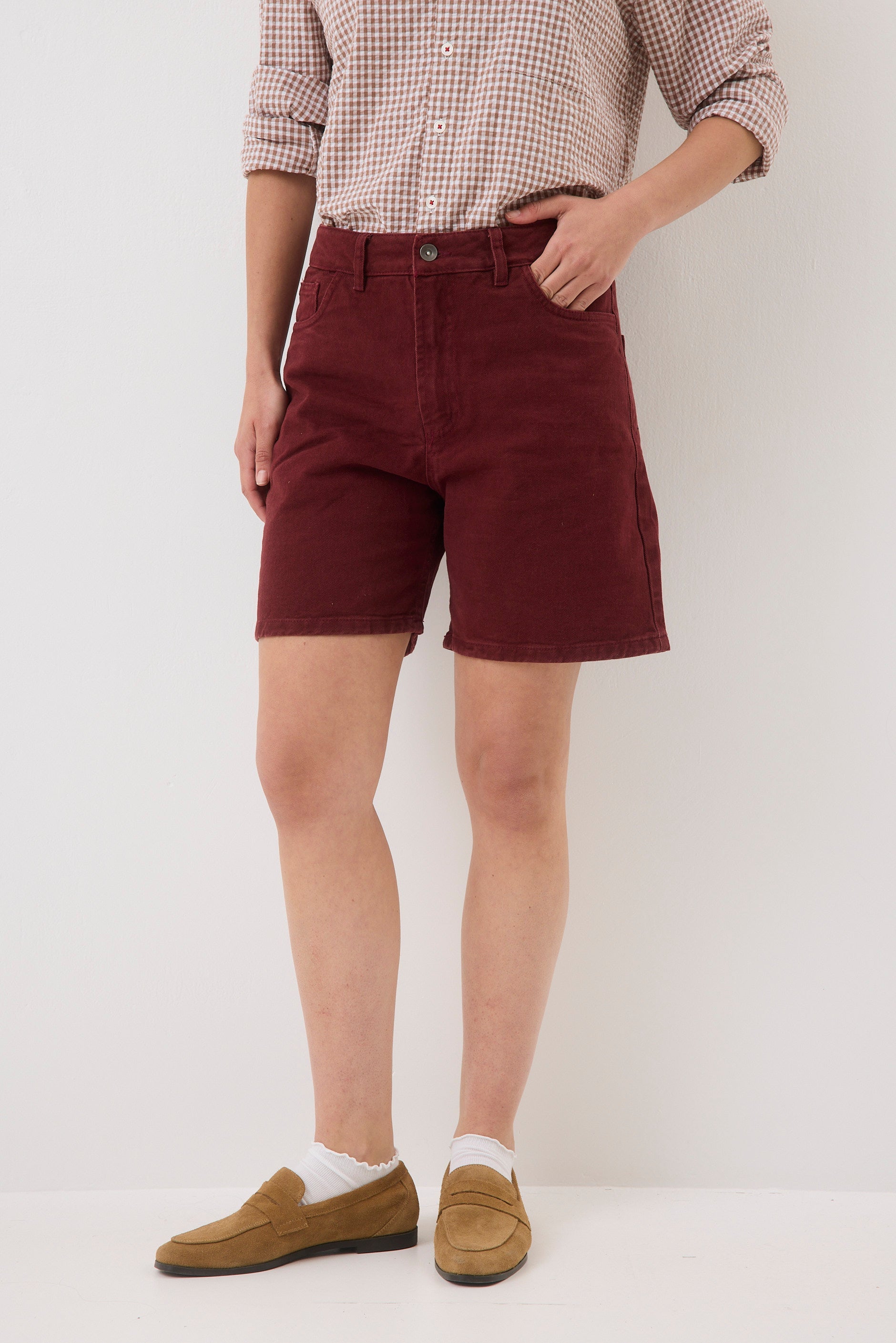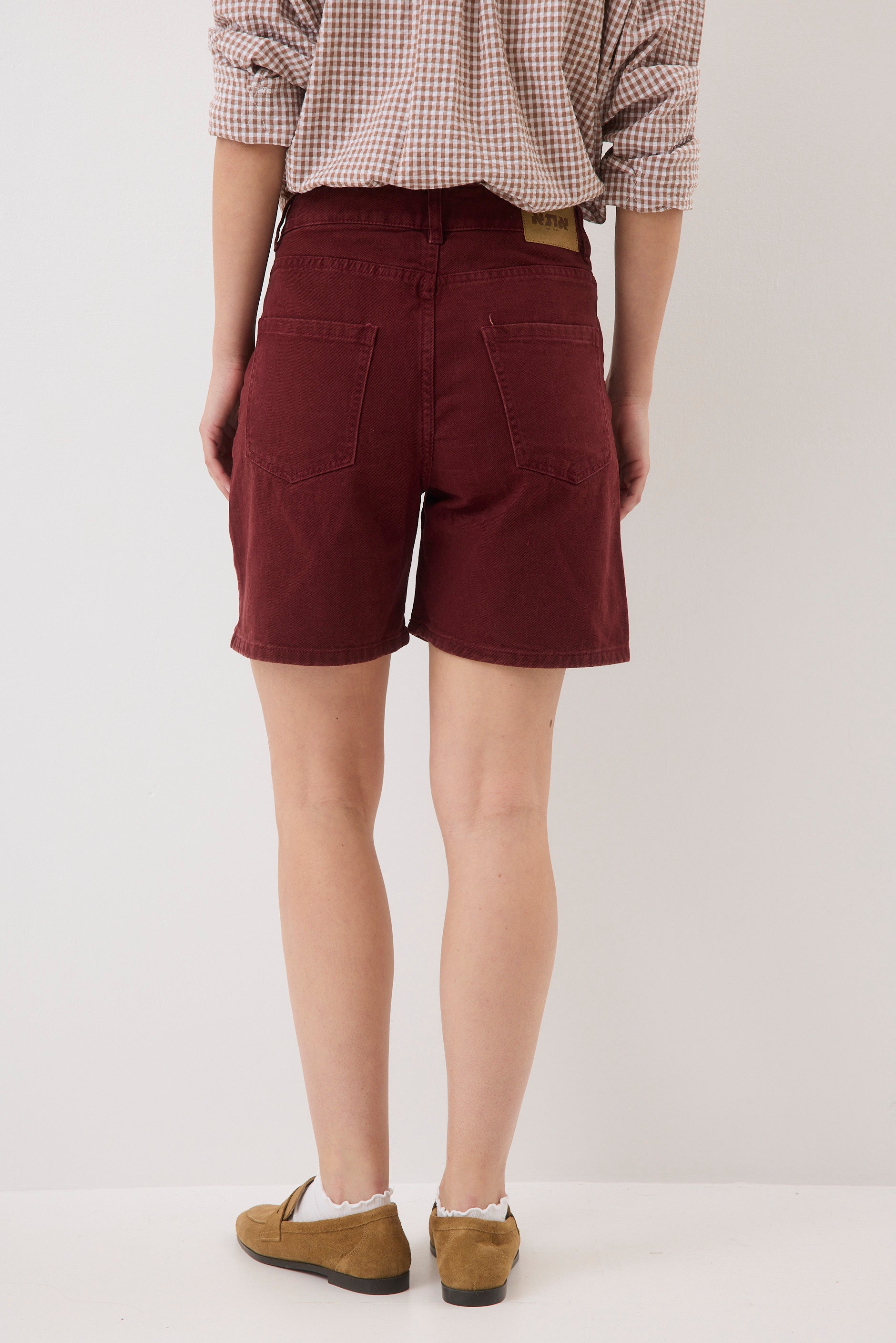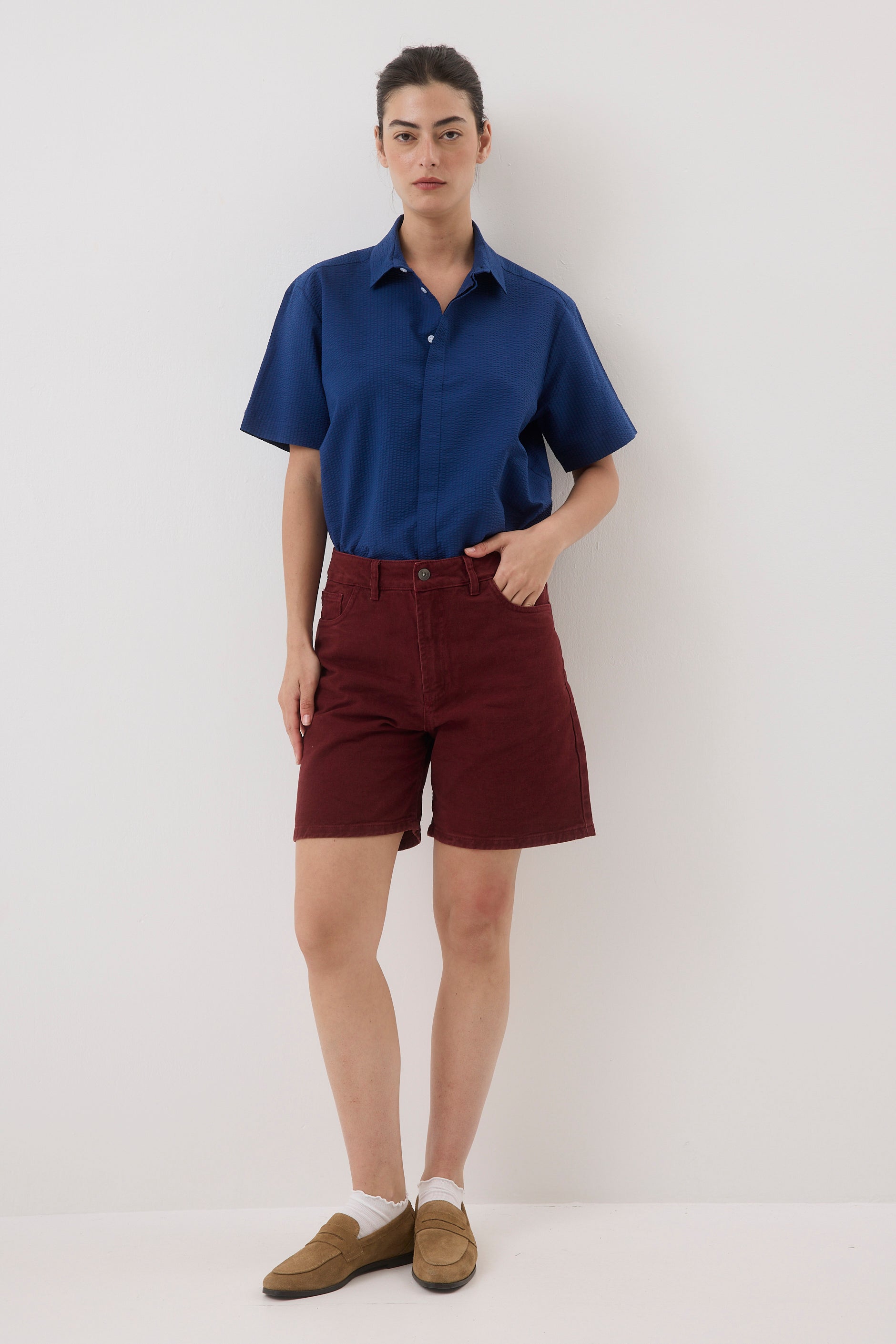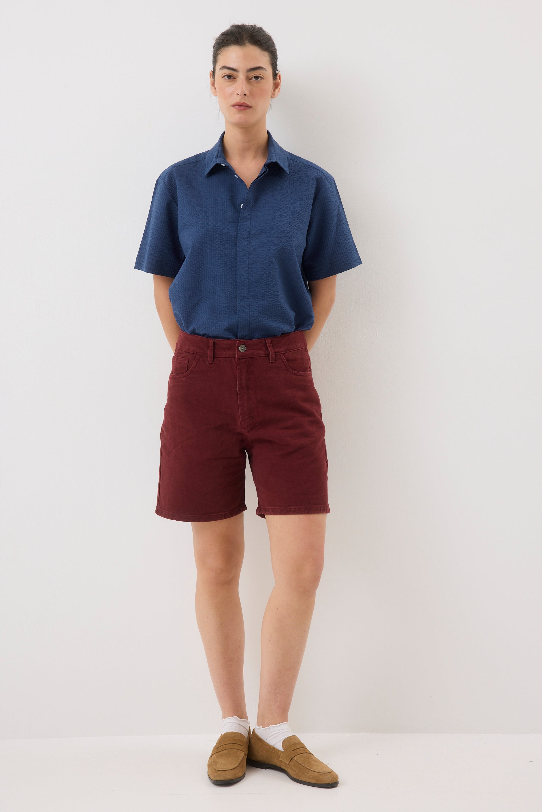Fitted cotton shorts, with mid-rise waist. Five-pocket design. For a looser fit, take one size up.