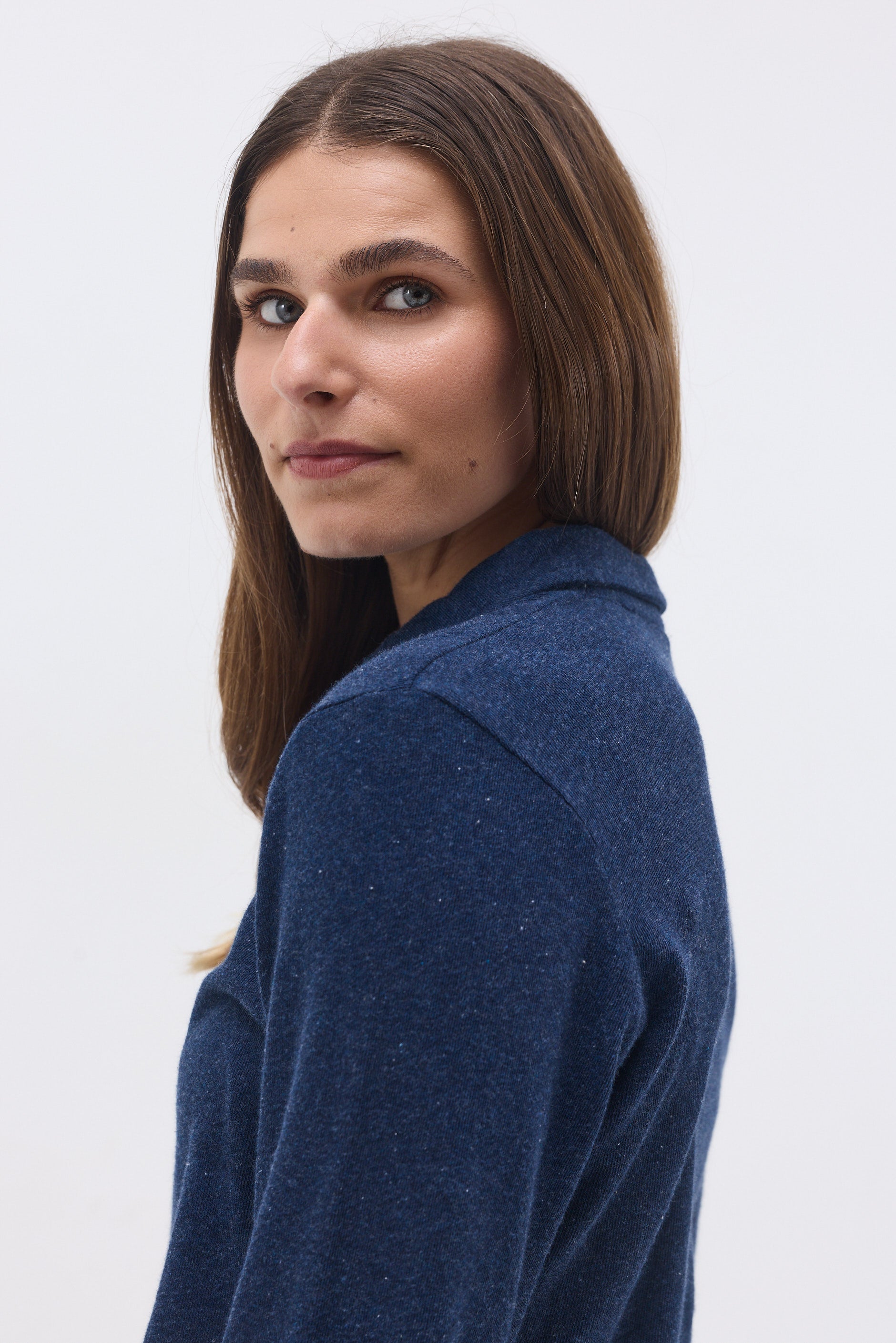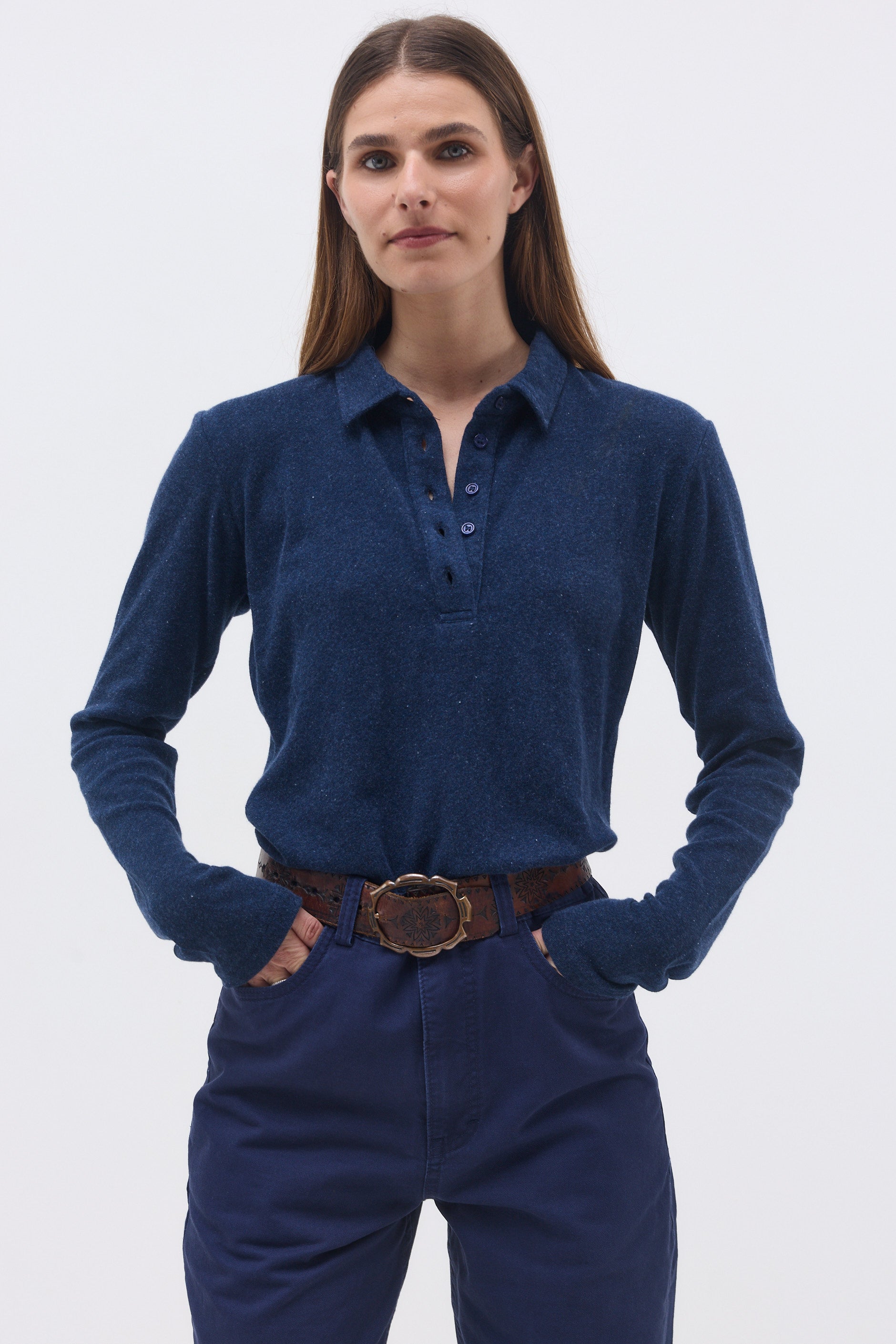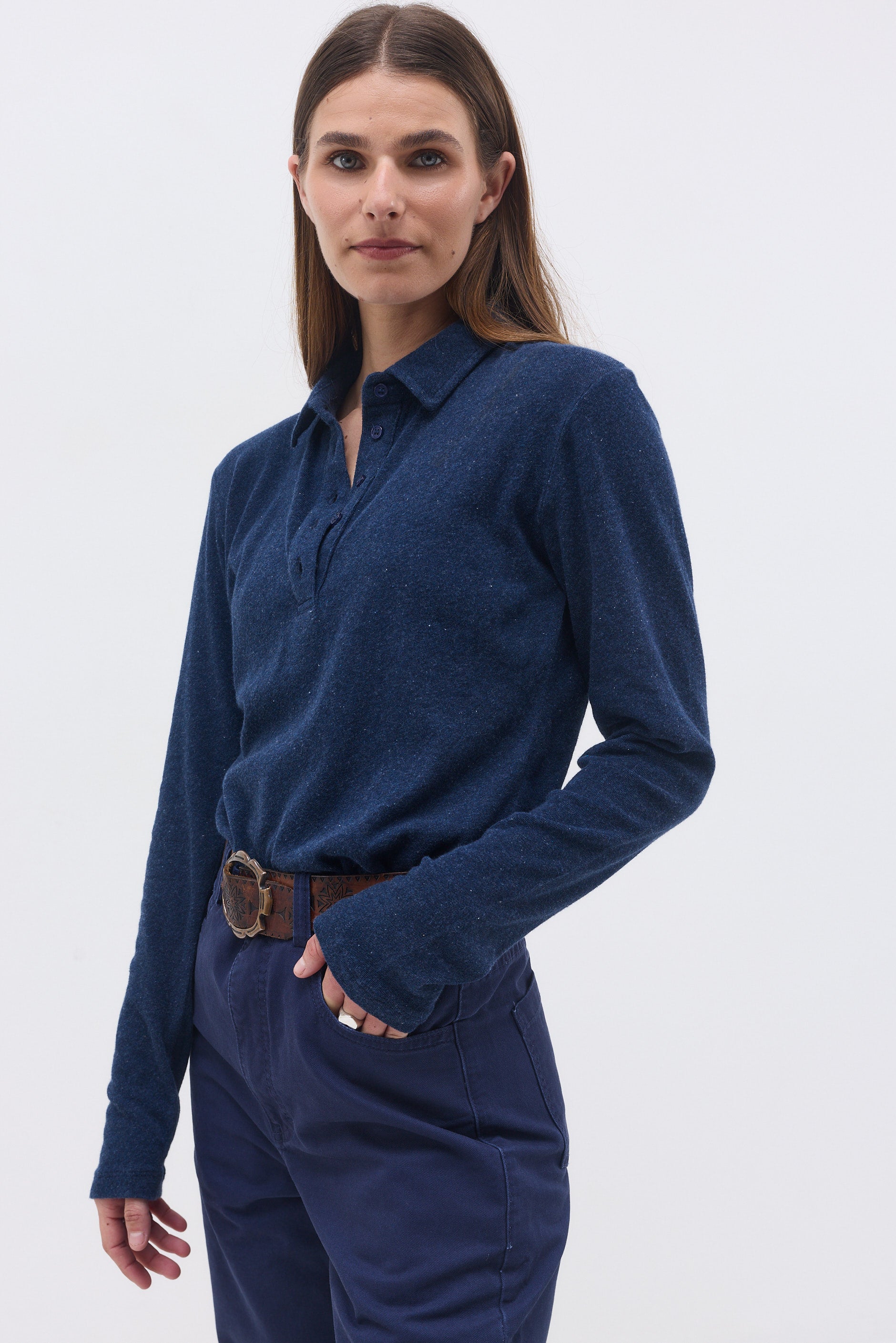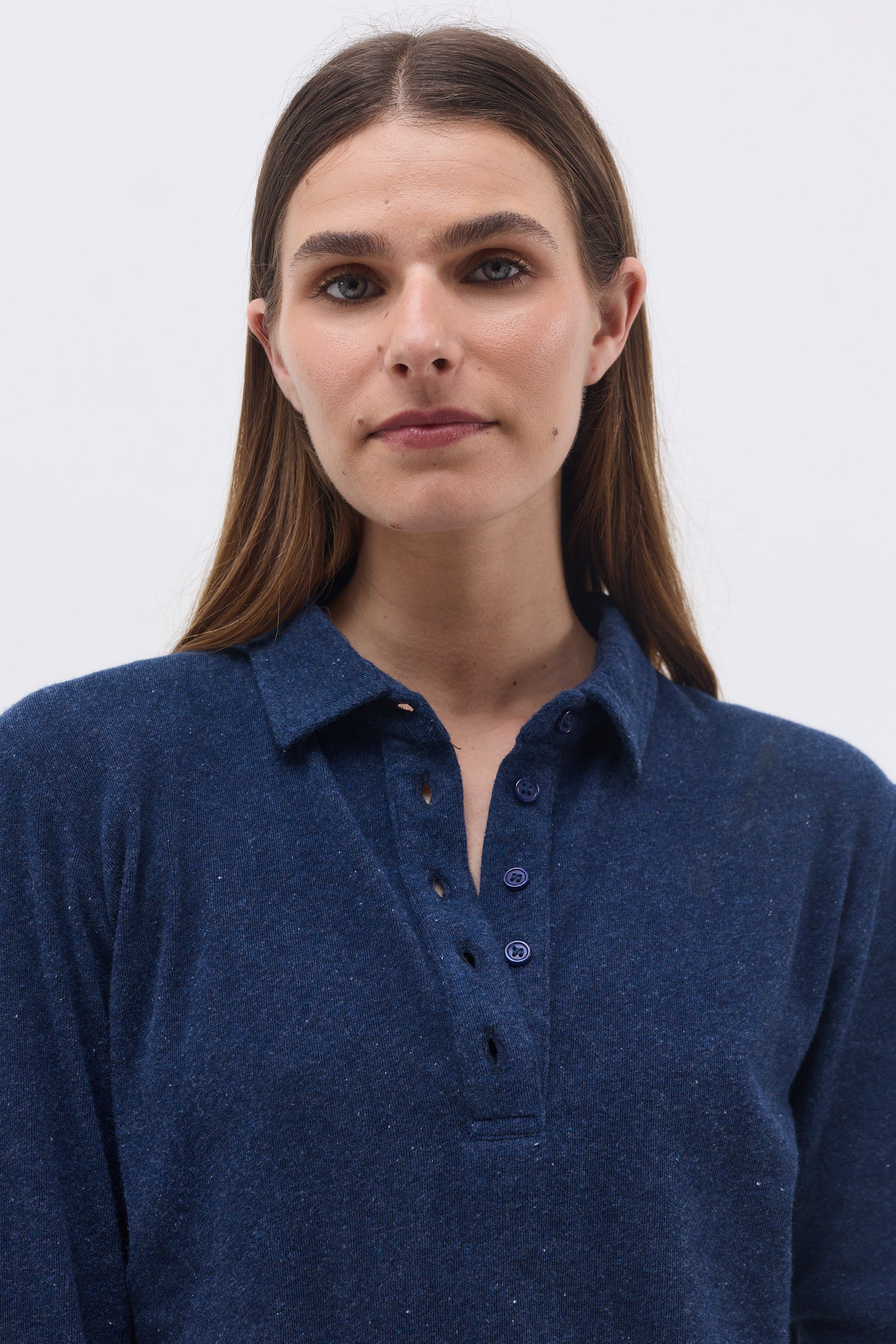 Long-sleeve fitted T-shirt with 4 buttons and a neckline.