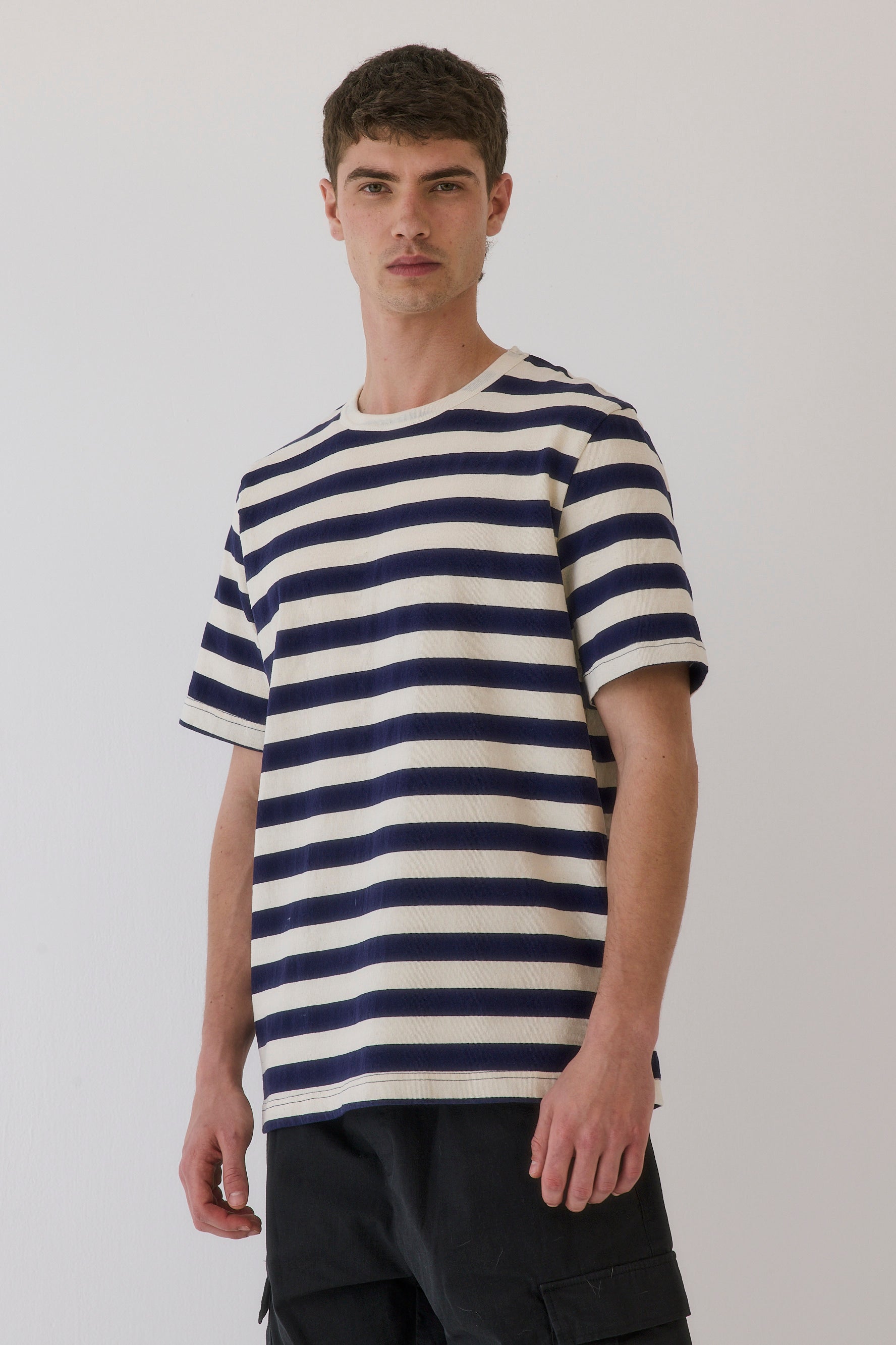A straight-cut T-shirt with a crew neck made from ribbed fabric.