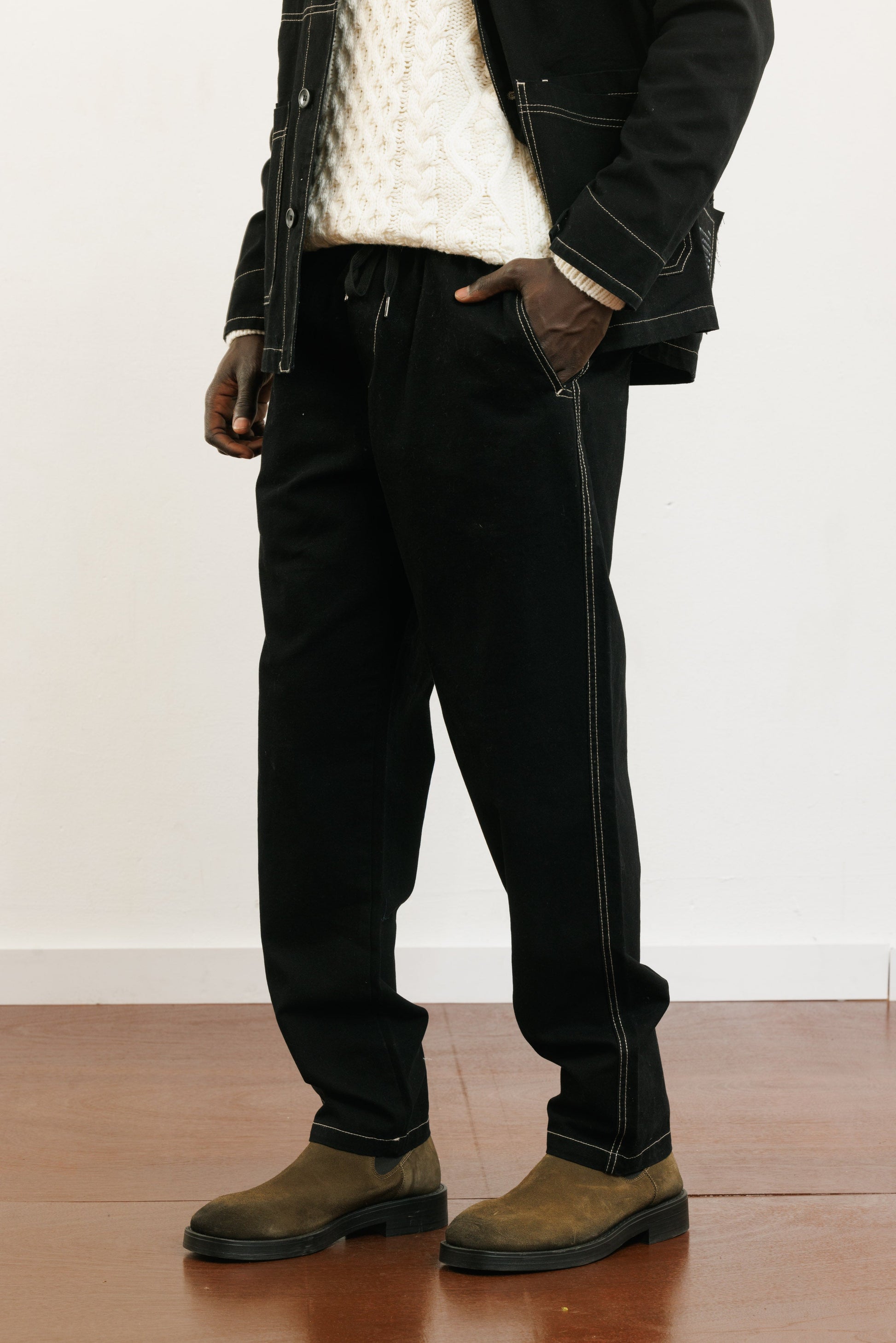 Long pants with two side pockets, an elastic waistband, and a drawstring. Loose fit, true to size.