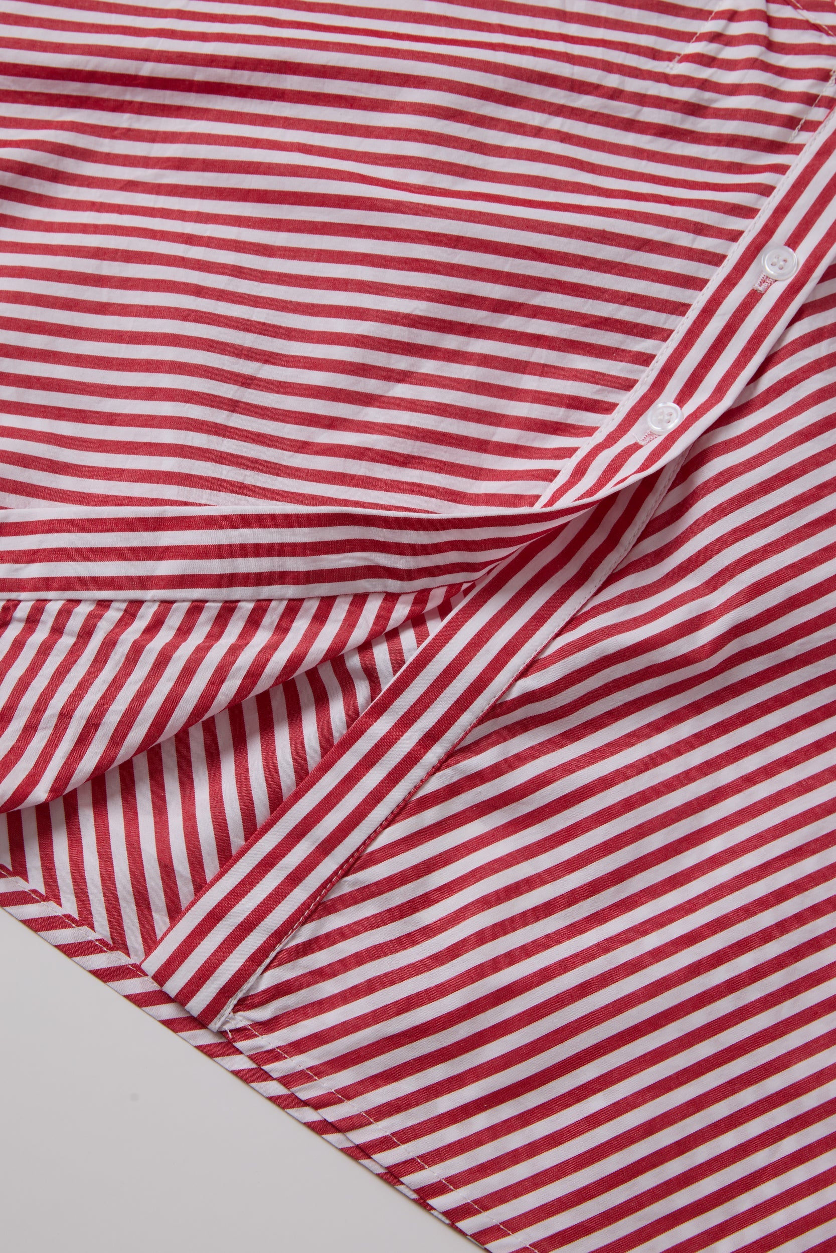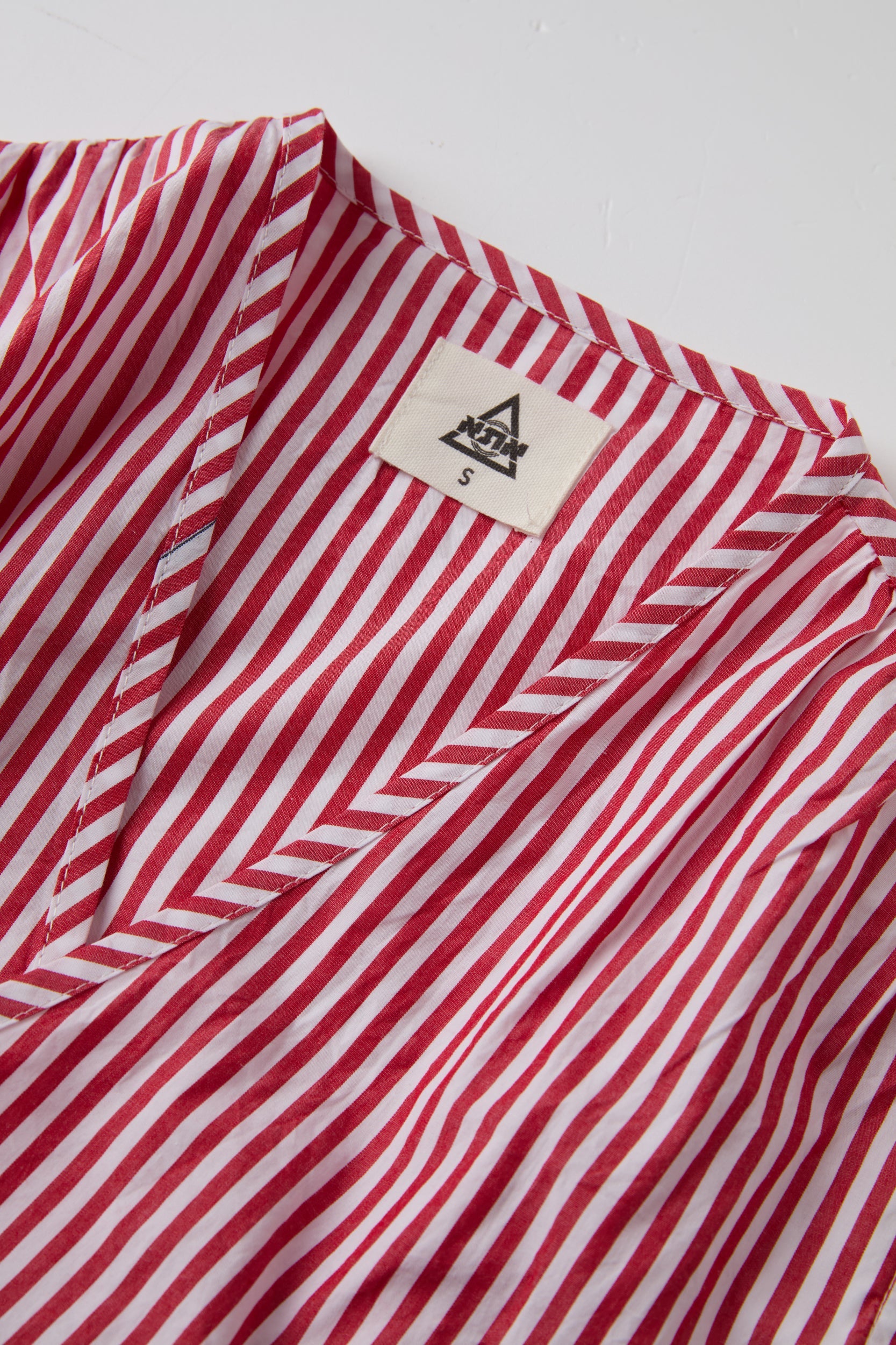 Midi-length wrap dress with a cut and gathers below the bust. The dress ties with an attached belt that can be fastened at the side or back.