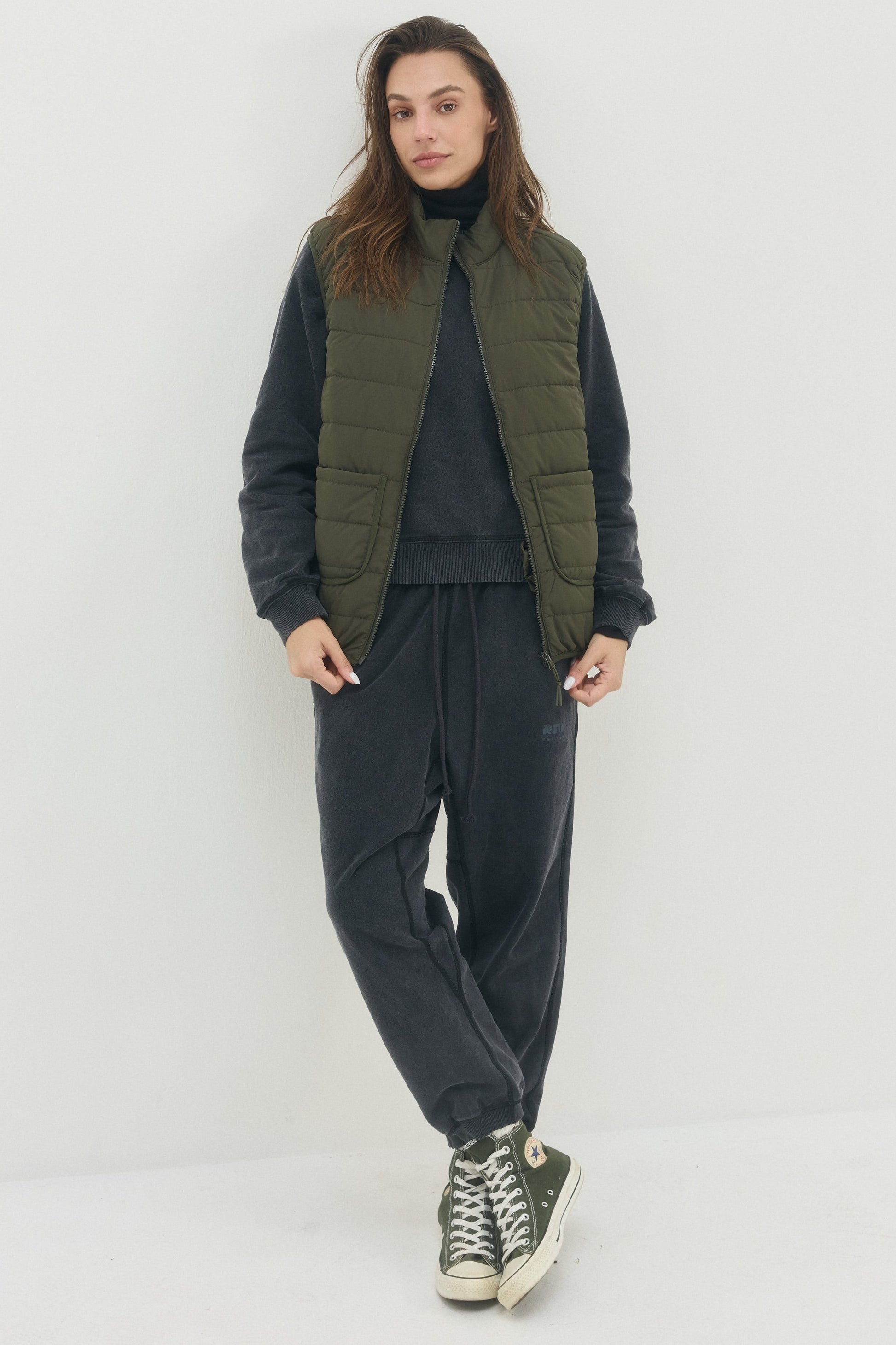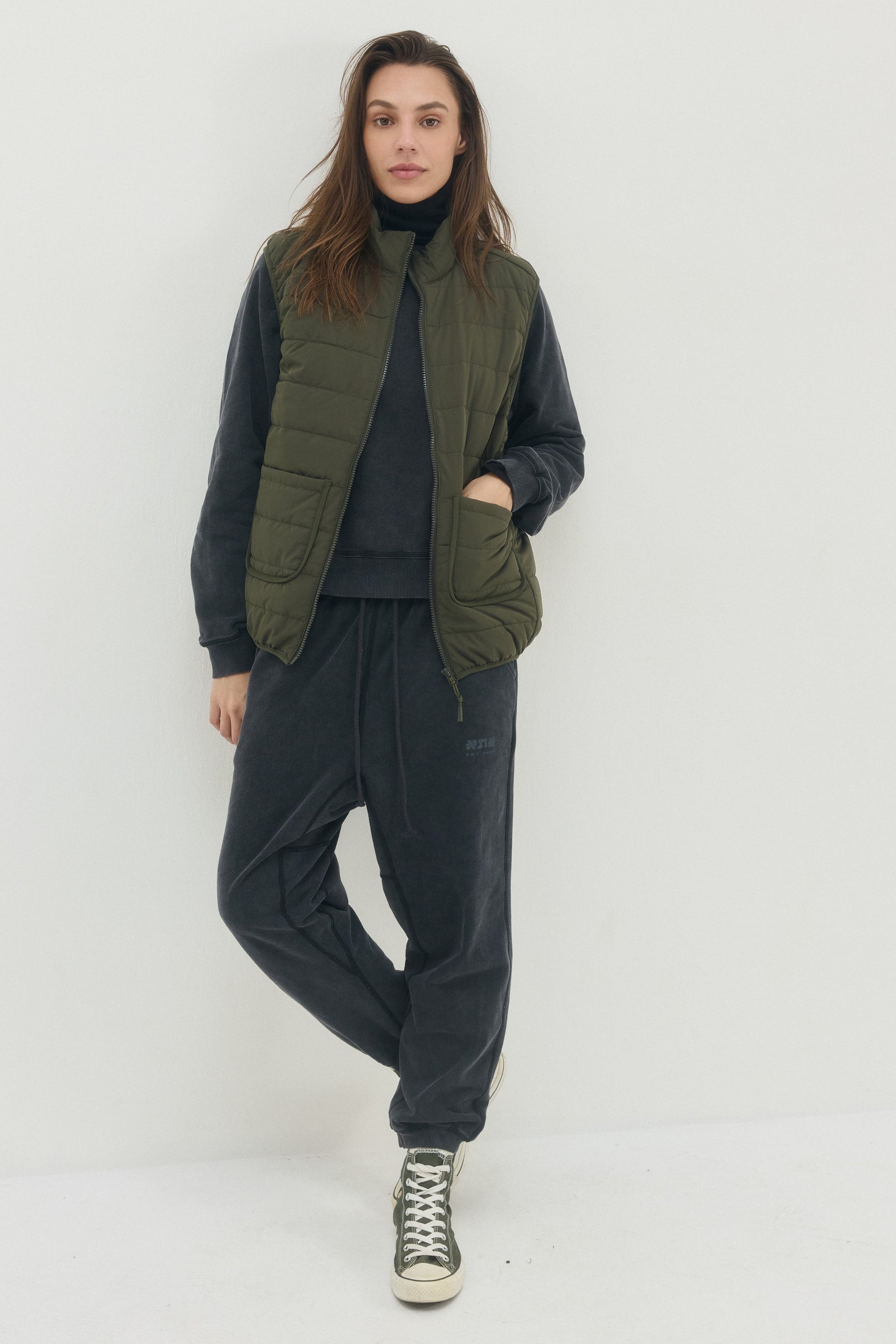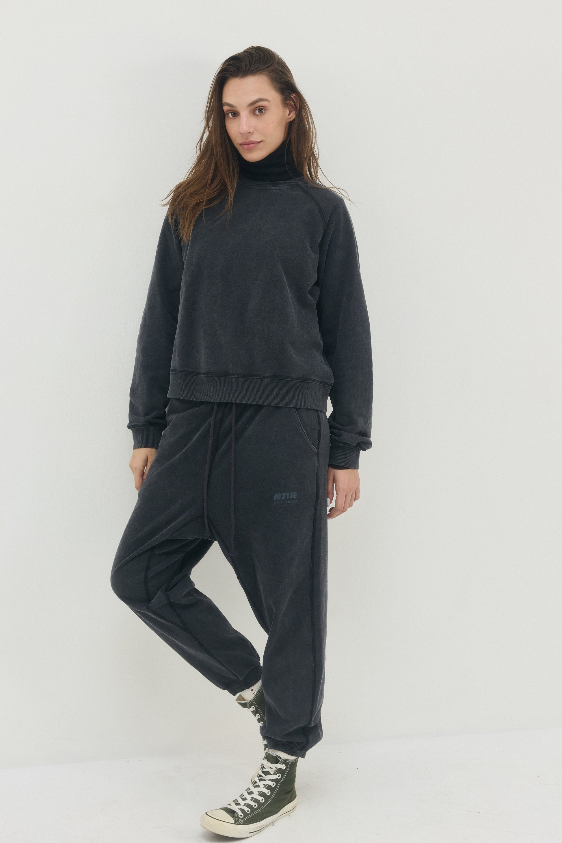 Relaxed-fit sweatpants with an elastic waistband and drawstring, featuring a long rise, two side pockets, and a back pocket with a zipper.