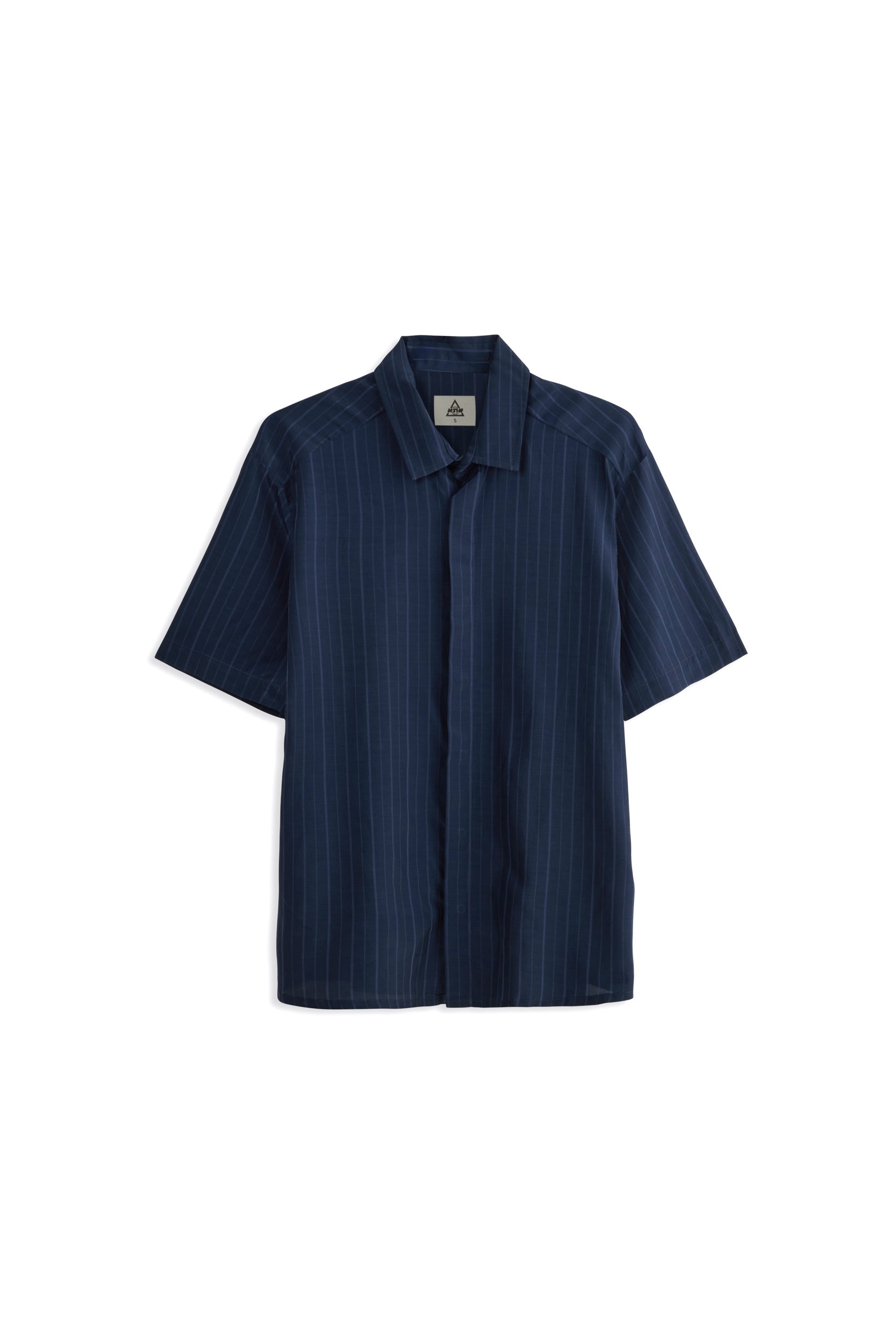 A straight-cut button-up shirt with concealed buttons and short sleeves.