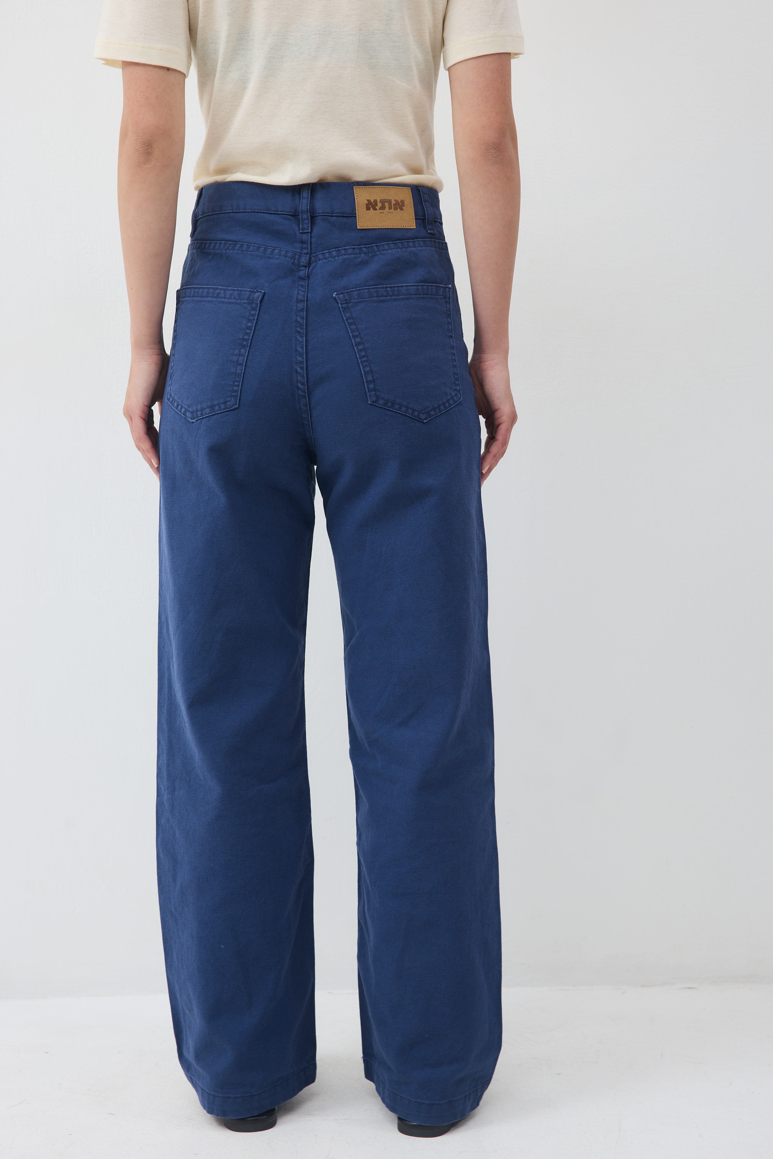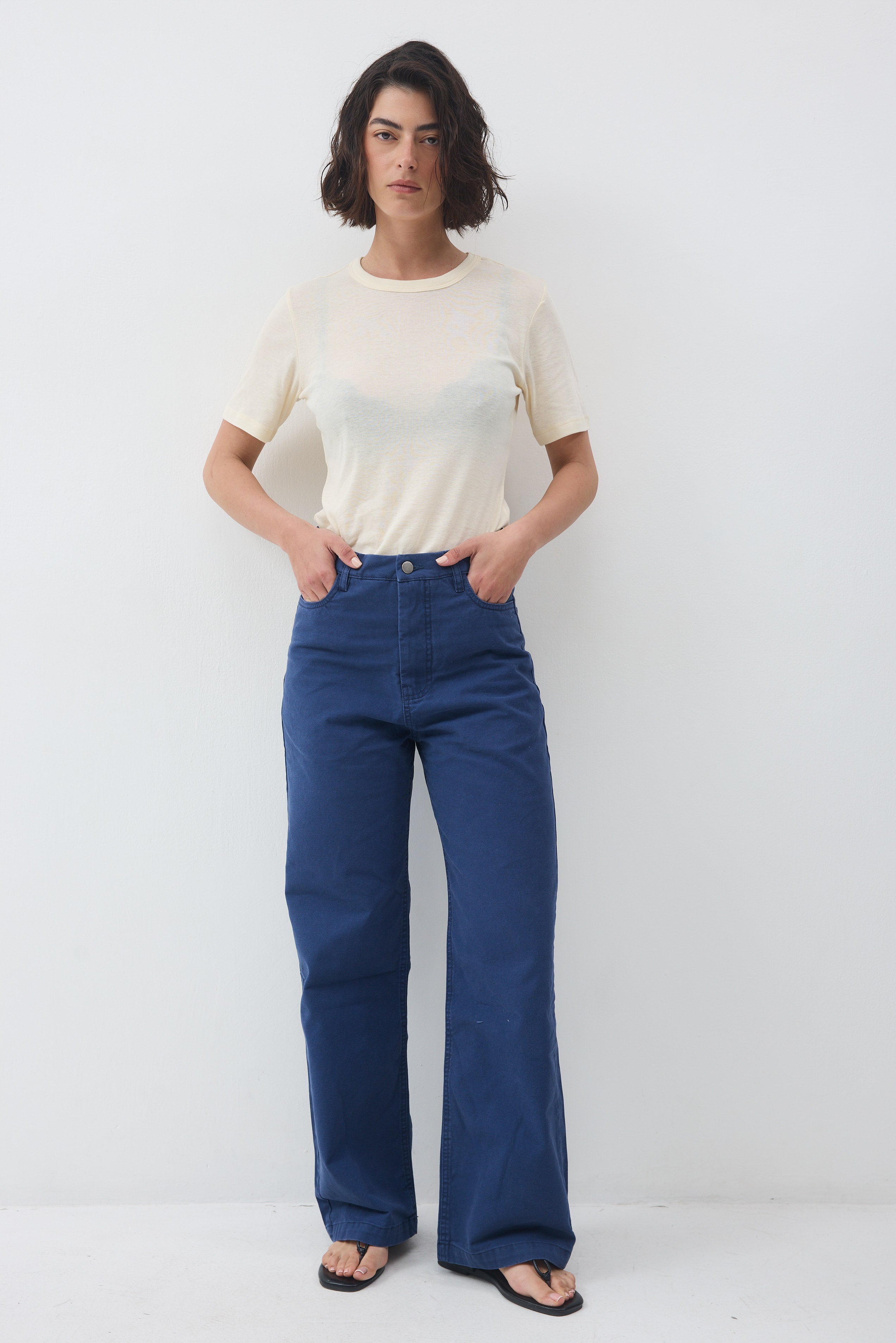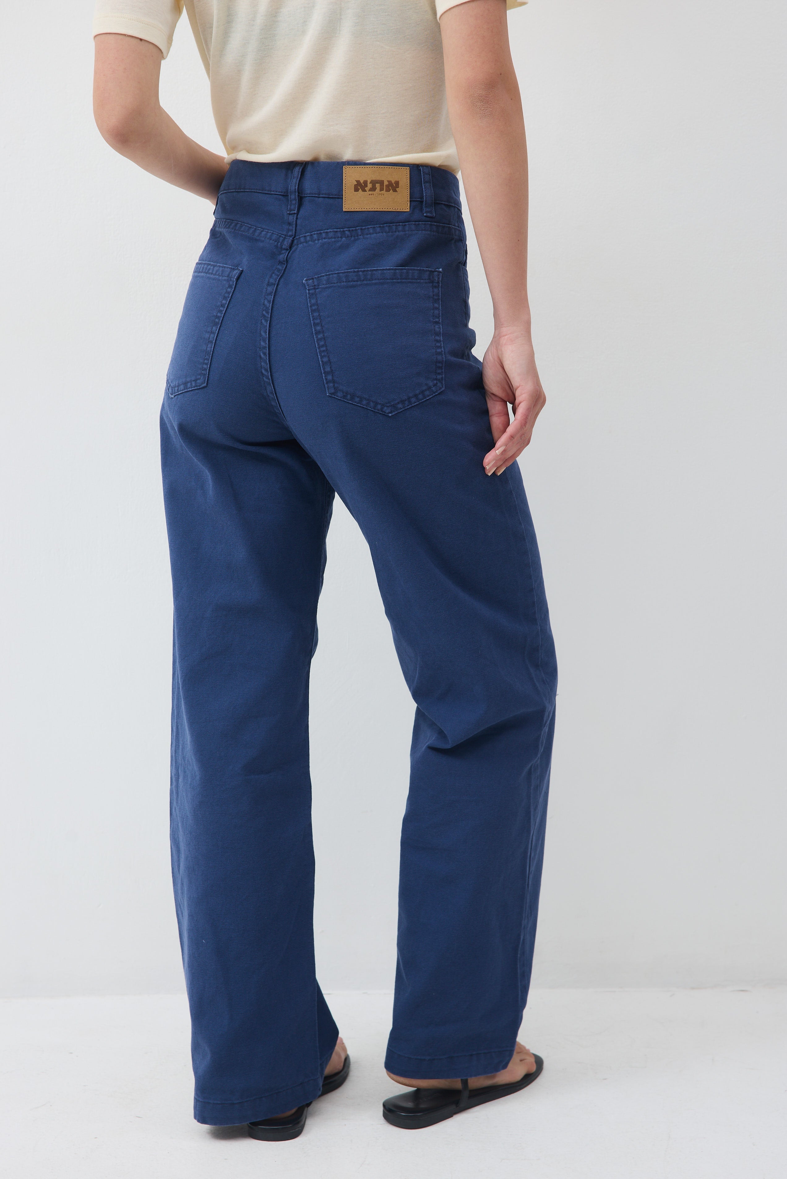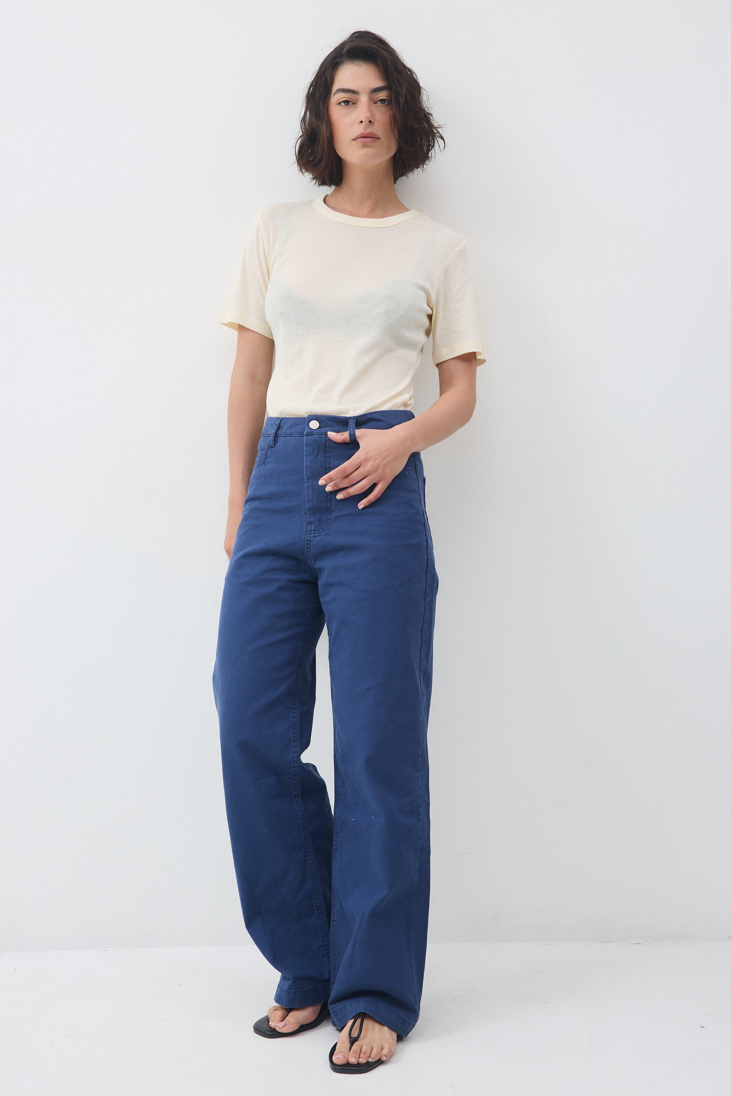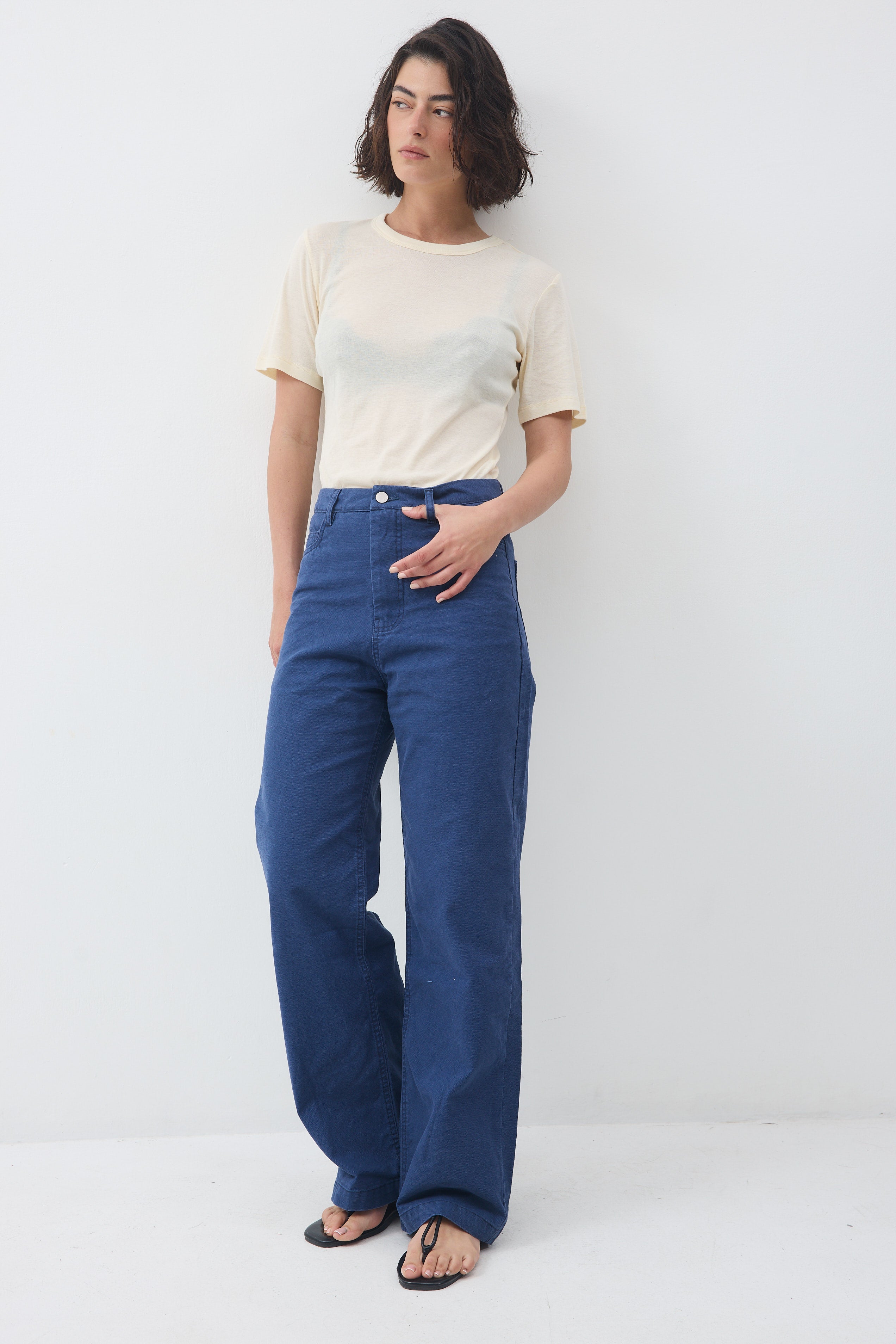 High-waisted fit, but Yael suggests sizing up for a lower-slung, drop crotch look with a relaxed feel. You’d call it wide-leg—meaning the leg is wide but doesn’t flare.