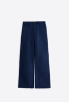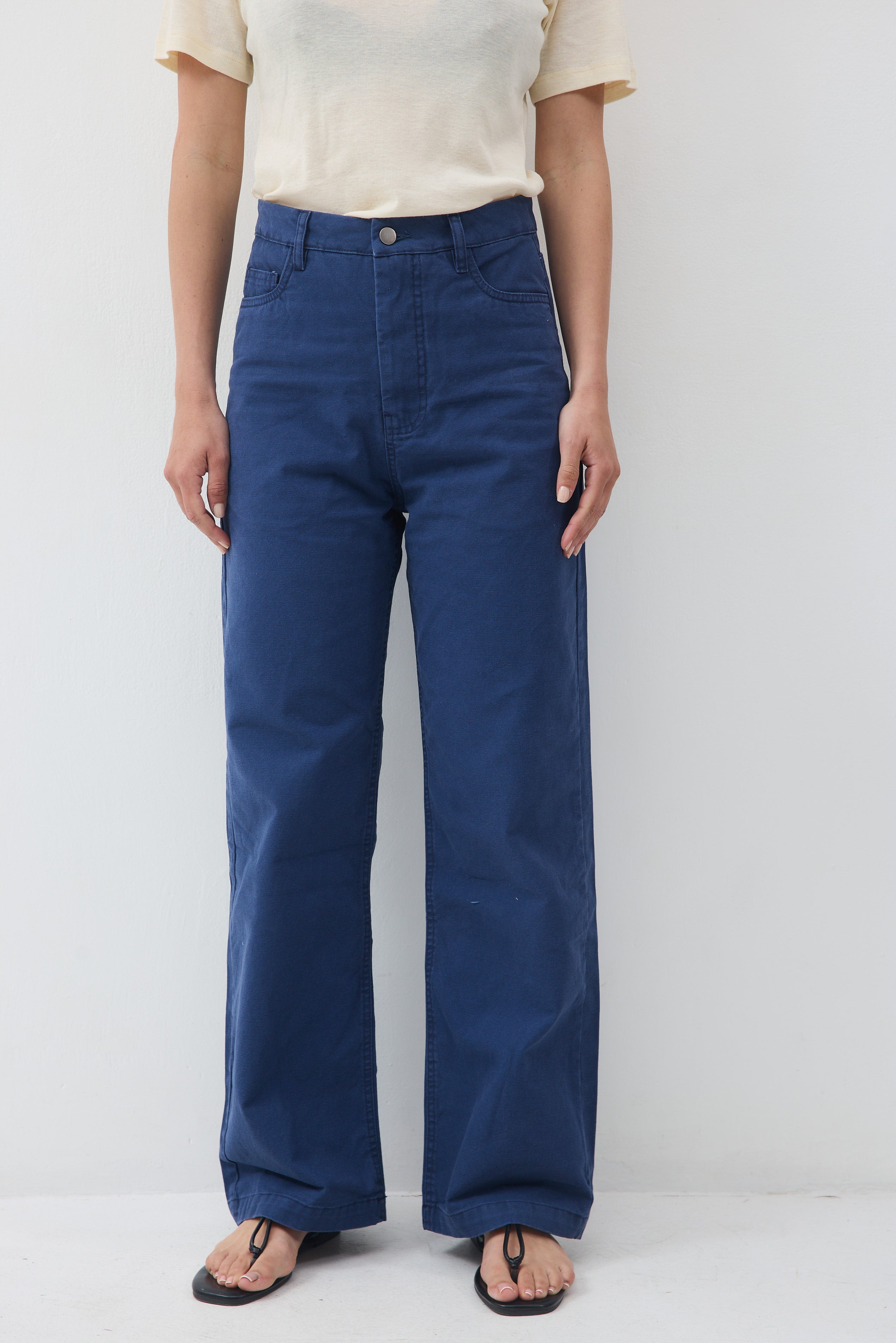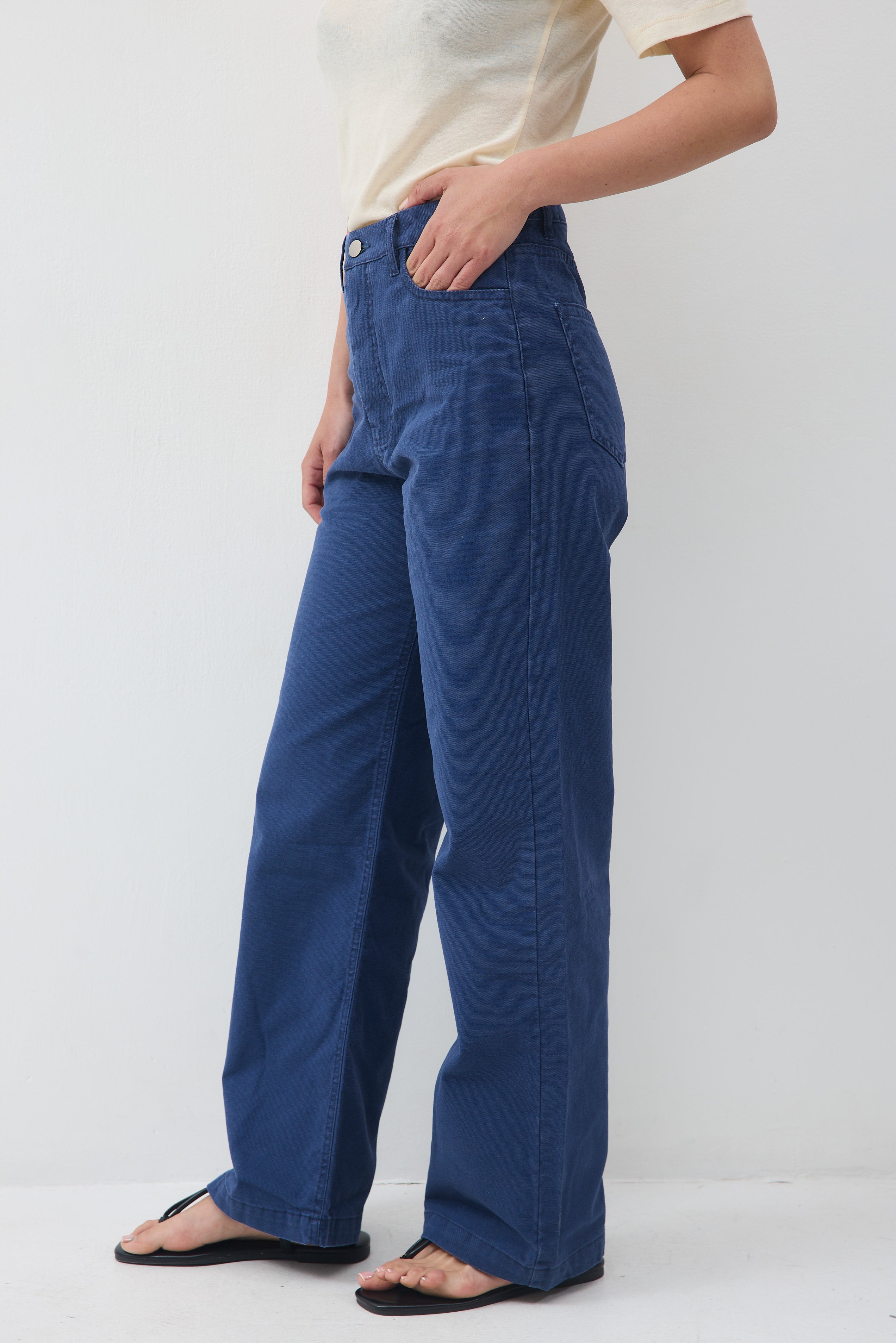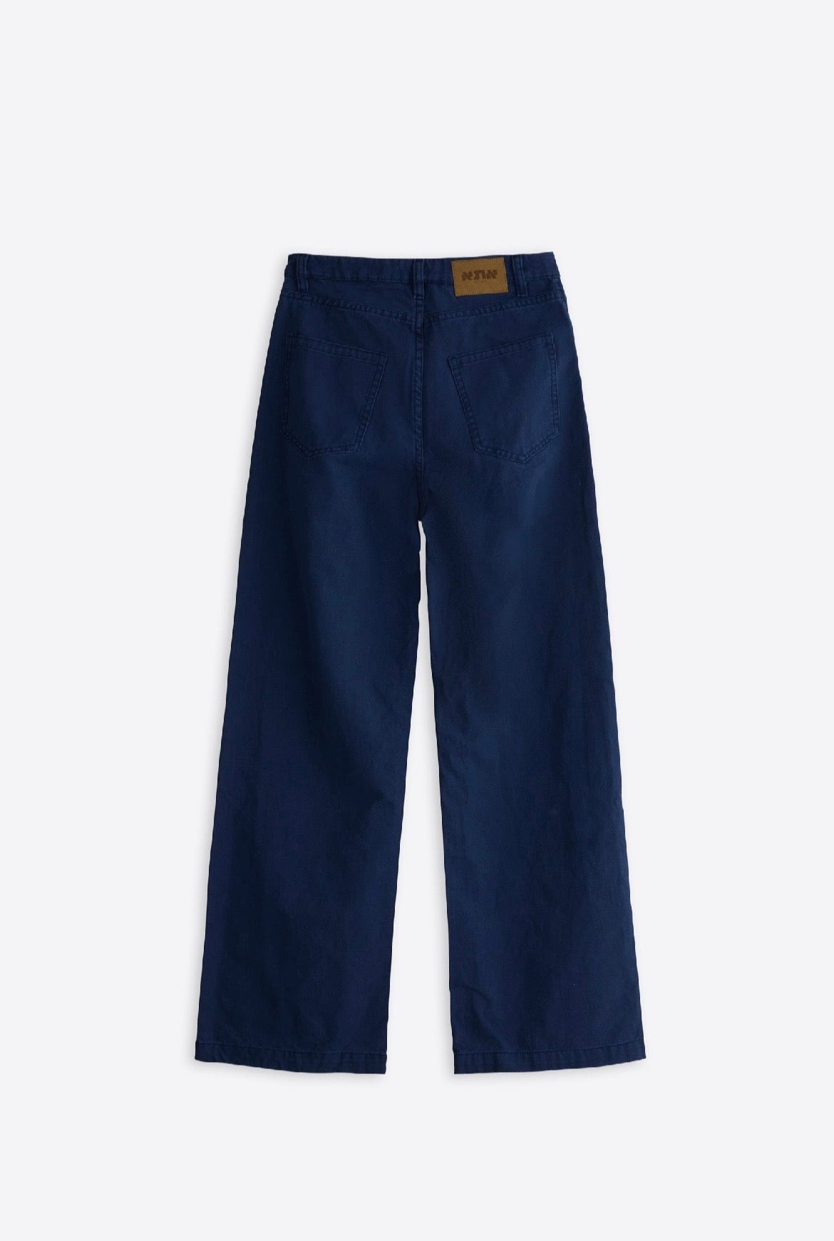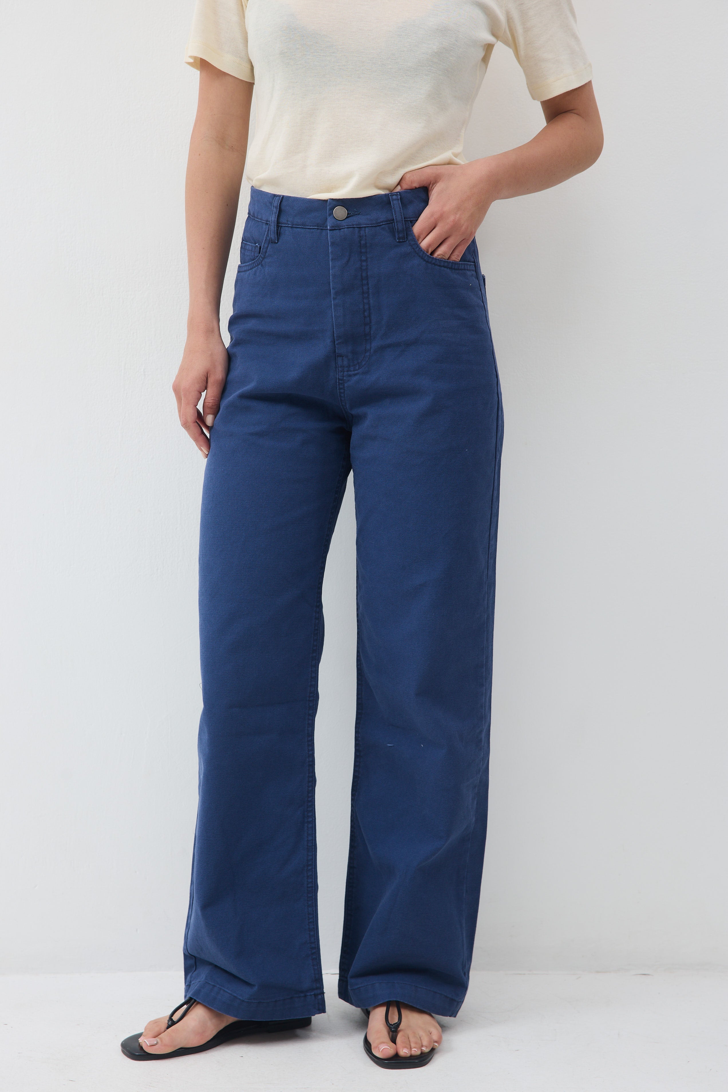 High-waisted fit, but Yael suggests sizing up for a lower-slung, drop crotch look with a relaxed feel. You’d call it wide-leg—meaning the leg is wide but doesn’t flare.