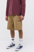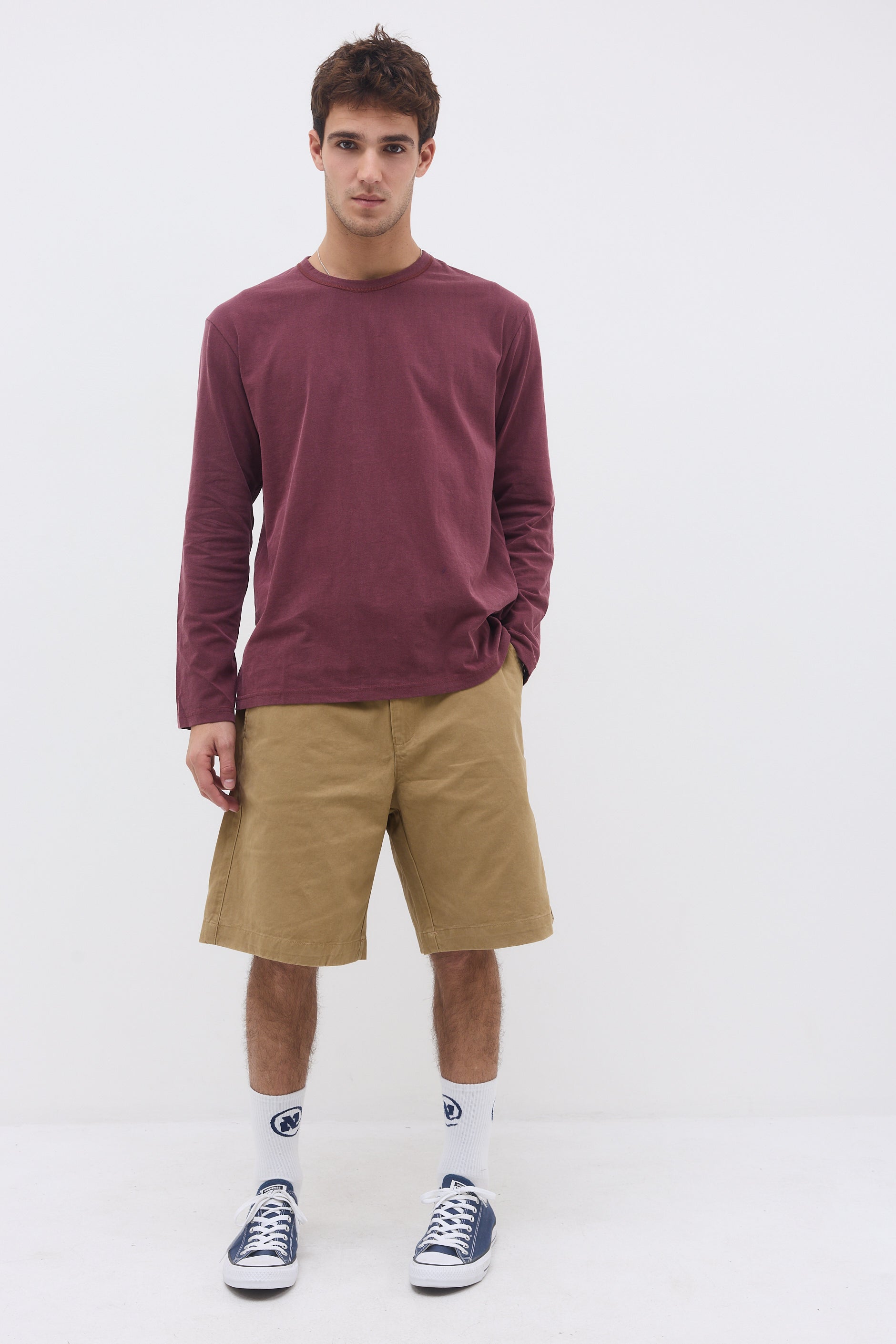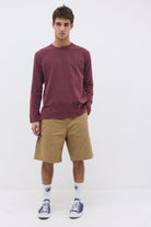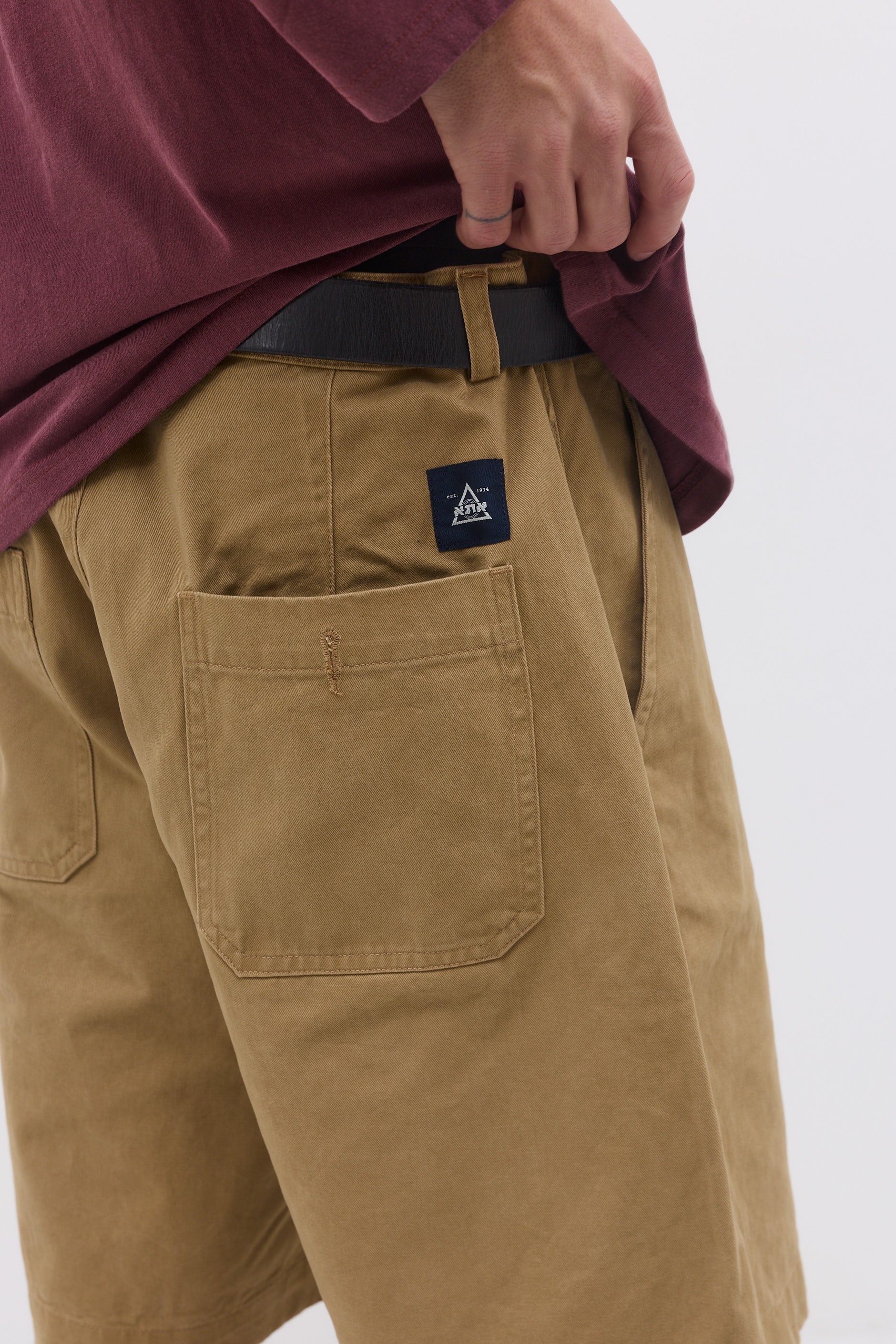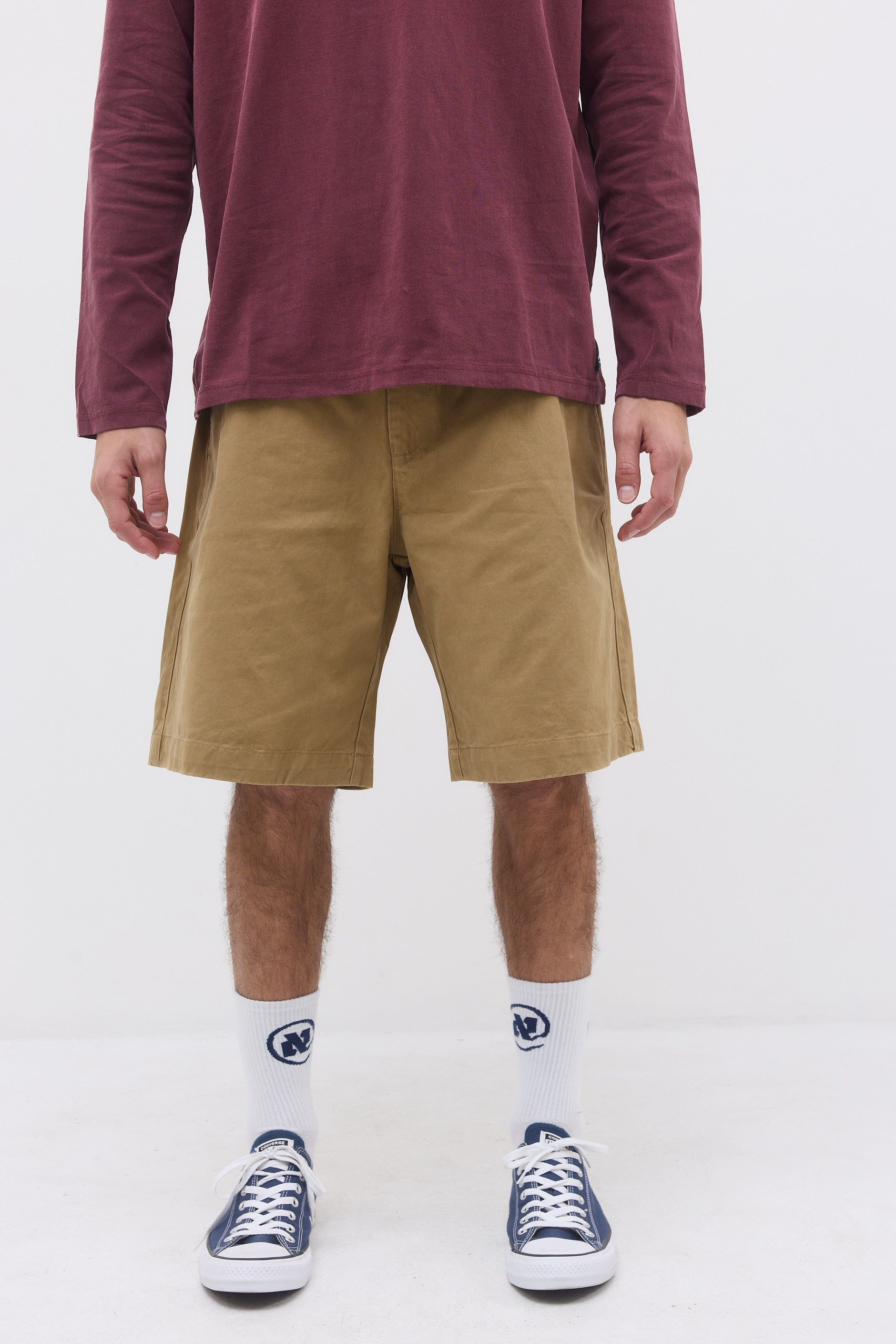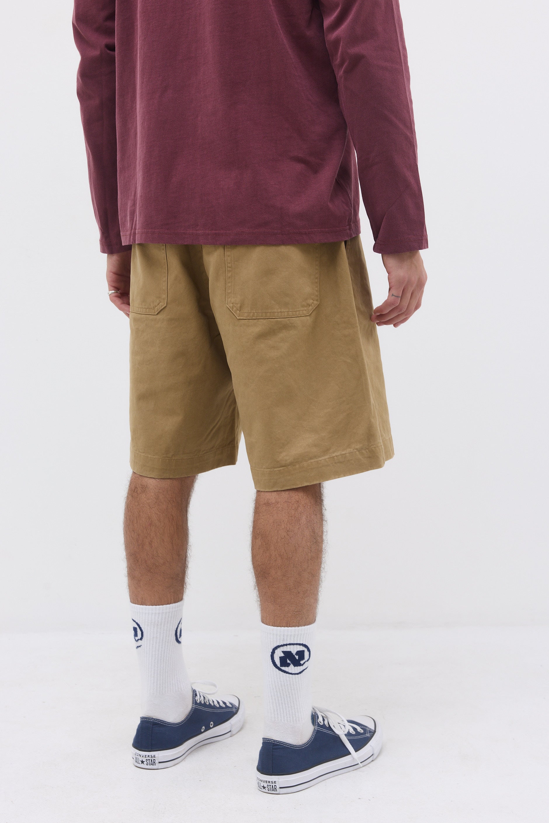 Knee-length pants in a relaxed fit, fastened with a button and zipper. Two slanted side pockets and two back pockets with button closure. Woven logo label above the left back pocket.