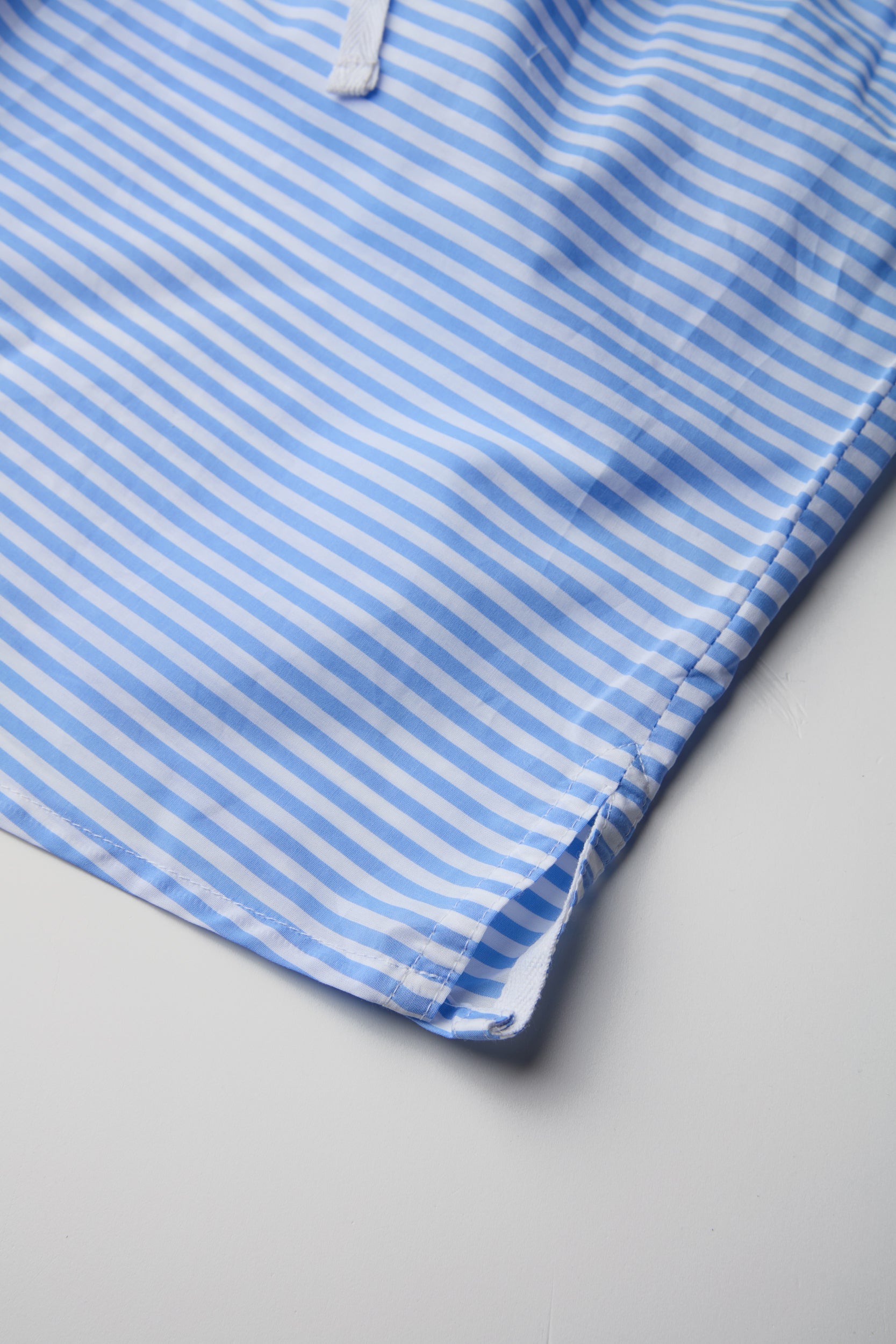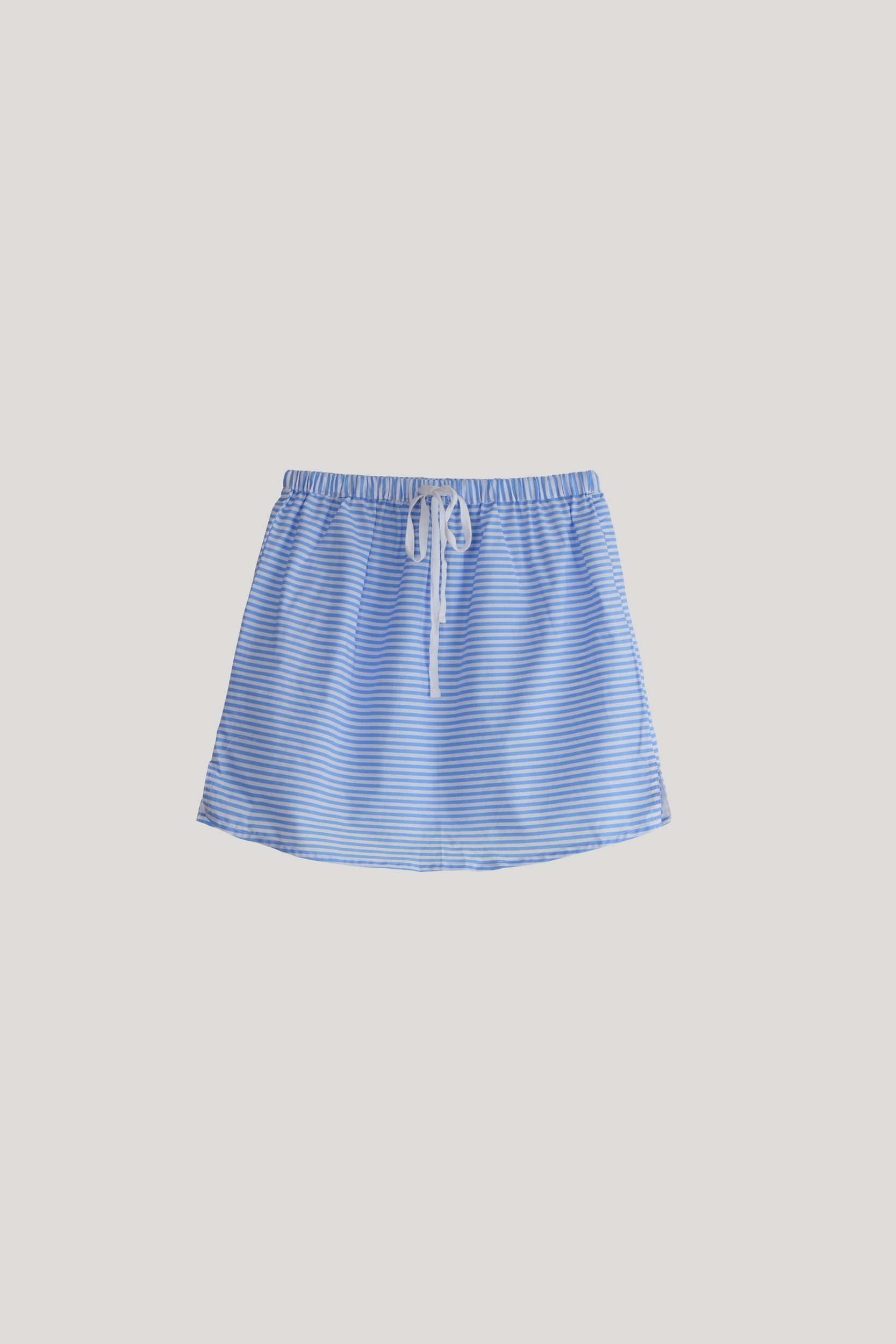 A lightweight and flattering strapless tank top with a delicate striped print in shades of blue and white. Designed with a straight and comfortable cut, it features an elastic waistband for a perfect fit on any body shape. A delicate front drawstring allows for adjustable styling as needed.