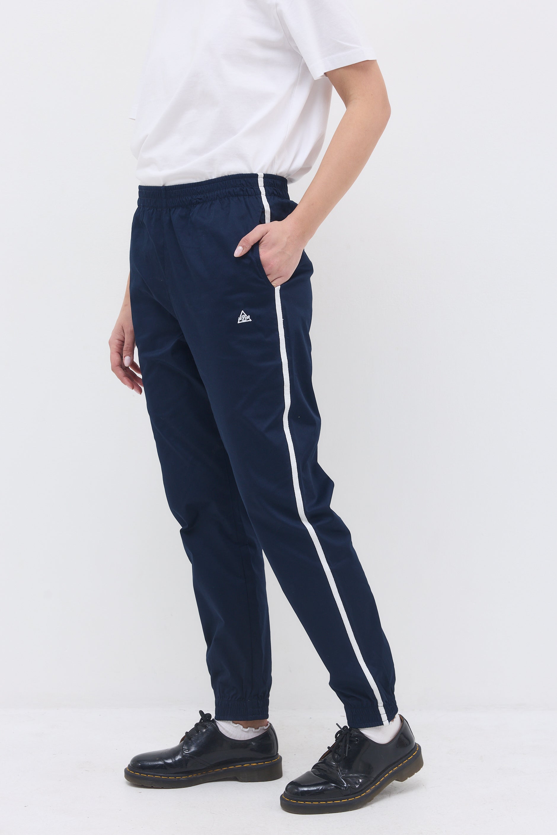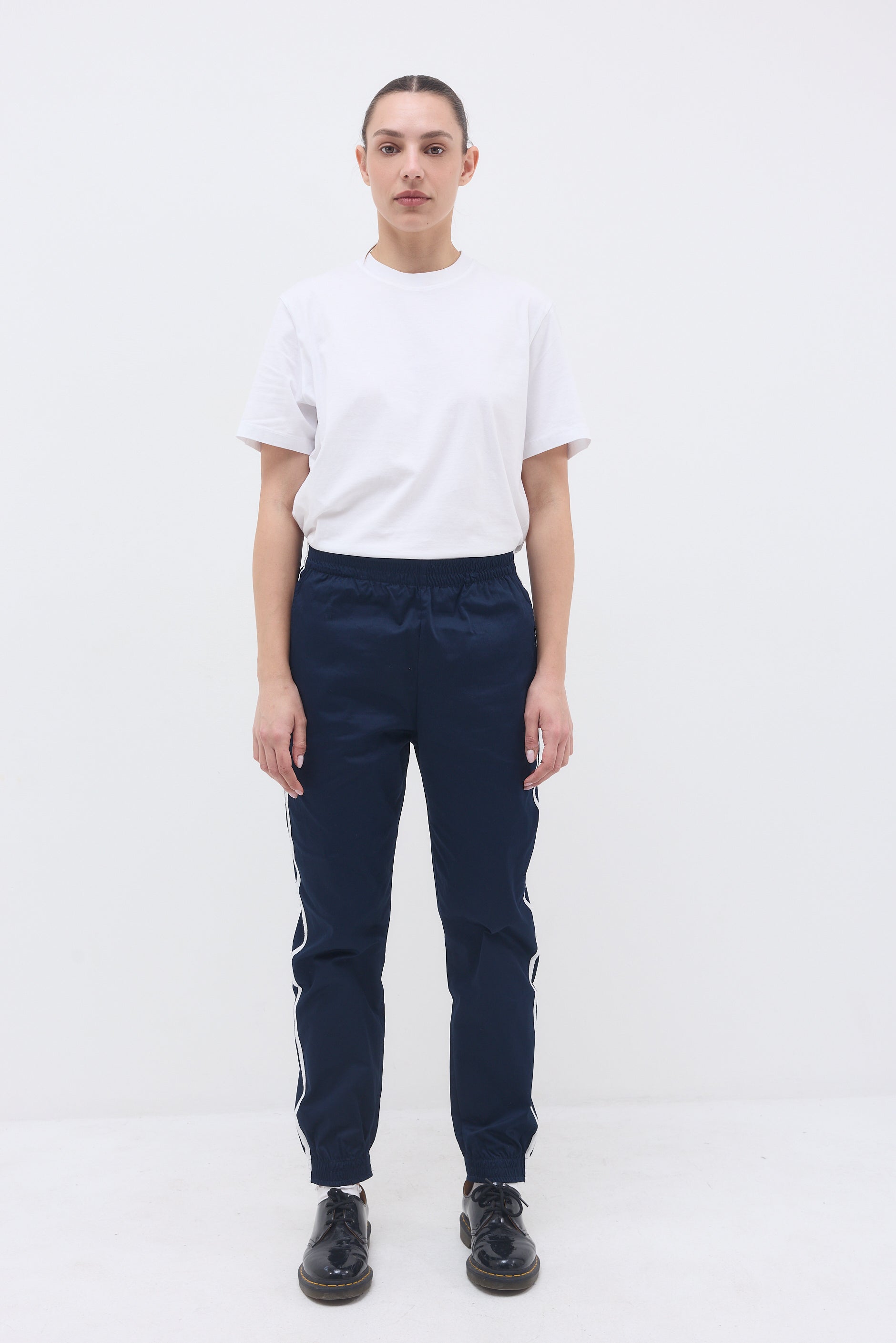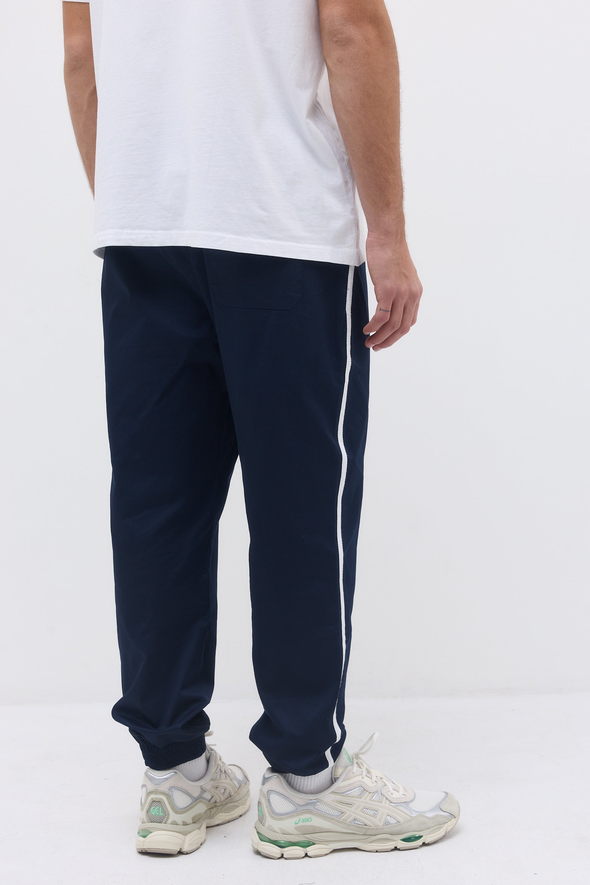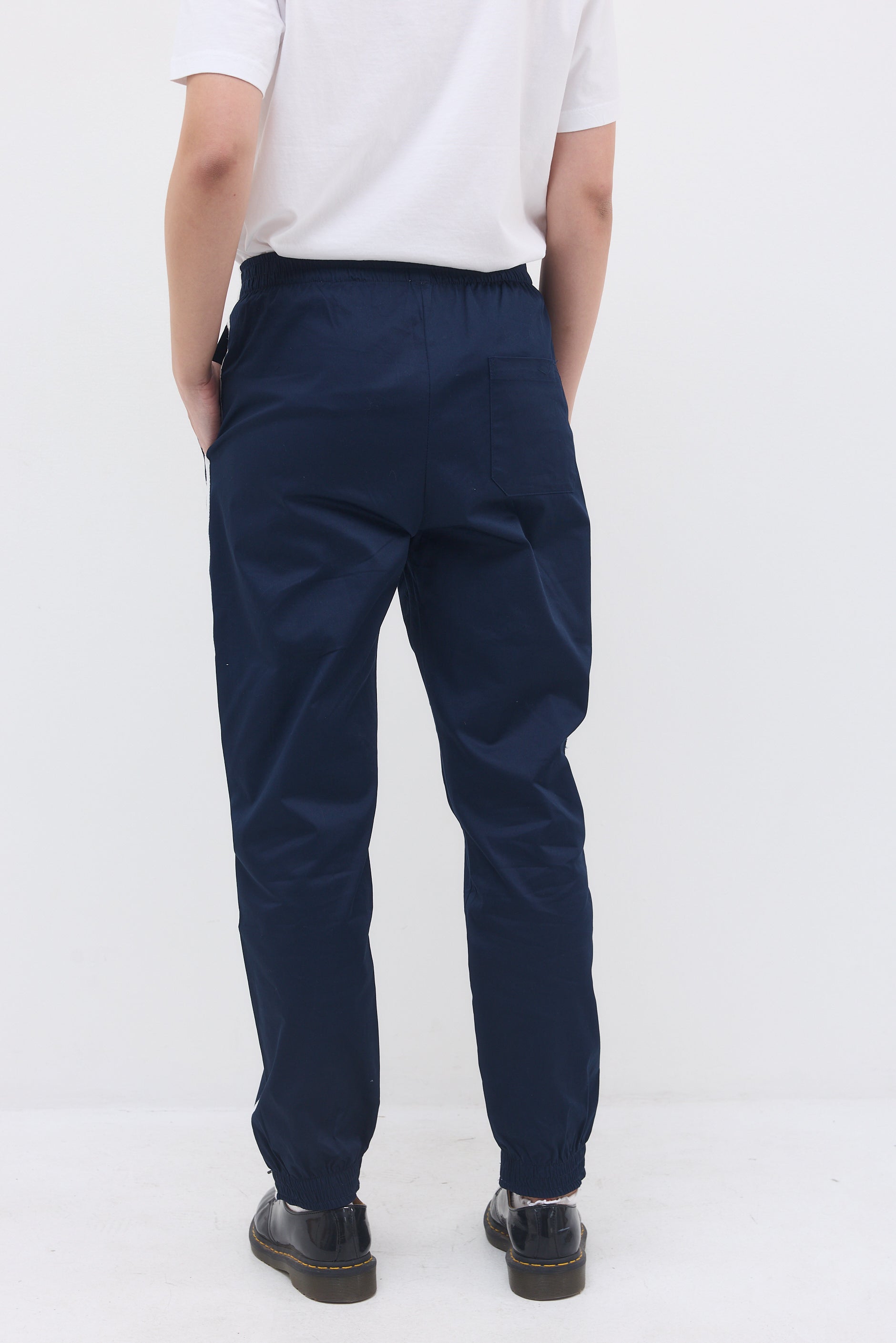 Ankle length elastic hem sweatpants with two front side pockets, a back pocket and long thin stripes on their side.