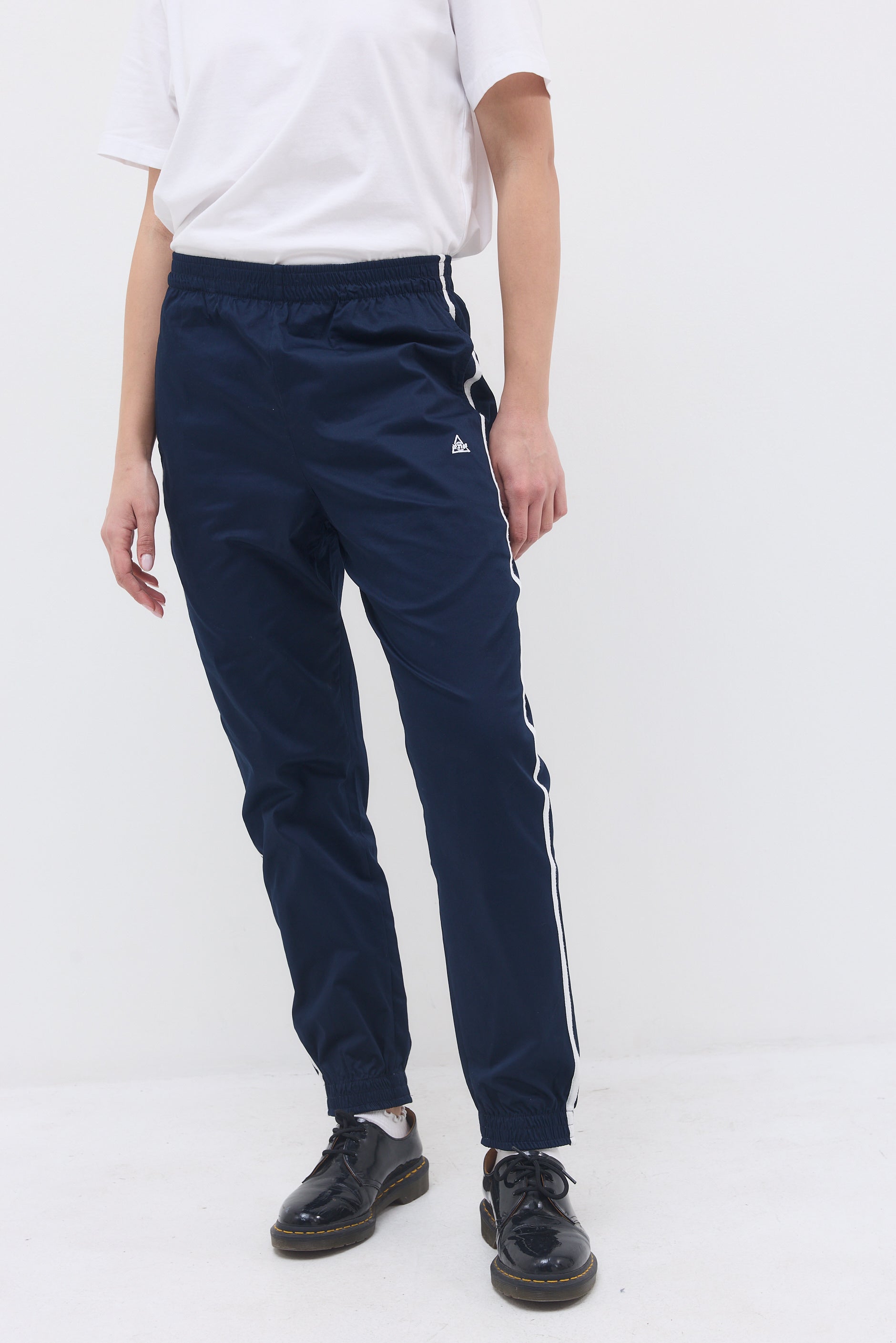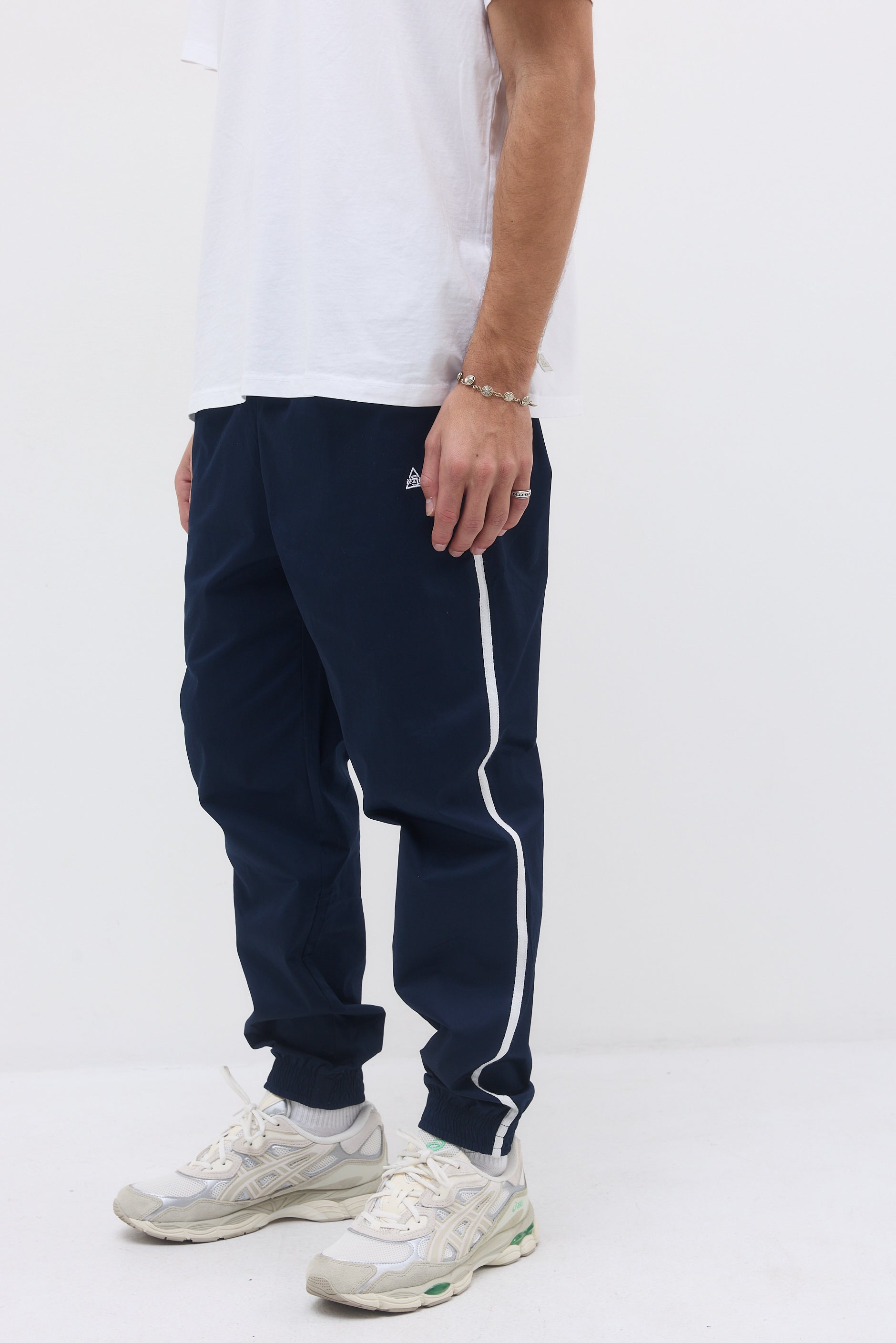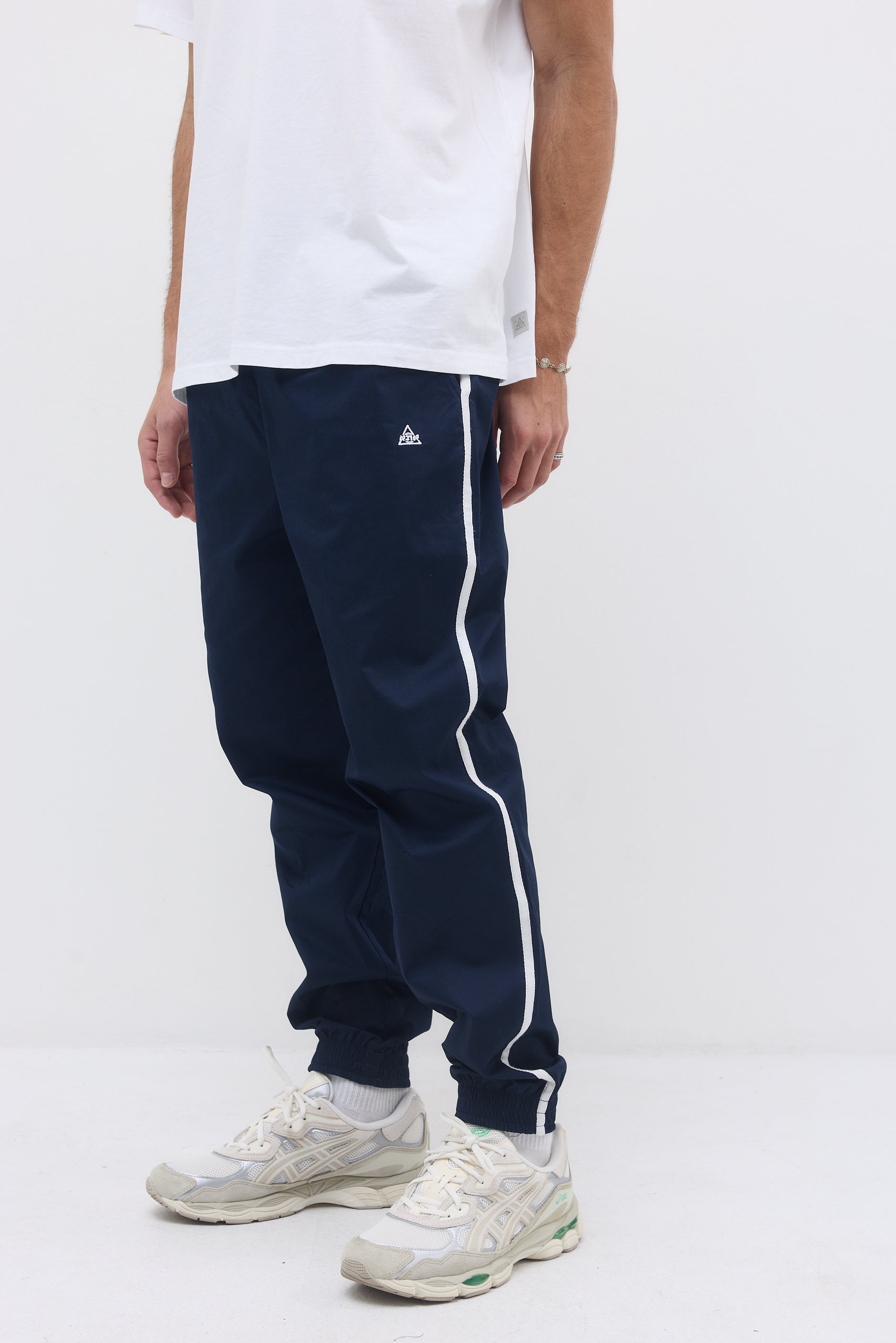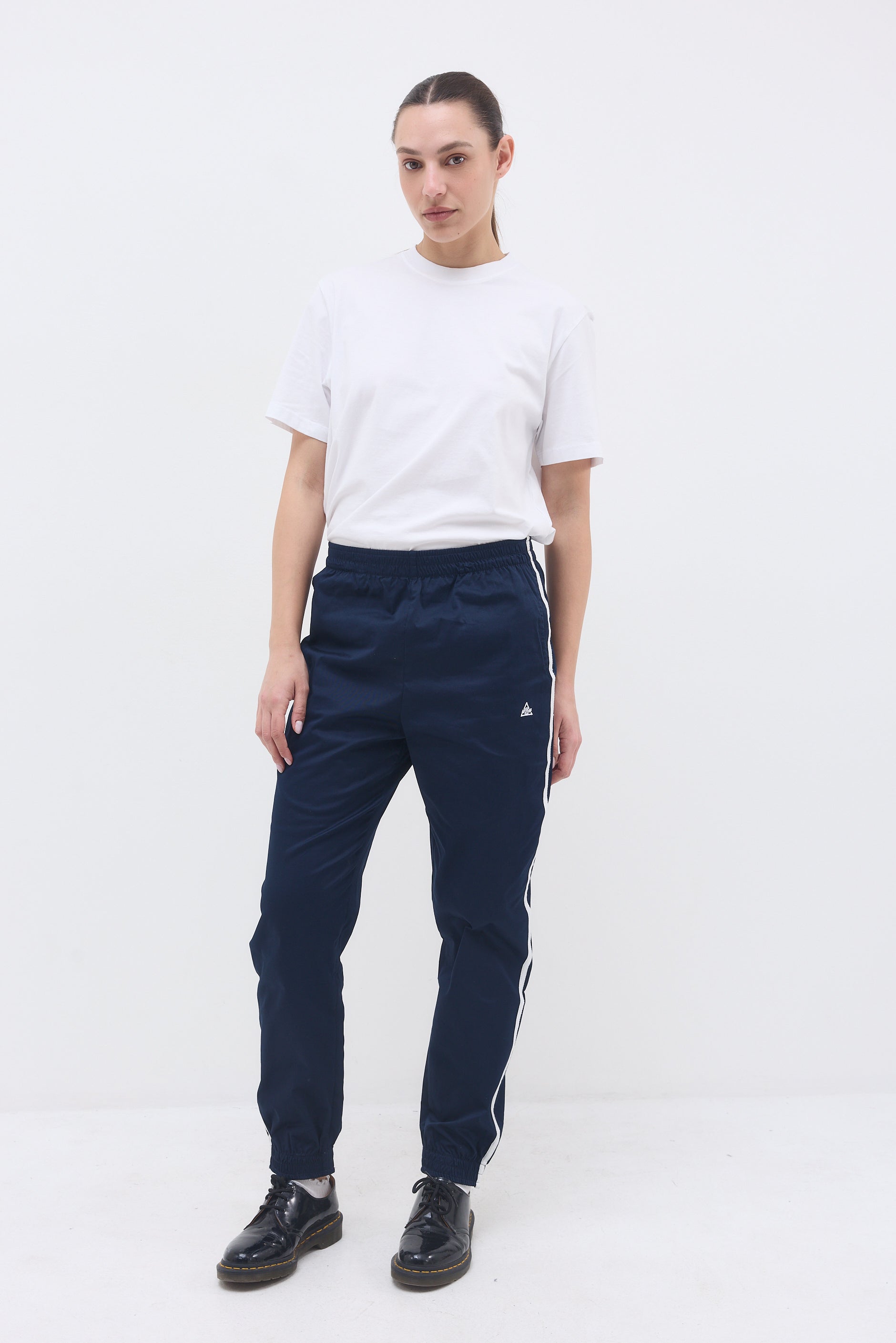 Ankle length elastic hem sweatpants with two front side pockets, a back pocket and long thin stripes on their side.