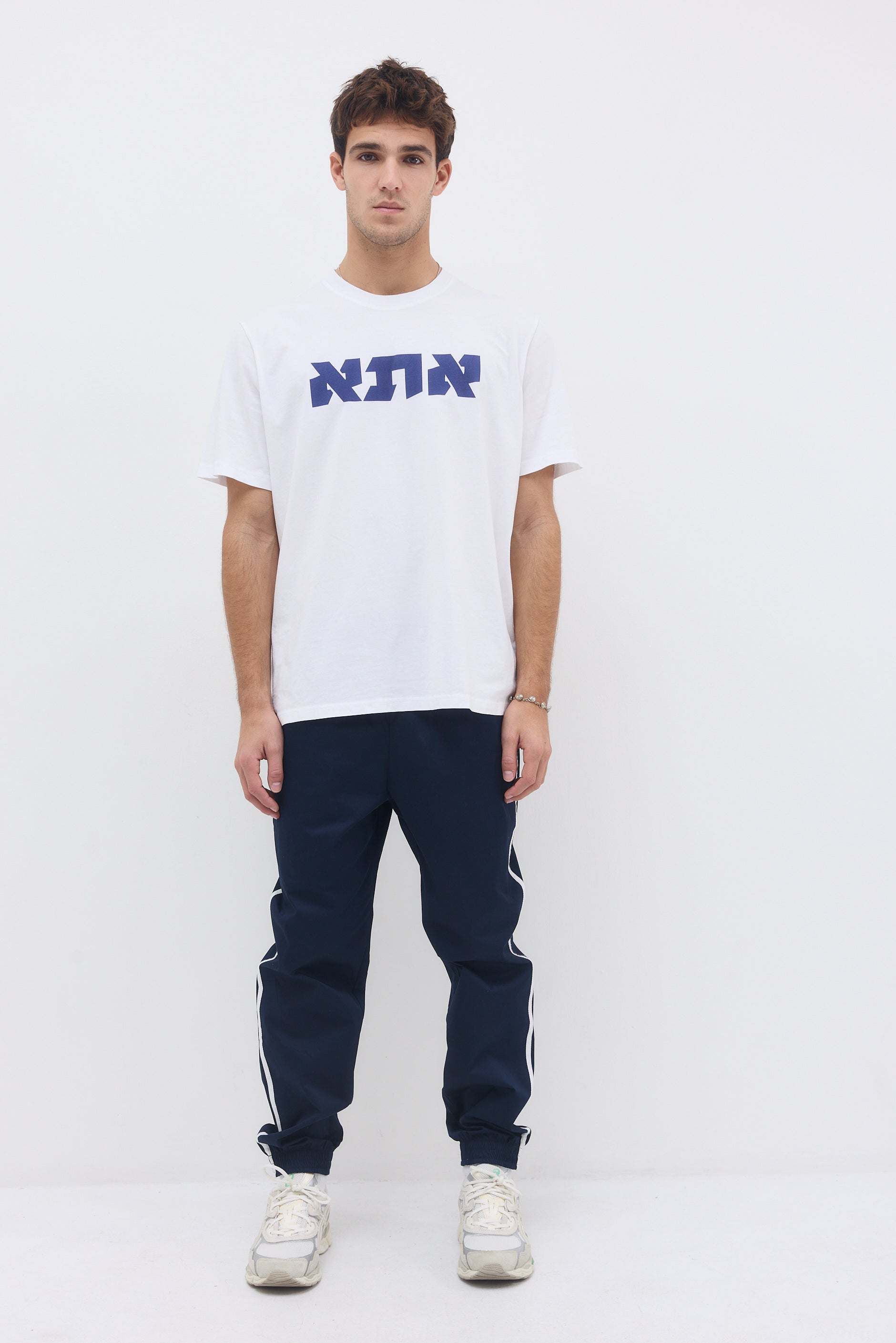 Omri's height is 1.84 cm, he wears a size L on top and a size M or 40 on bottoms.