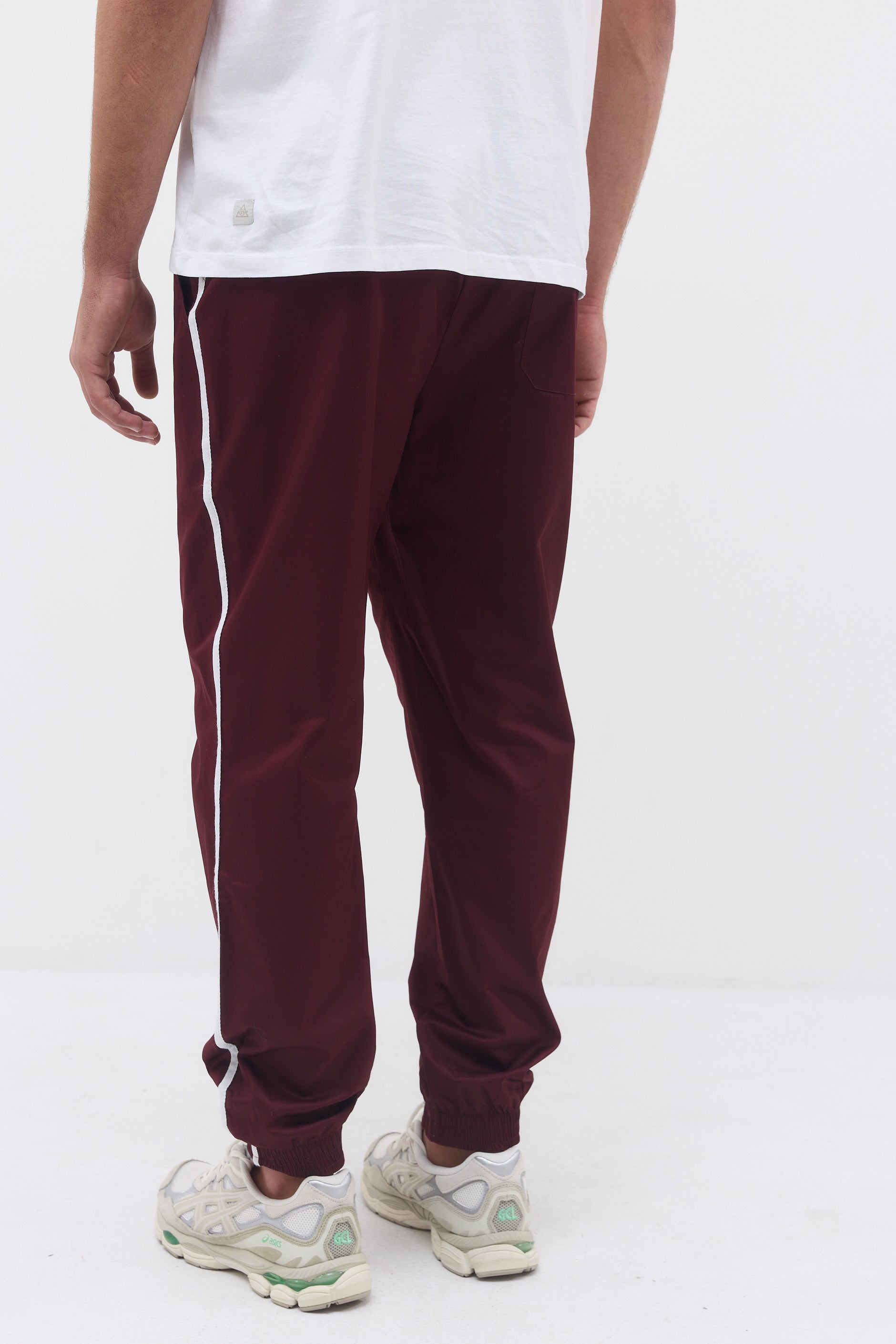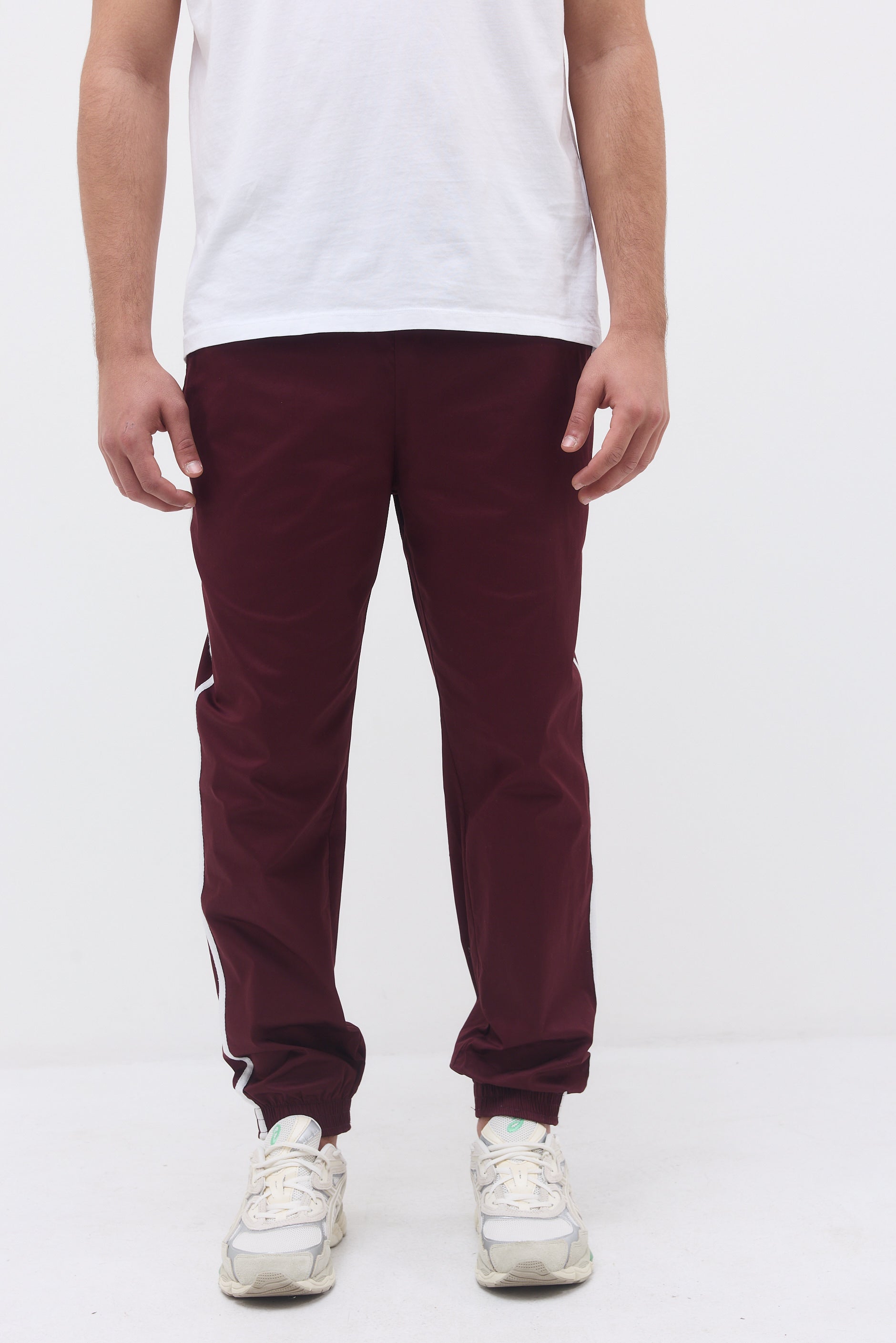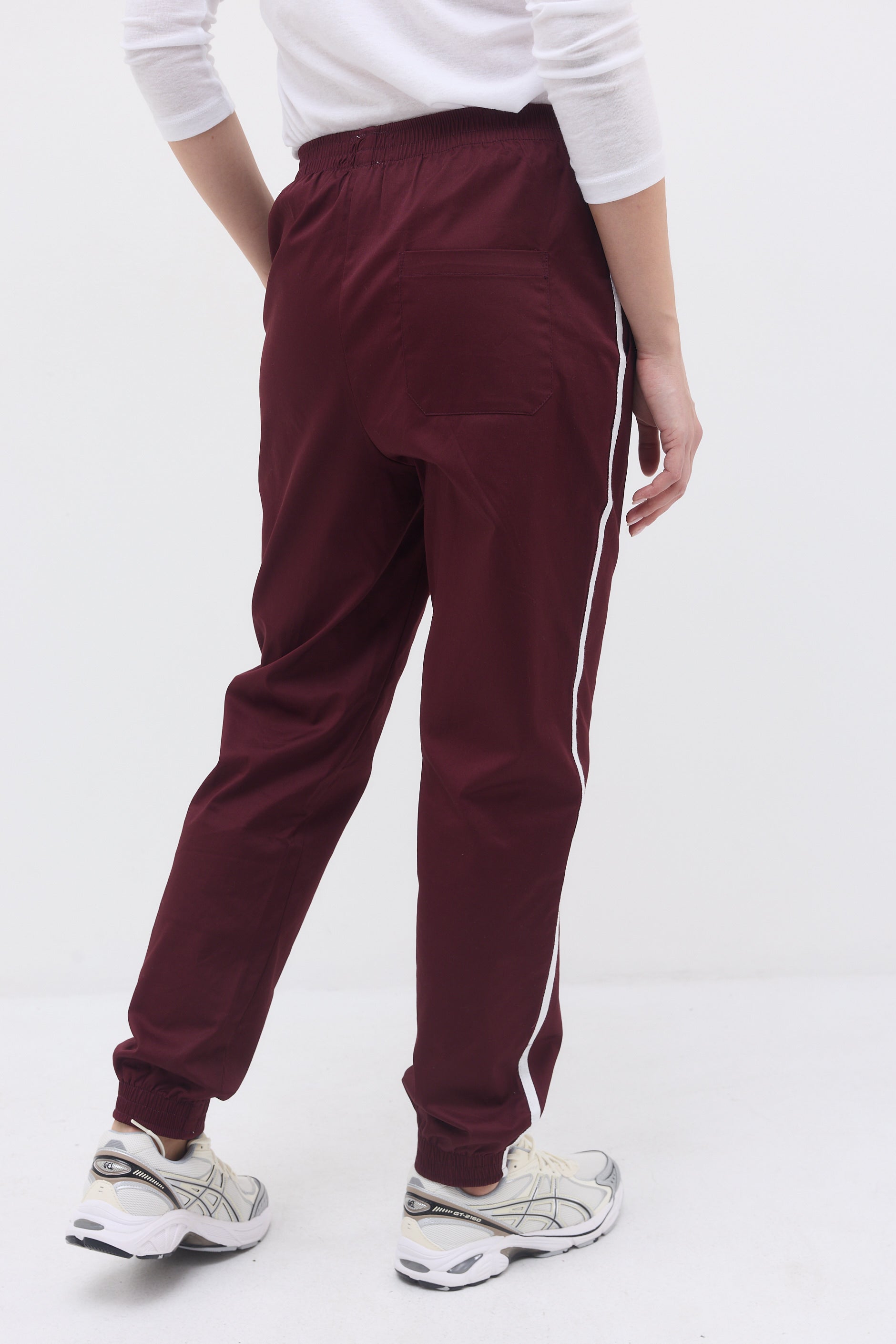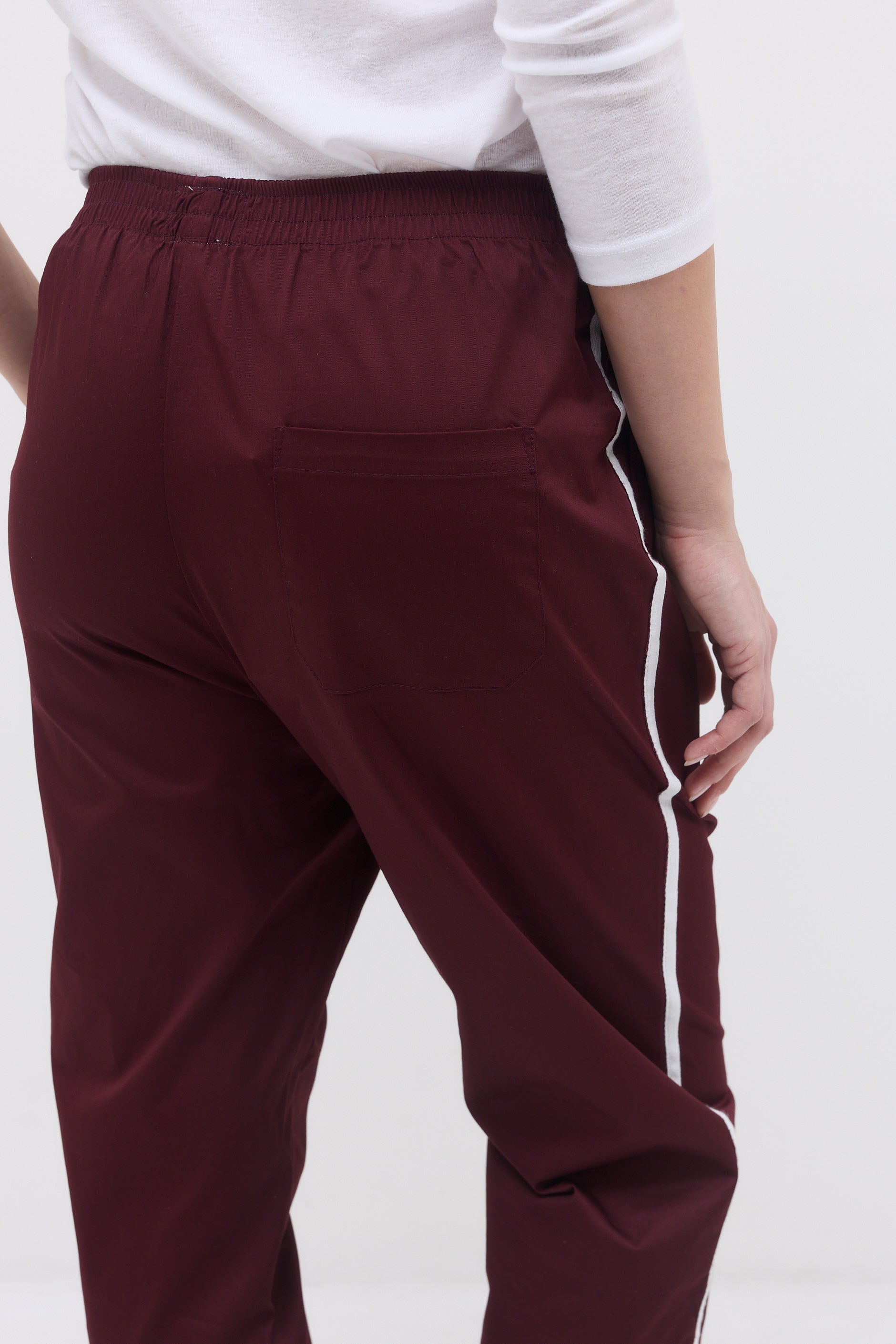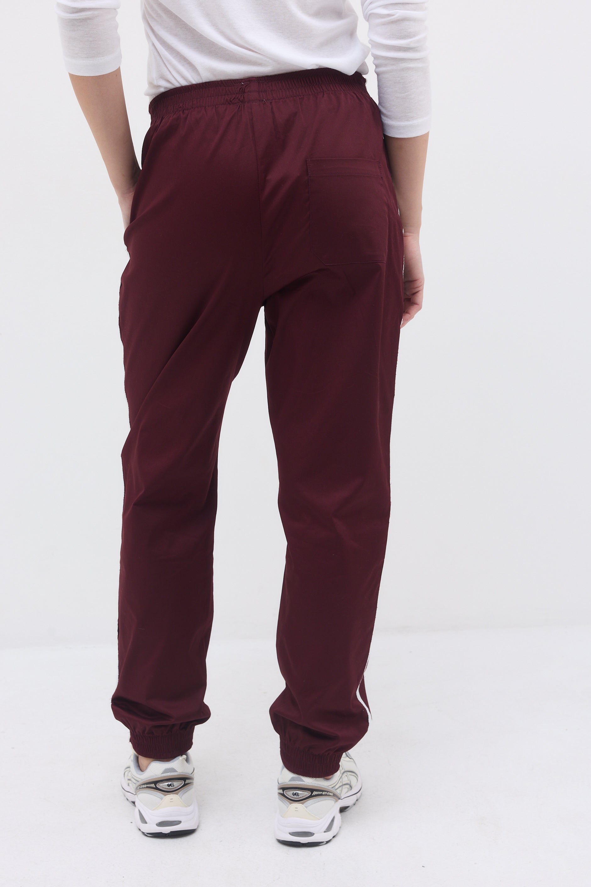 Ankle length elastic hem sweatpants with two front side pockets, a back pocket and long thin stripes on their side.