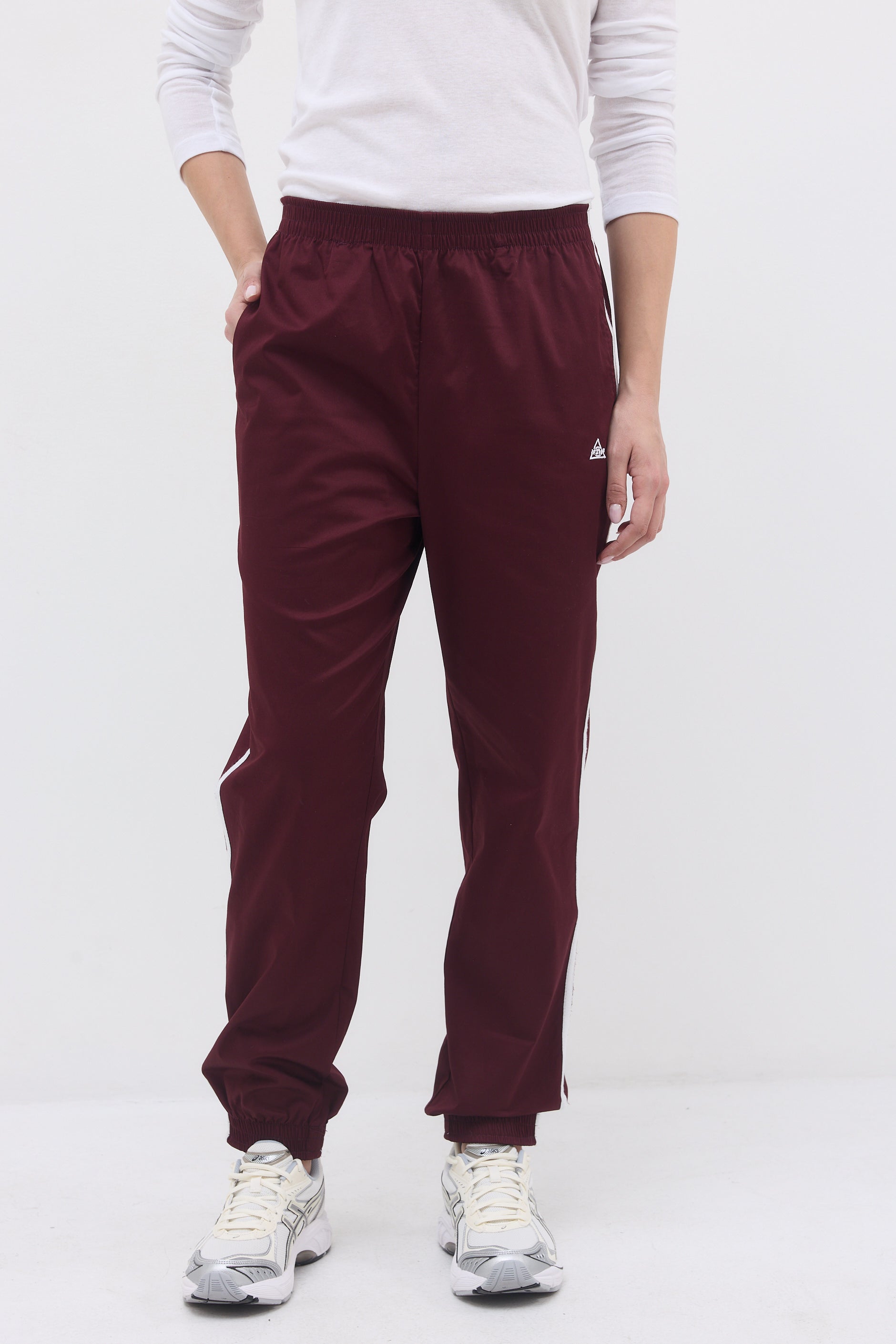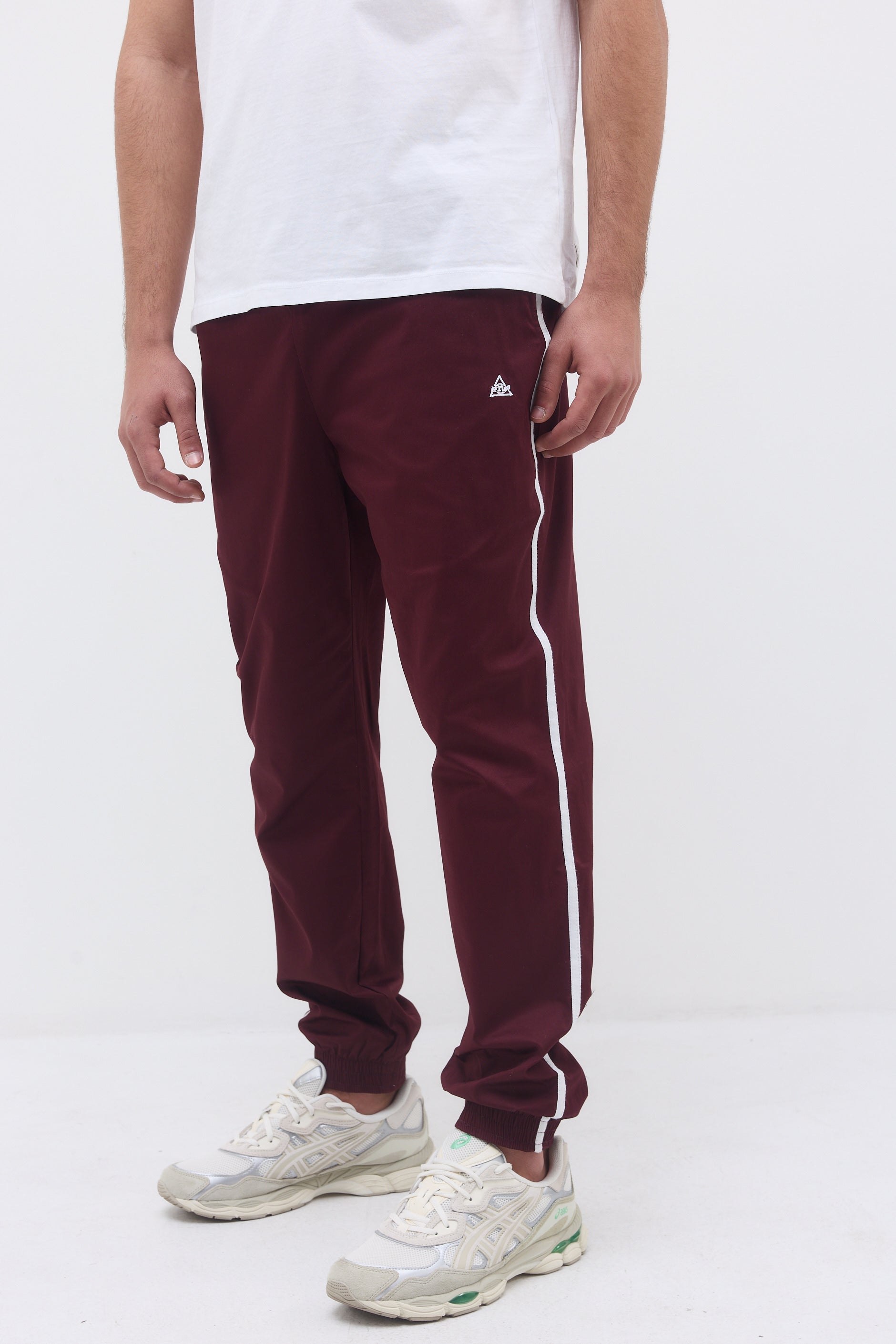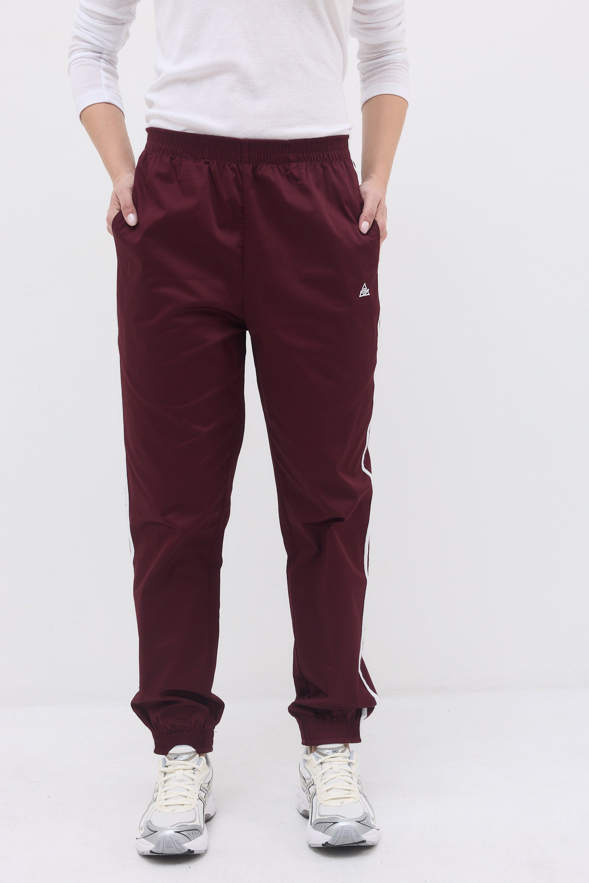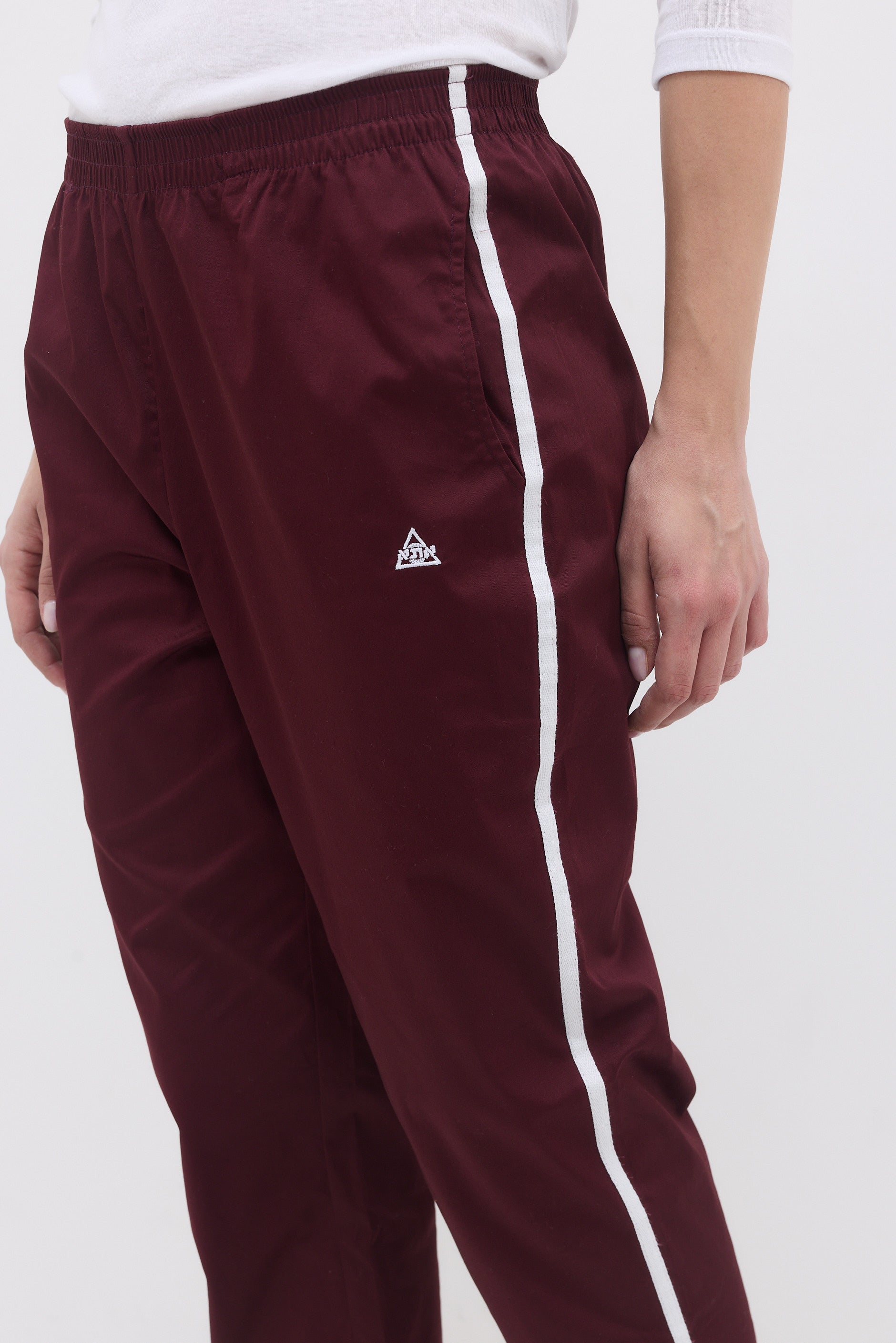 Ankle length elastic hem sweatpants with two front side pockets, a back pocket and long thin stripes on their side.
