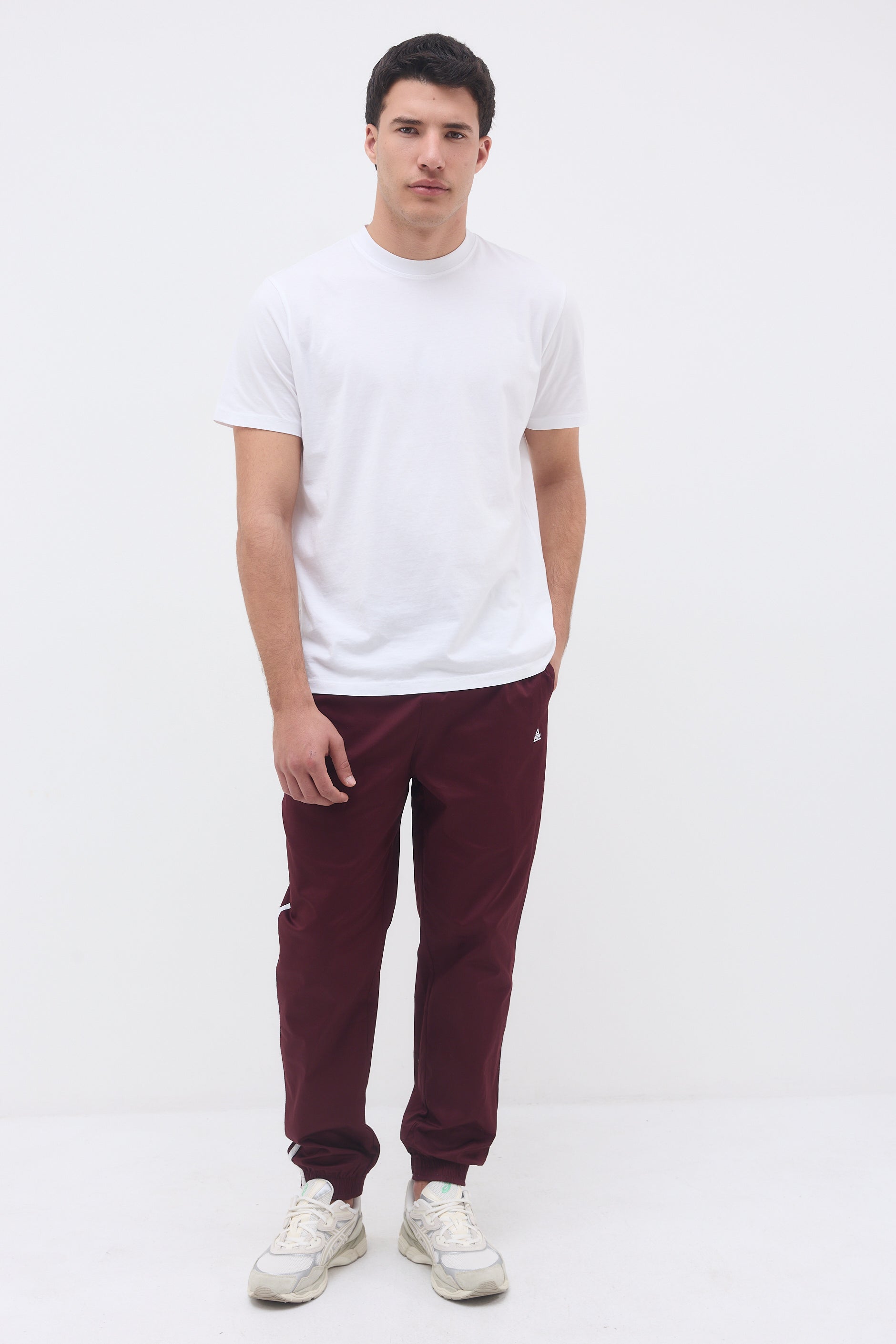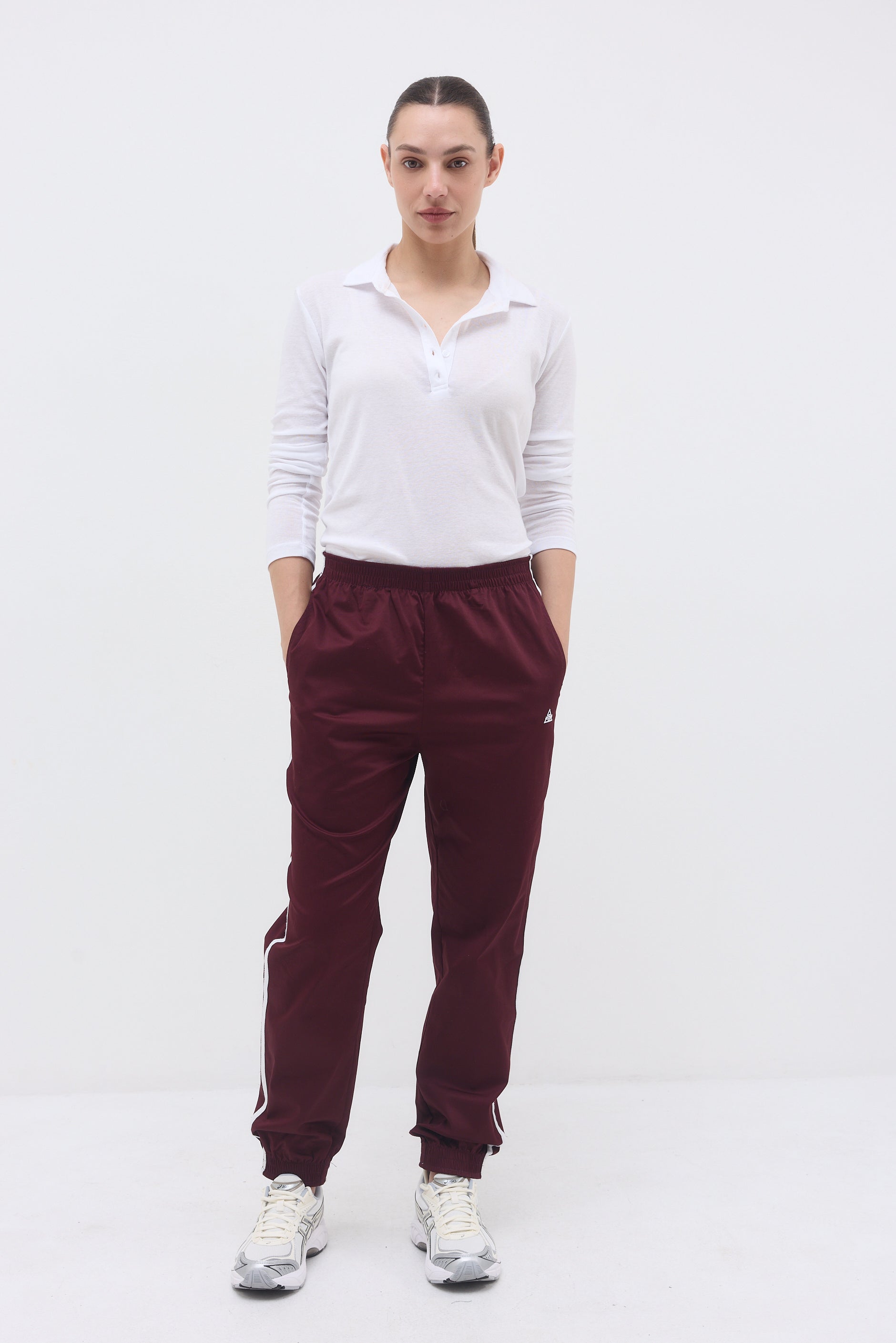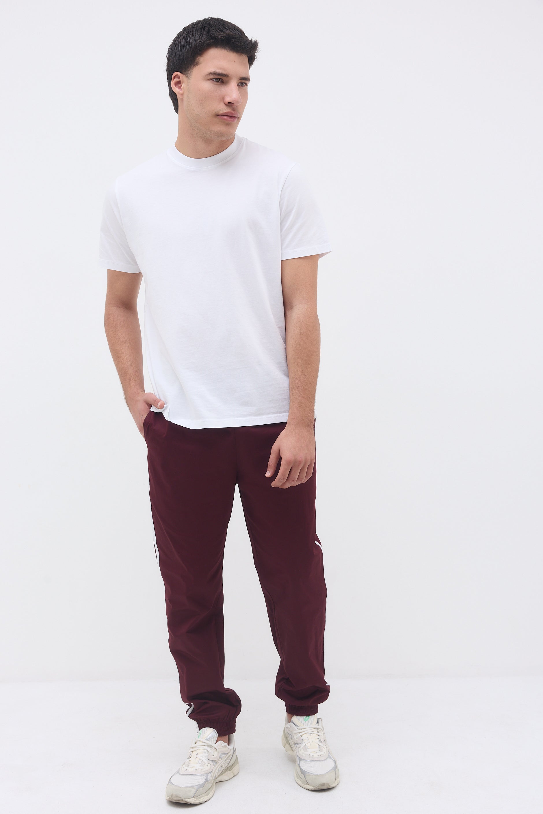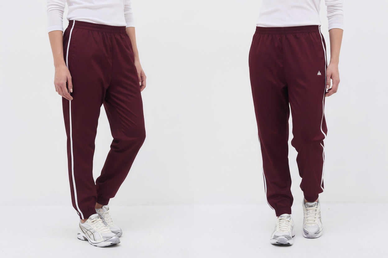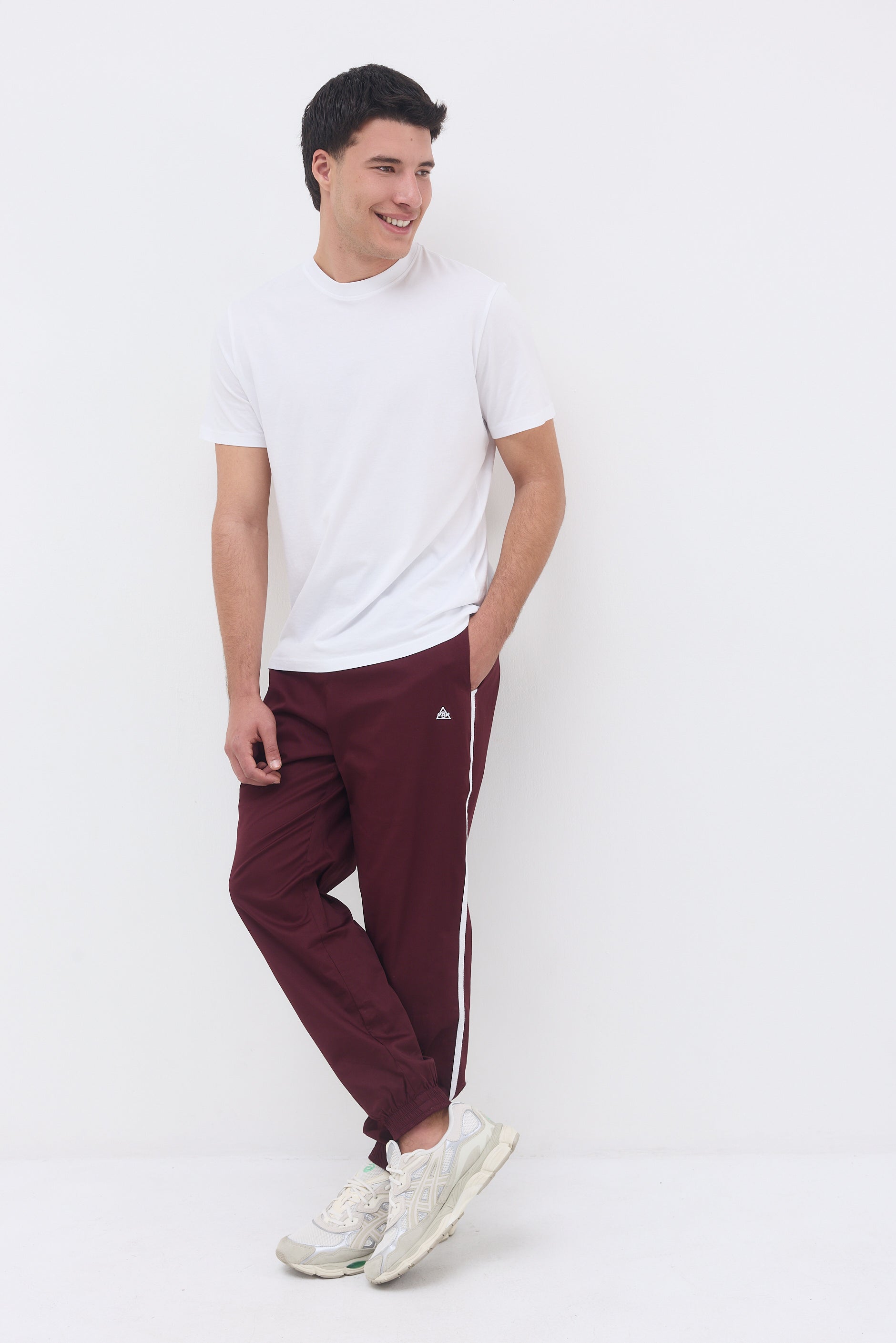 Ankle length elastic hem sweatpants with two front side pockets, a back pocket and long thin stripes on their side.