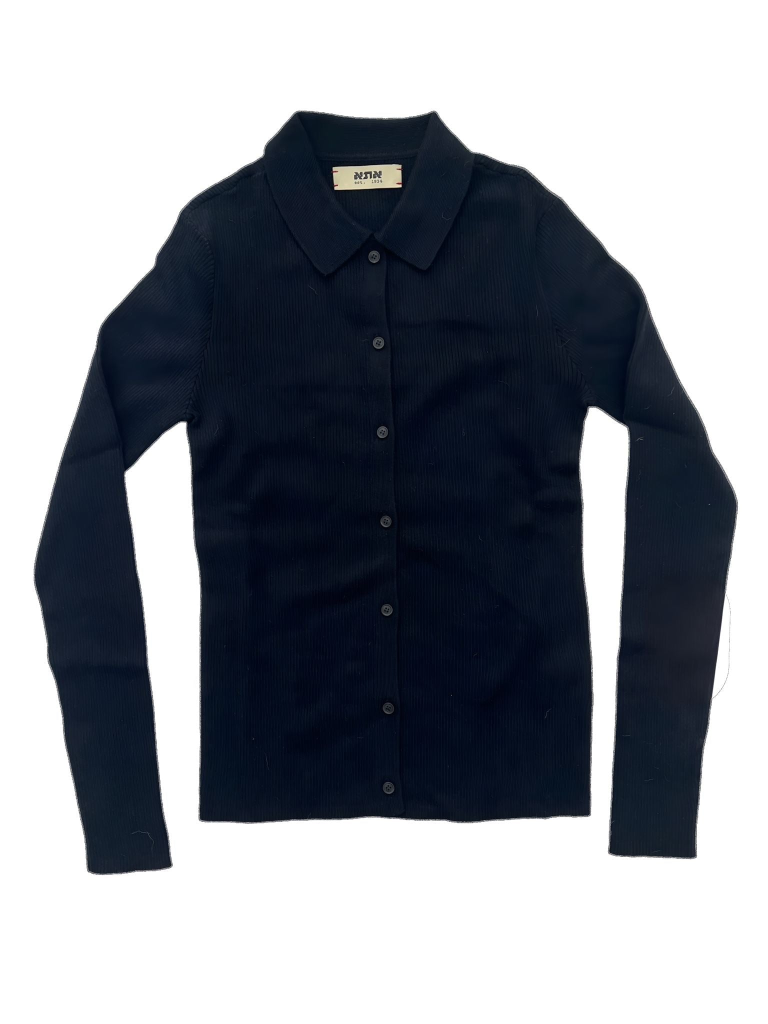 A fitted rib-knit sweater with a collar and buttons running along the entire front.