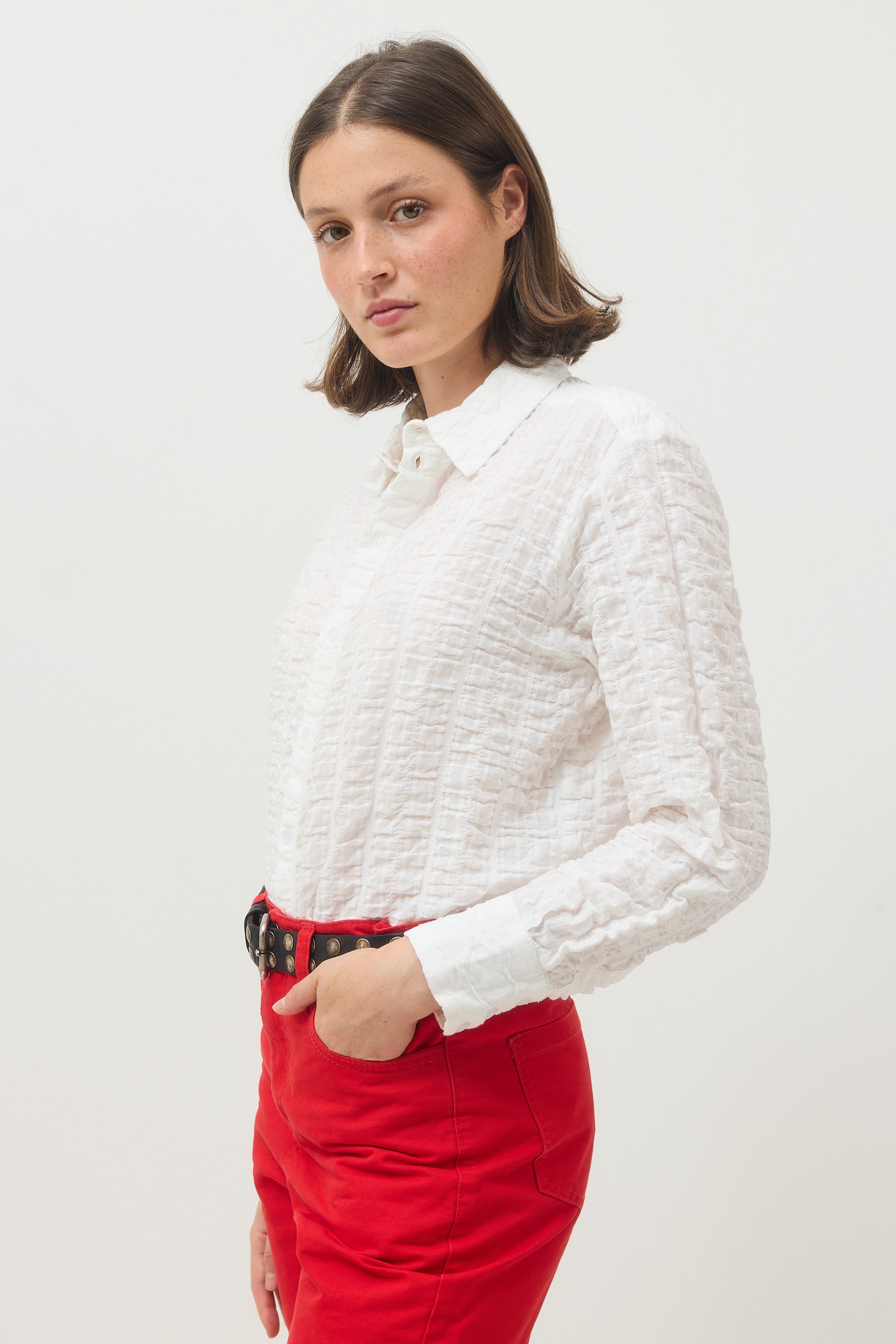 White button-up shirt with long sleeves, woven cotton fabric with texture, straight fit, classic collar, and front button closure.
