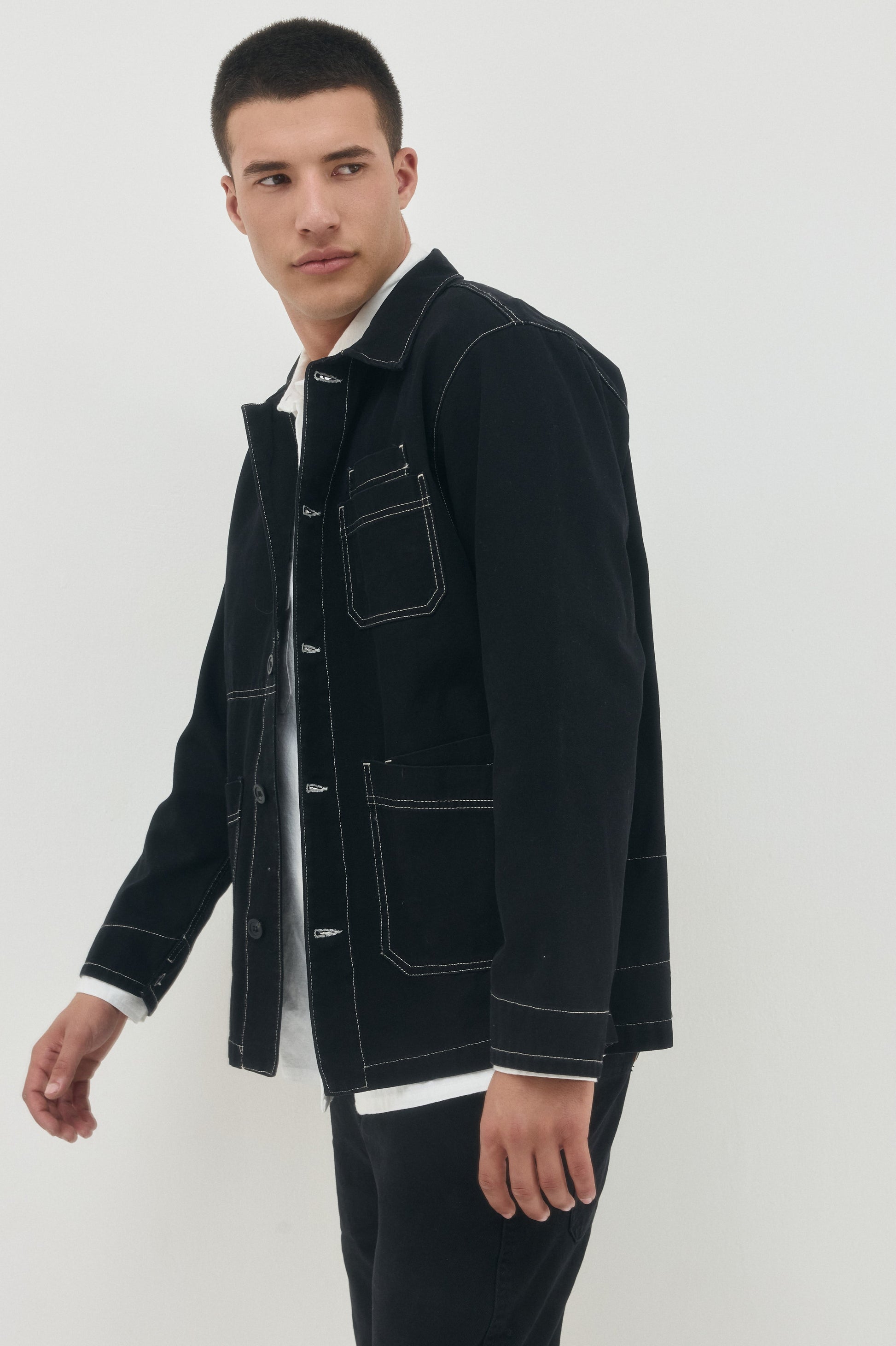 Durable work jacket made of cotton in a drill weave. Features four pockets: three external and one internal.