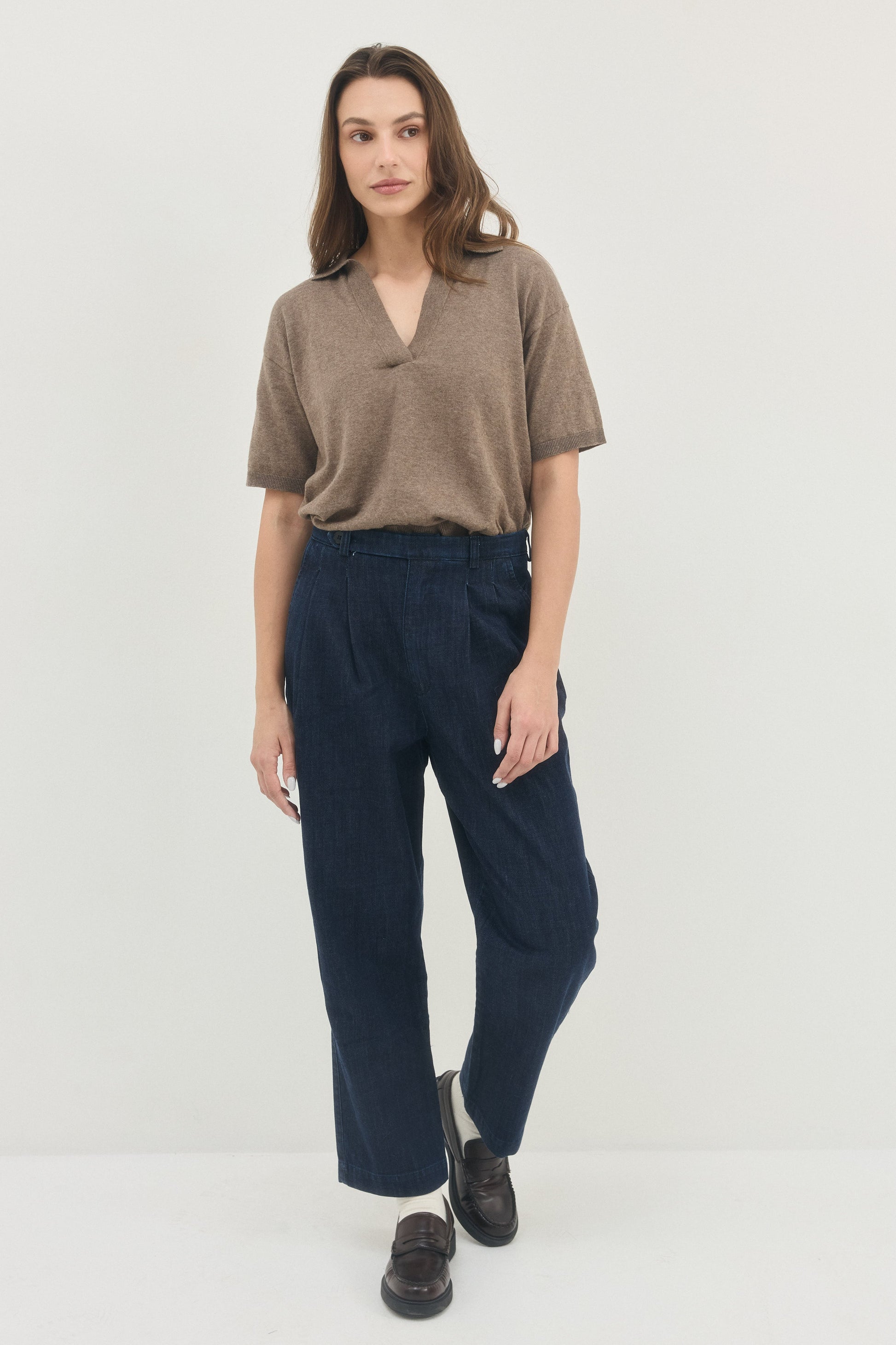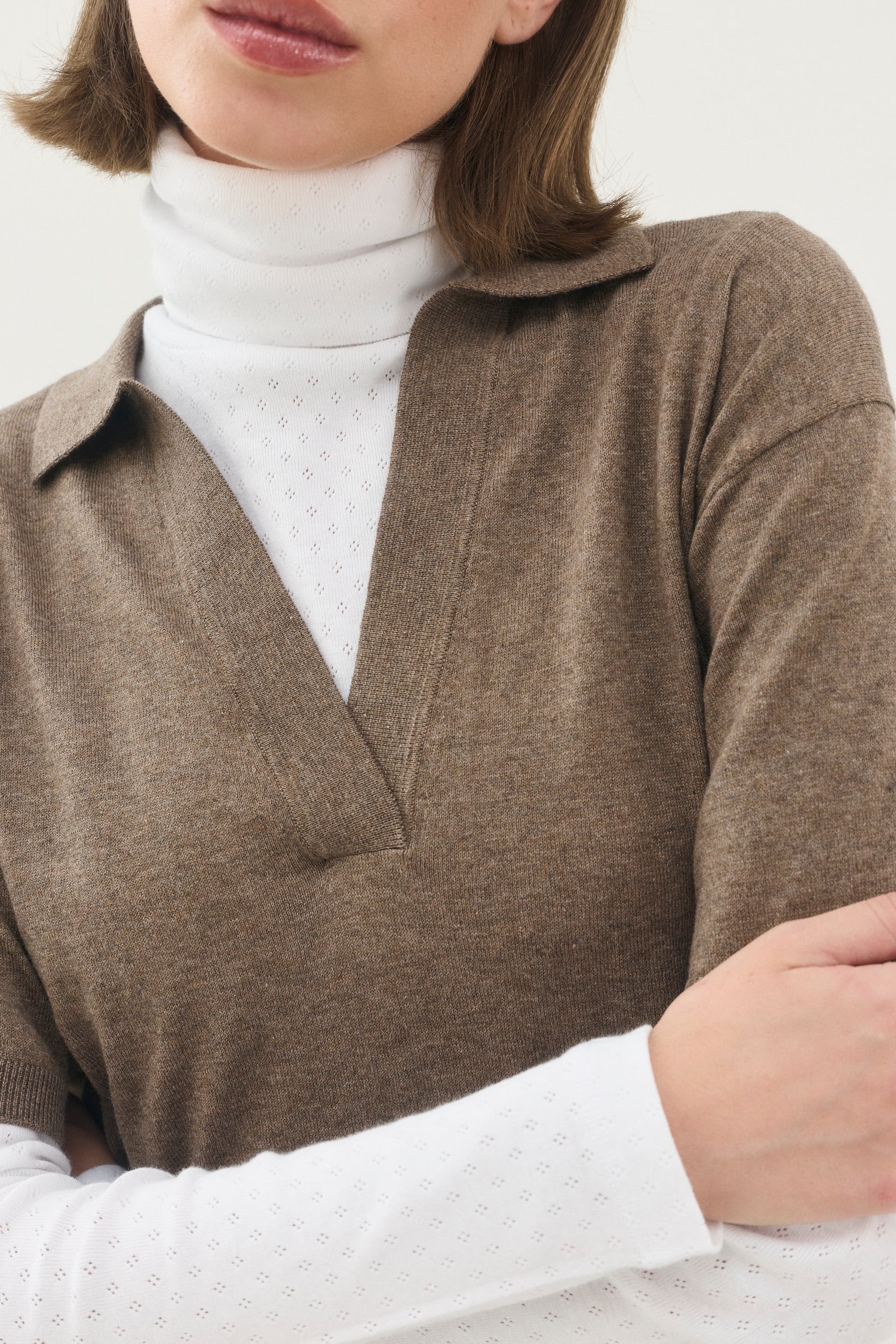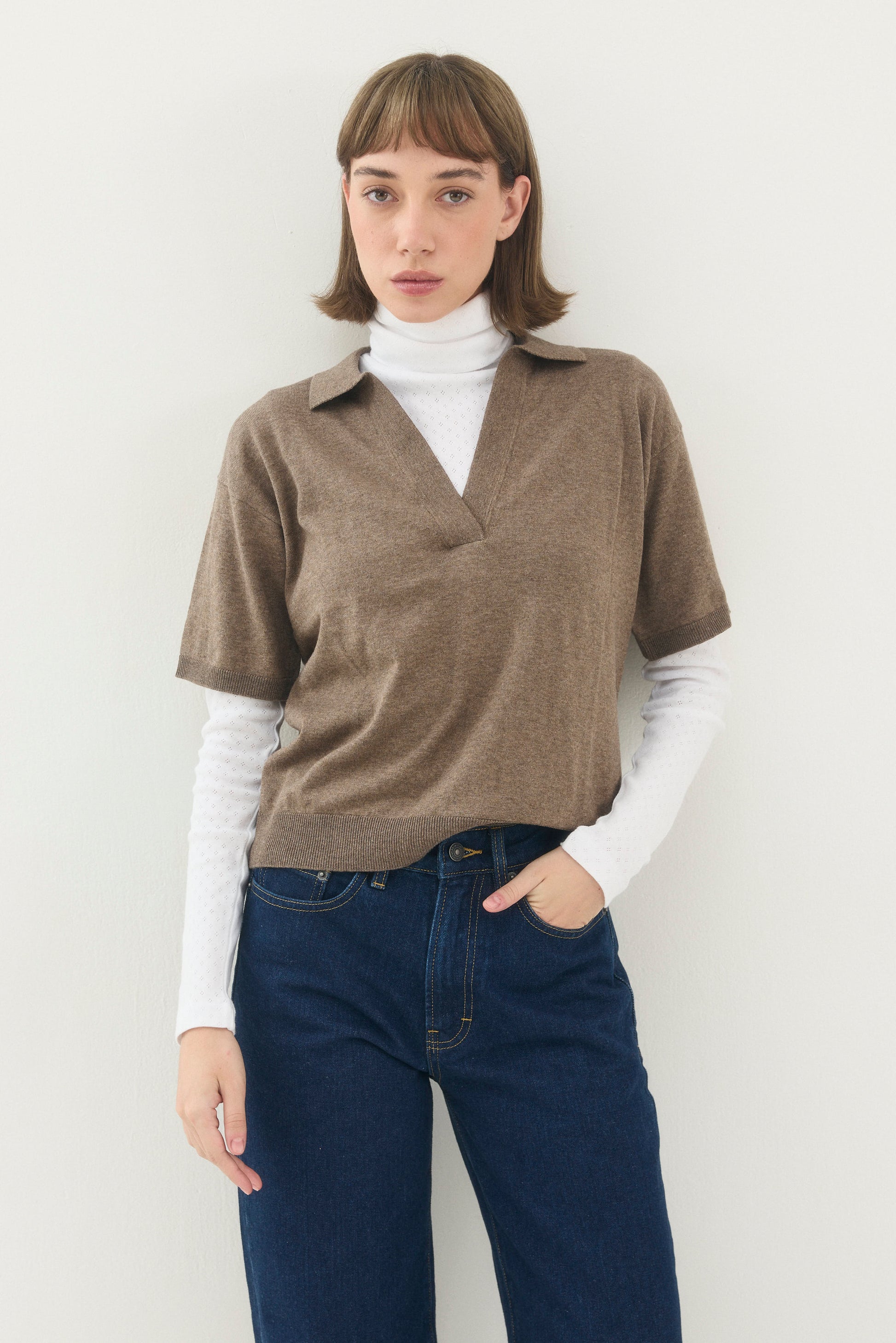 A knit top with elbow-length sleeves, a V-shaped neckline, and a collar.