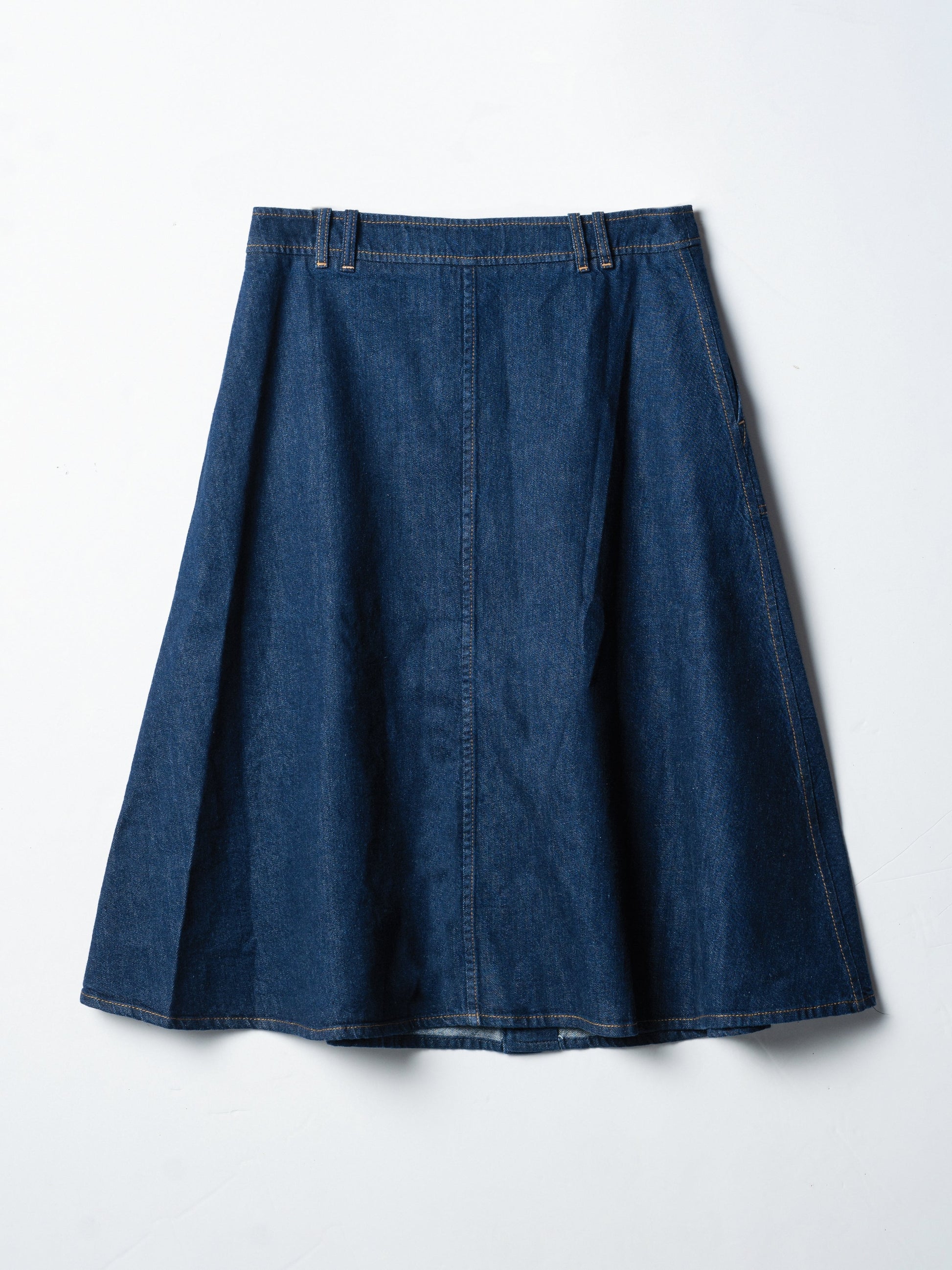 A flared bell-shaped skirt, buttoned along the front, with two prominent external pockets.