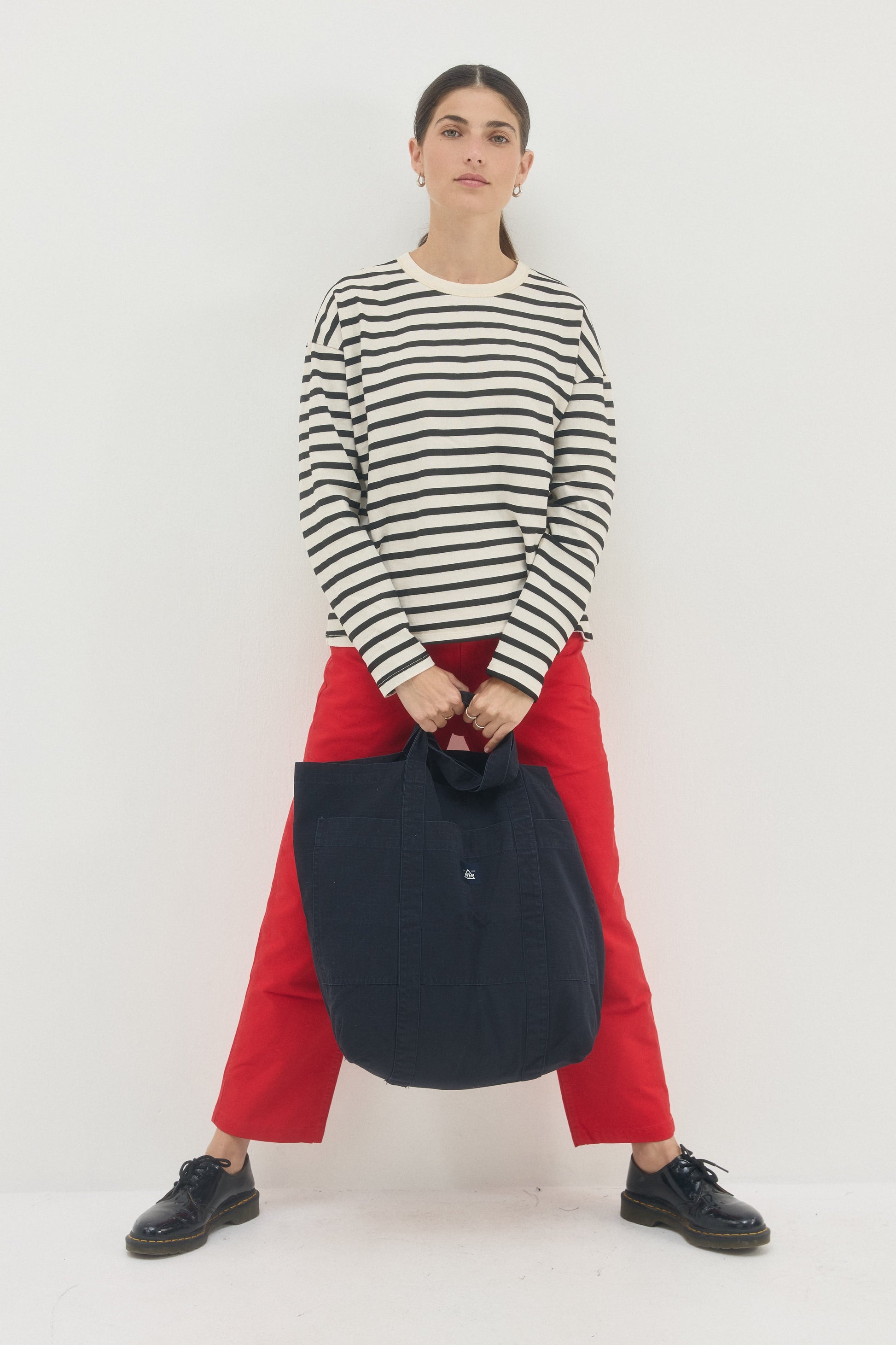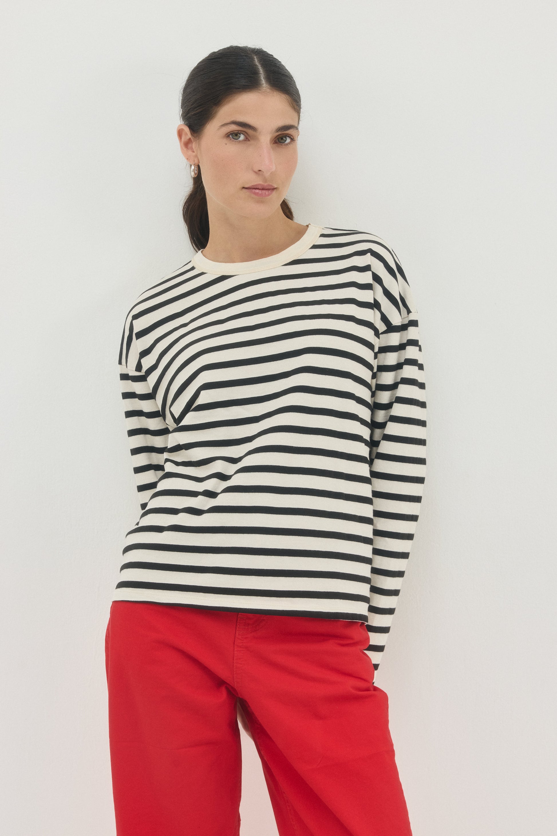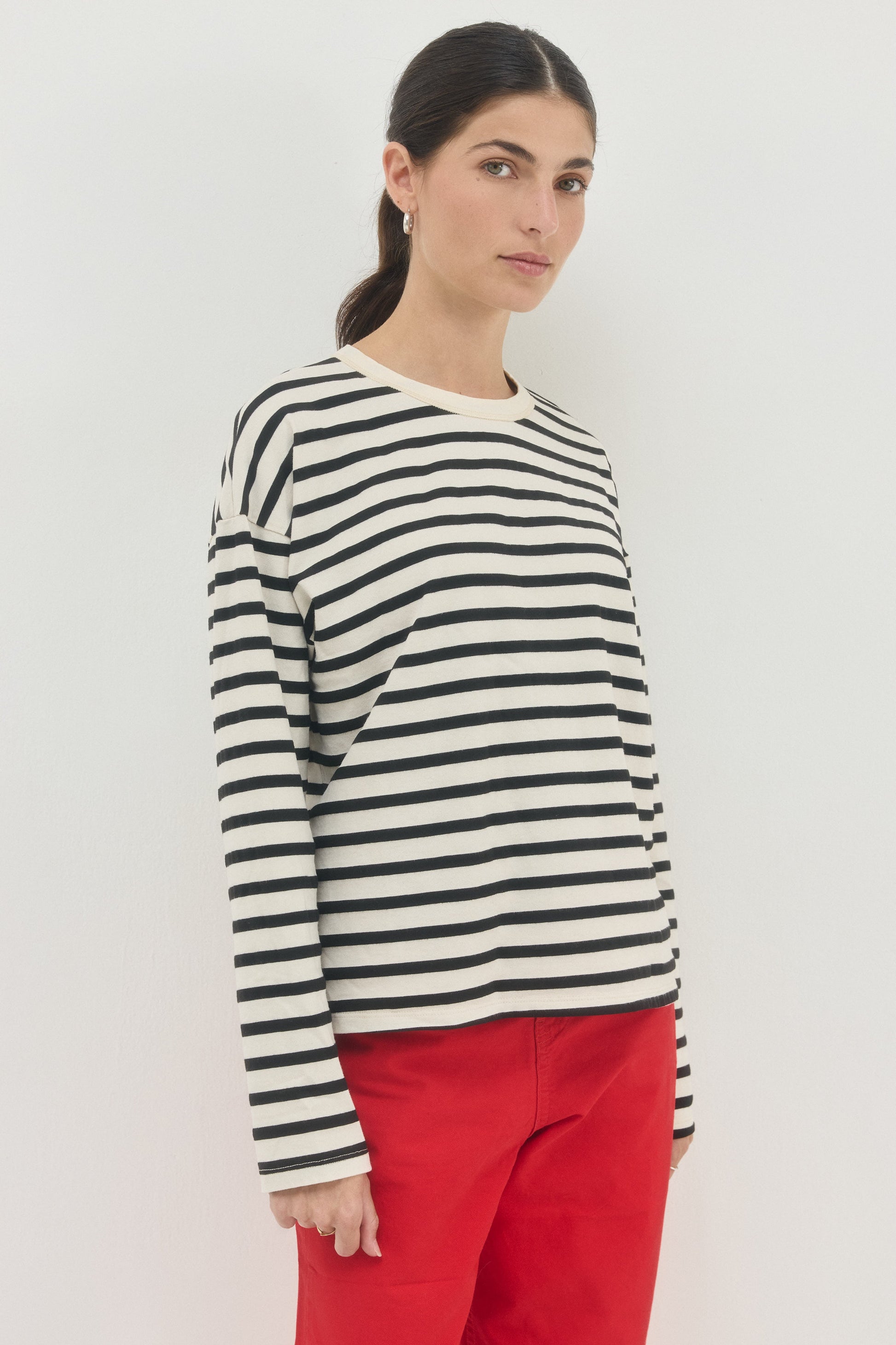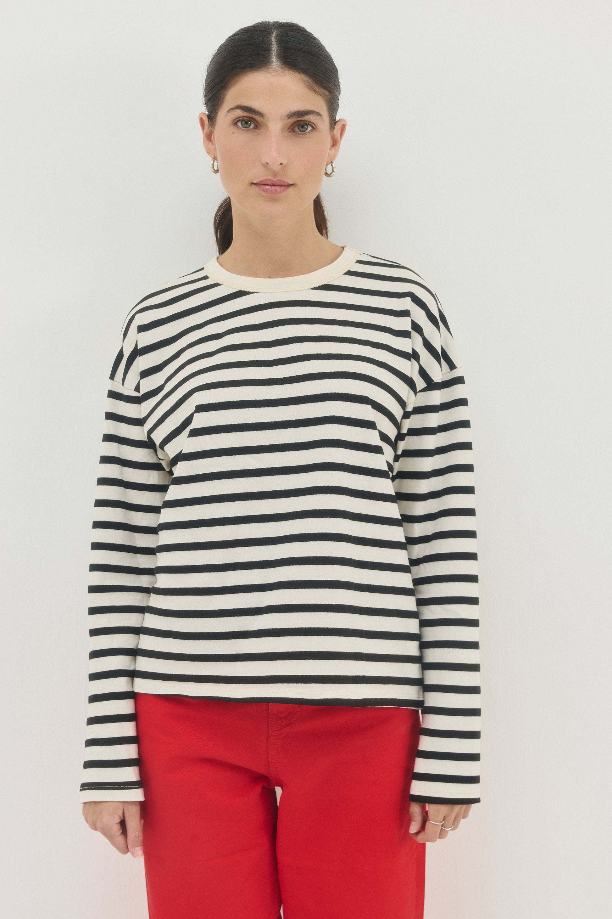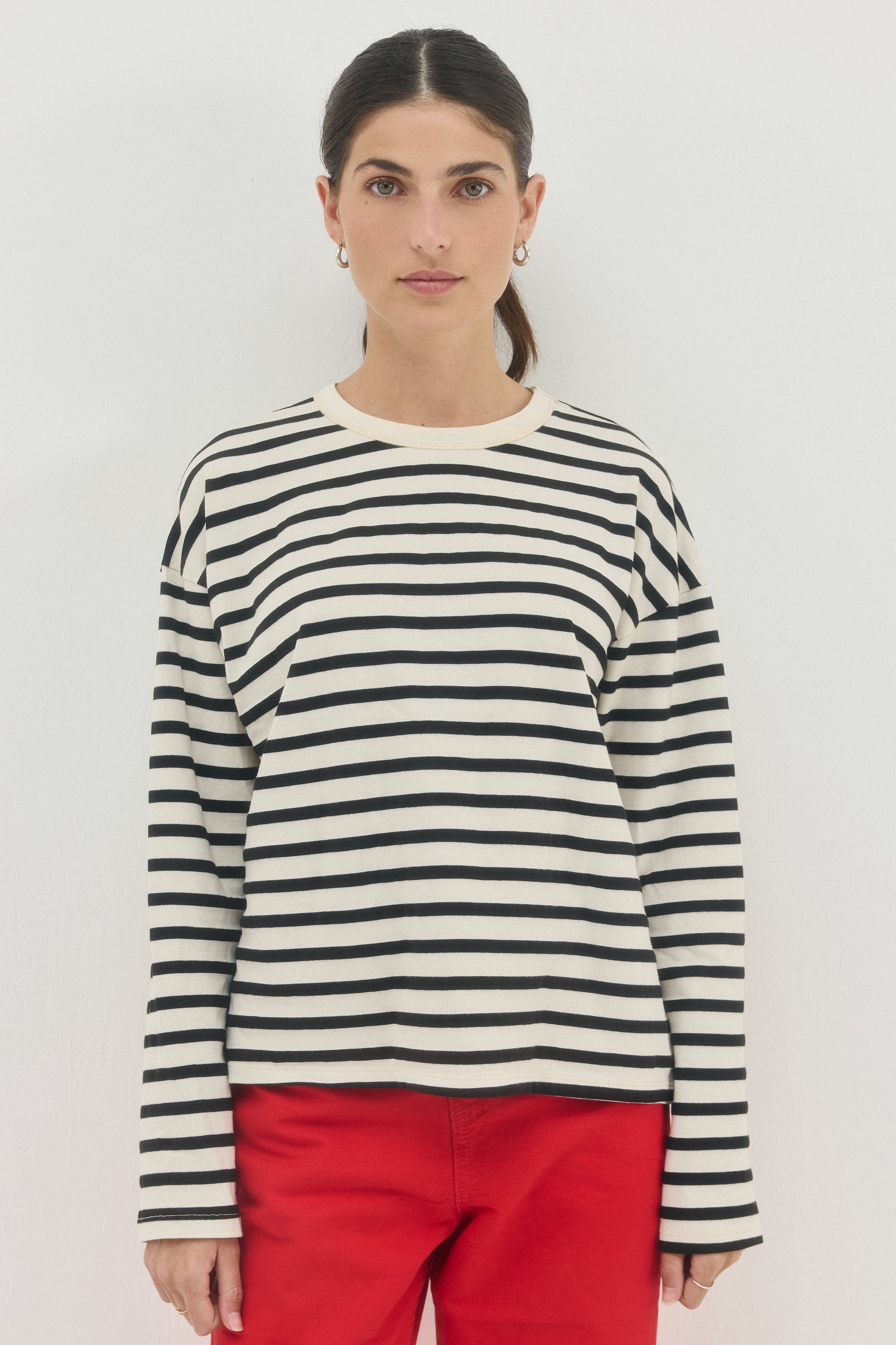 A classic striped top in new colorways, featuring a cropped silhouette, dropped shoulders, and a round neckline.