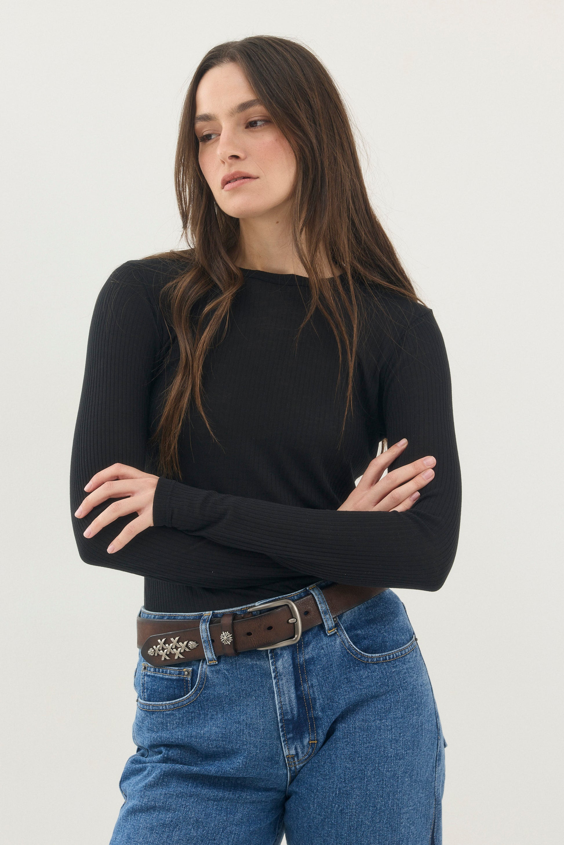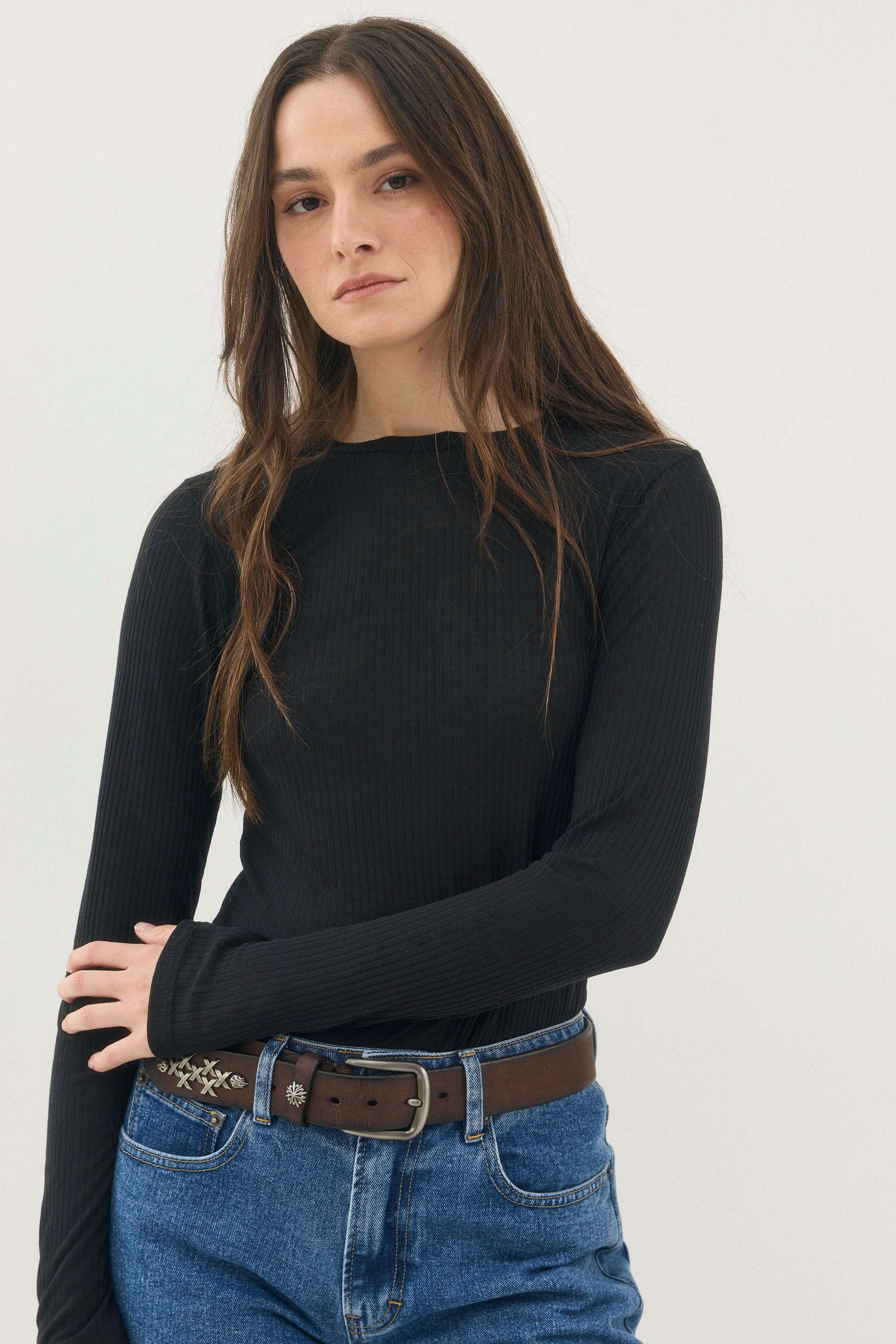 An easy essential with a soft ribbed texture, this long-sleeve tee features a classic crew neckline and a relaxed fit. Perfect for layering or wearing on its own, it’s a go-to for effortless style.