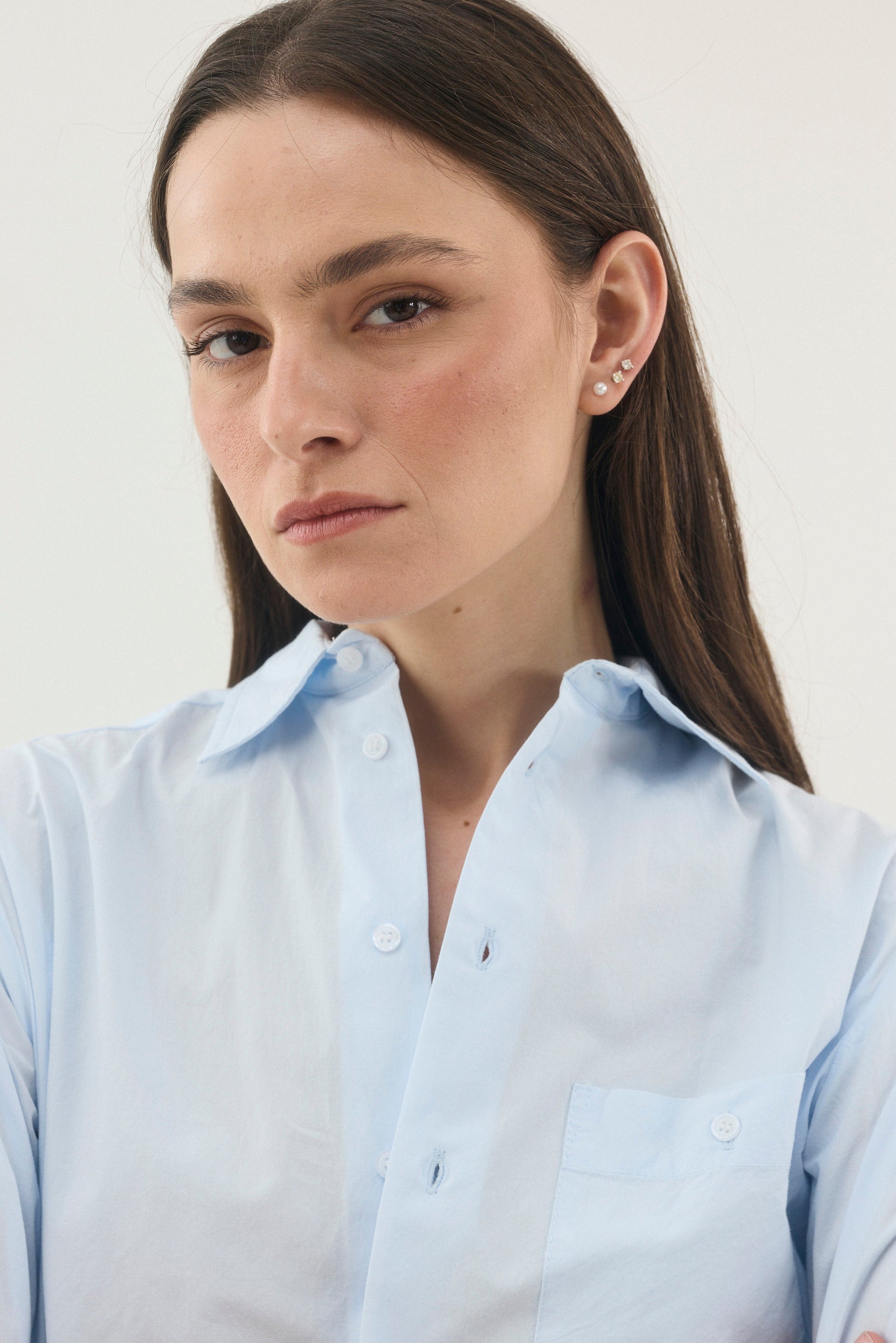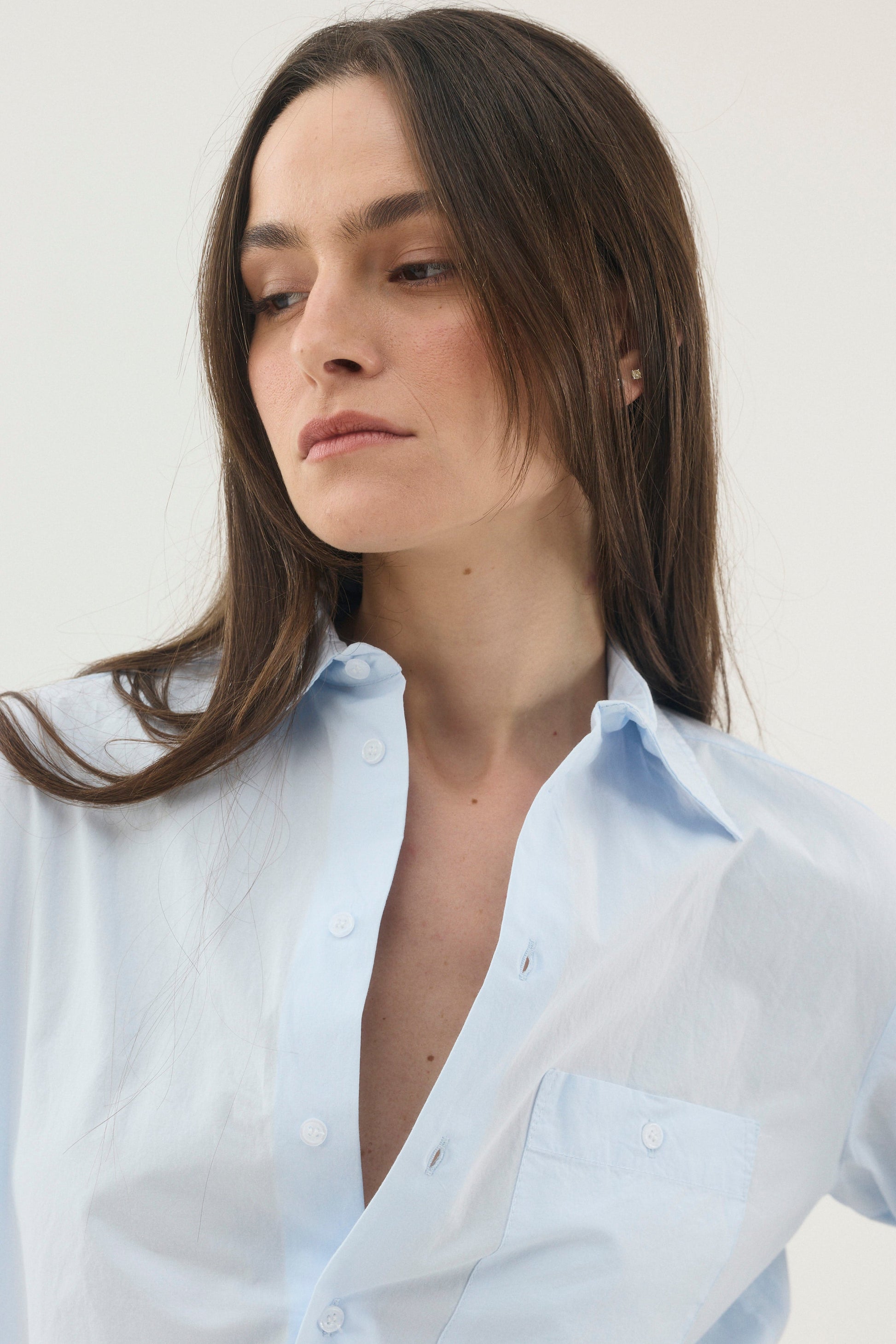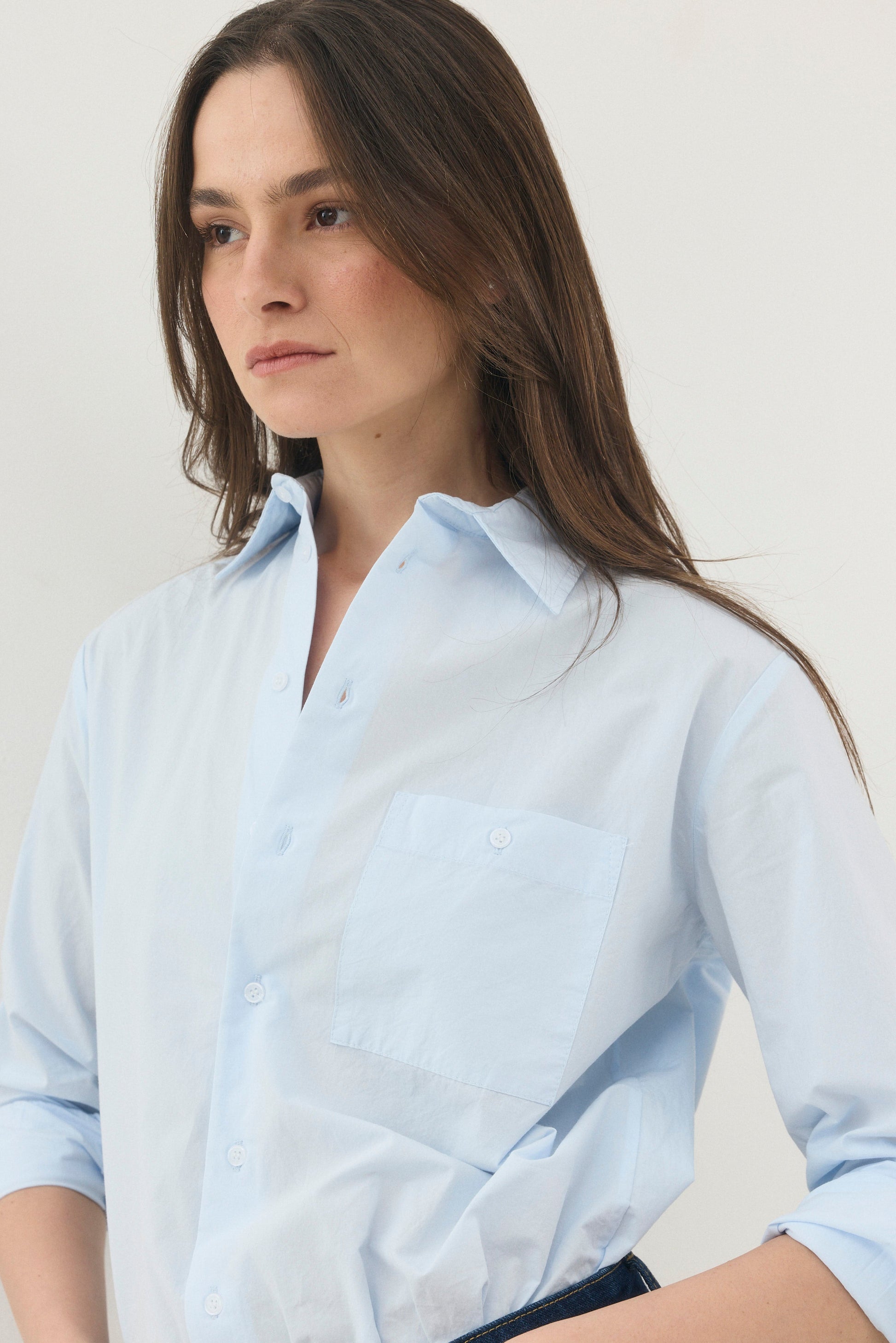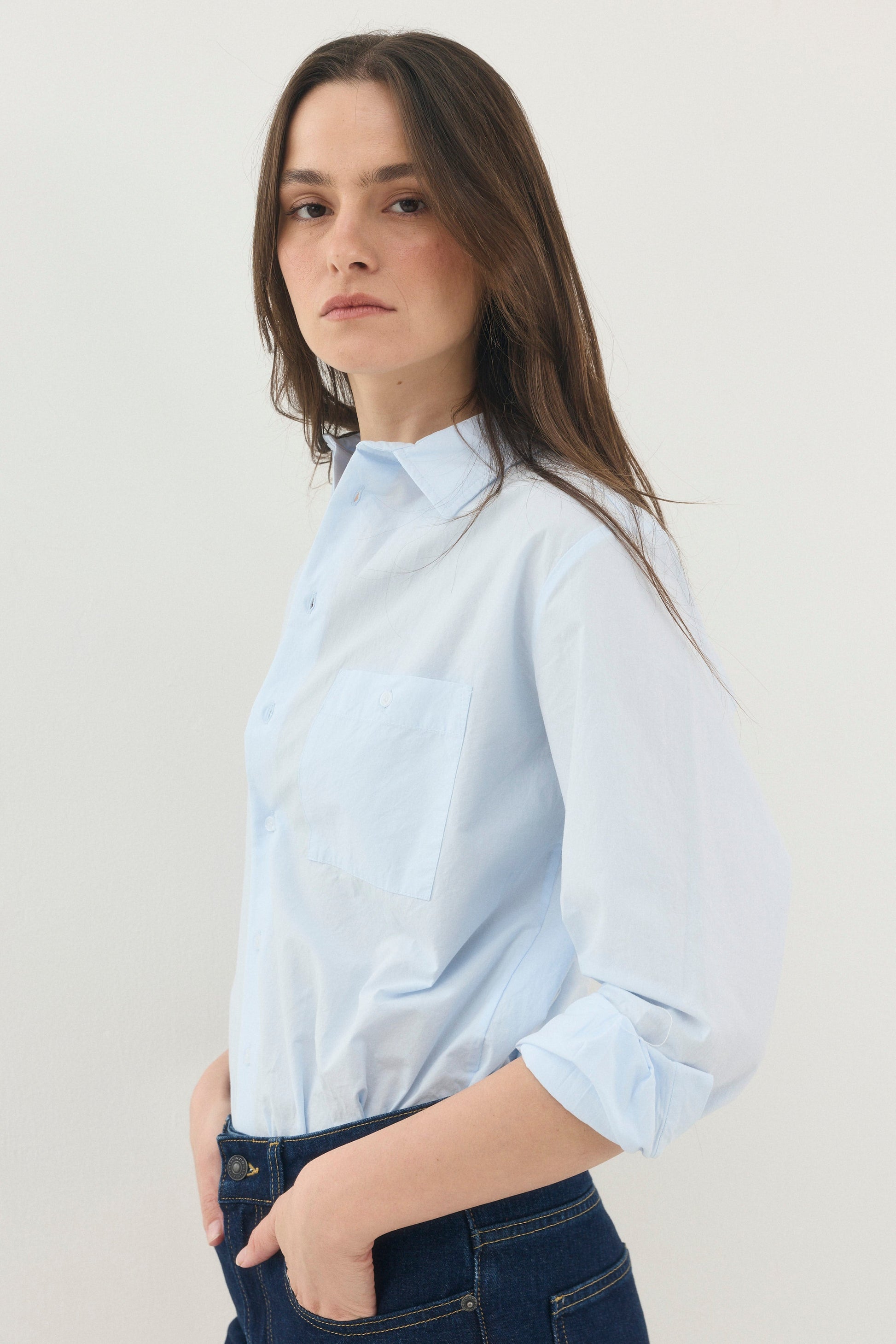 A relaxed-fit shirt made of crisp cotton with long sleeves. “Masculine collar” with a square pocket and front button closure.