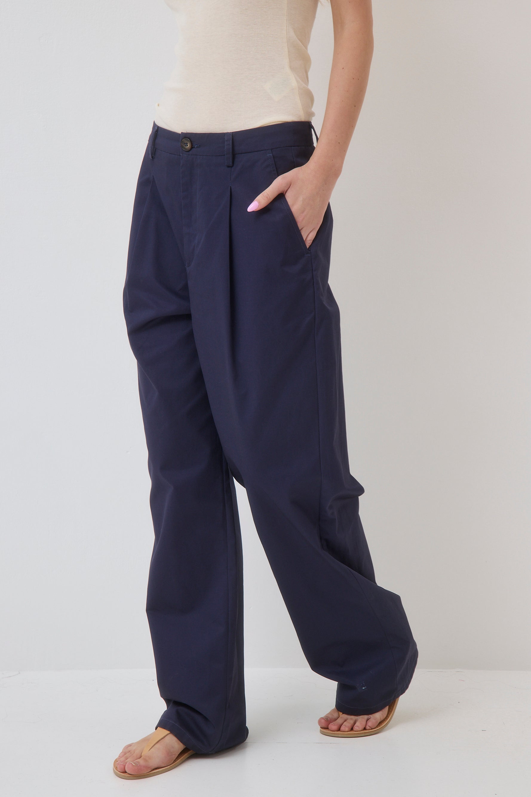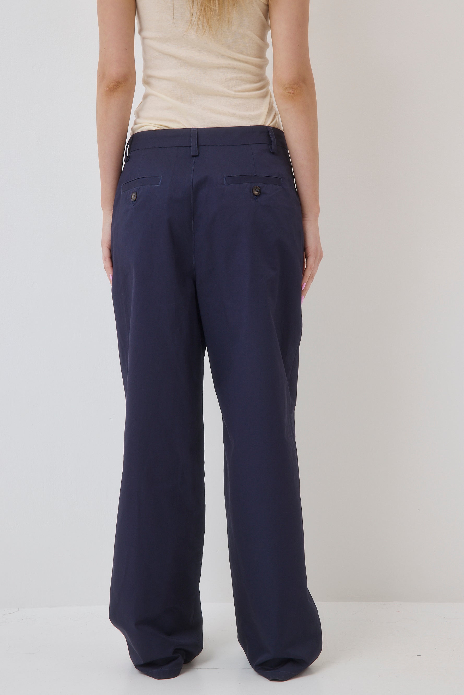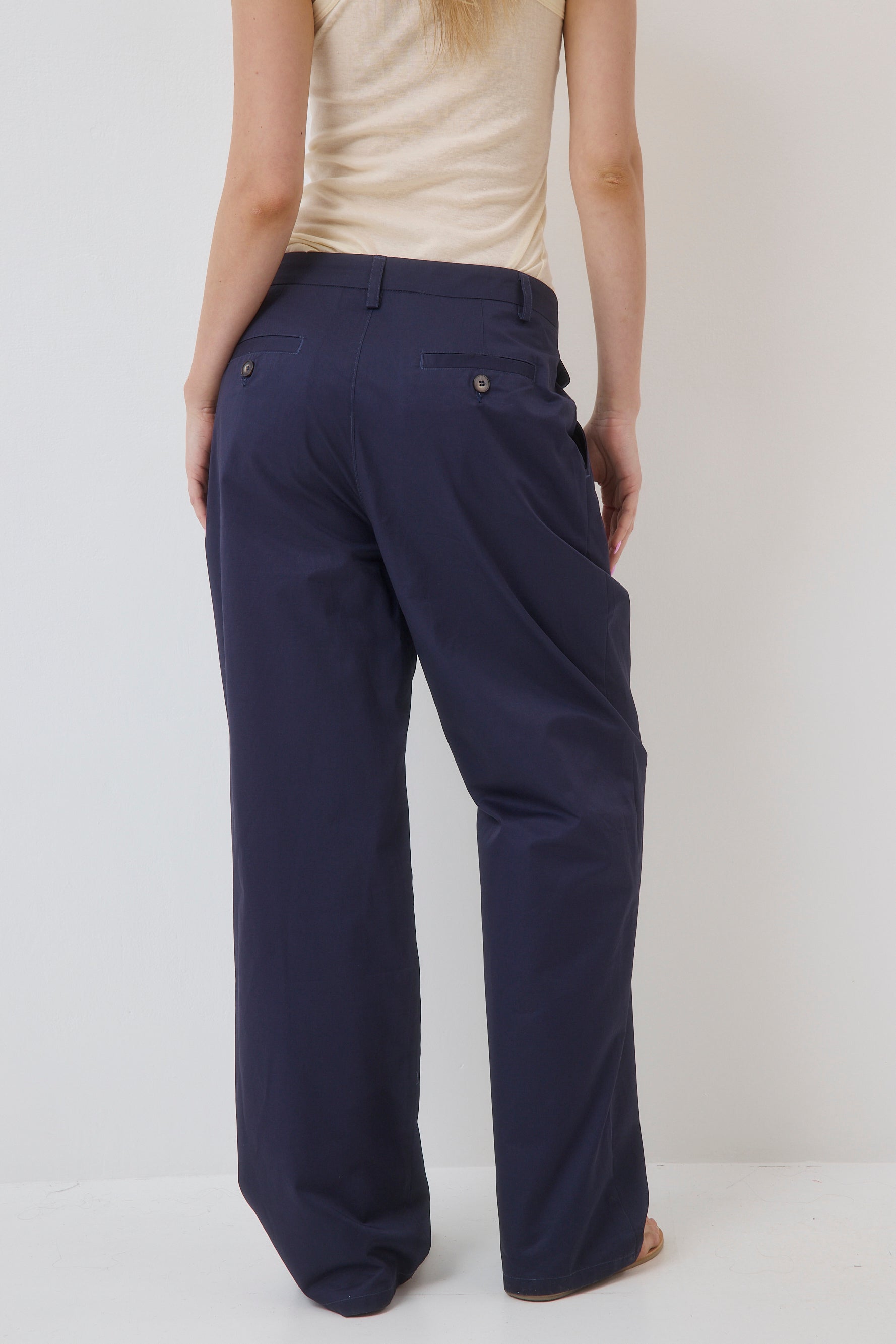 Ata's Tzipi Pants are long, wide pants with a high waist and two front pleats. They feature two side pockets and two buttoned welt pockets in the back. The waistband is slanted, with an external zipper, an outer button, and an inner button for a secure fit.